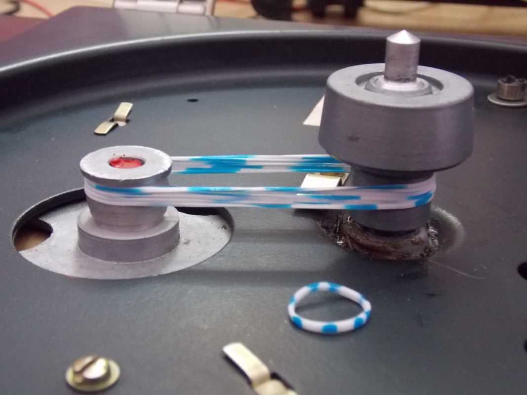 Сразу бросалось в глаза отсутствие головки звукоснимателя и пассика. При первом включении выяснилось, что двигатель ходит рывками, но как потом выяснилось такова особенность этого тихоходного двигателя.Проблема с пассиком решилась довольно быстро. Немного почитав форумы остановился на том что имеется в доме, а именно на детских резинках для плетения, благо есть дочь которая этим занимается.