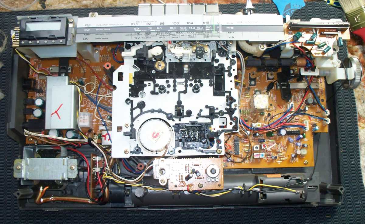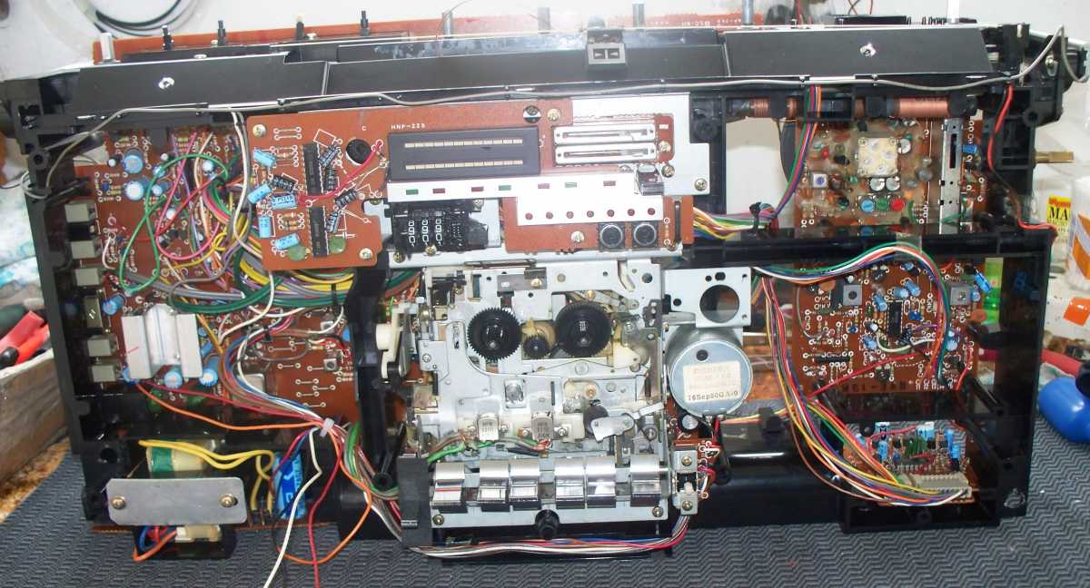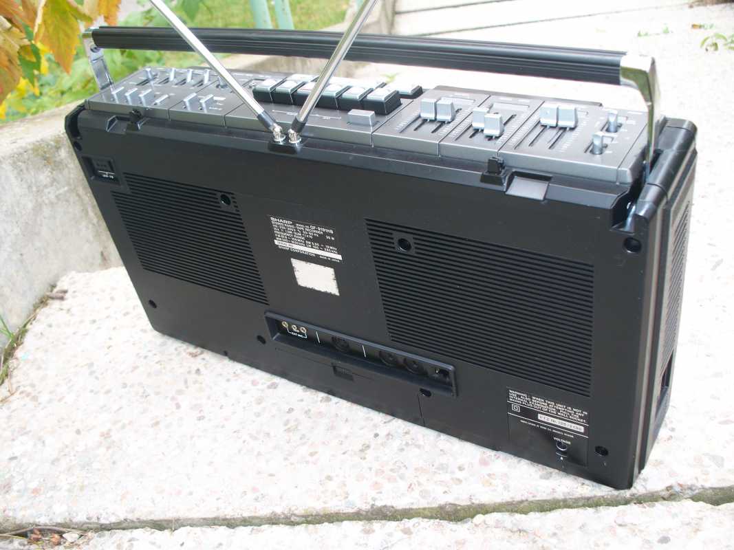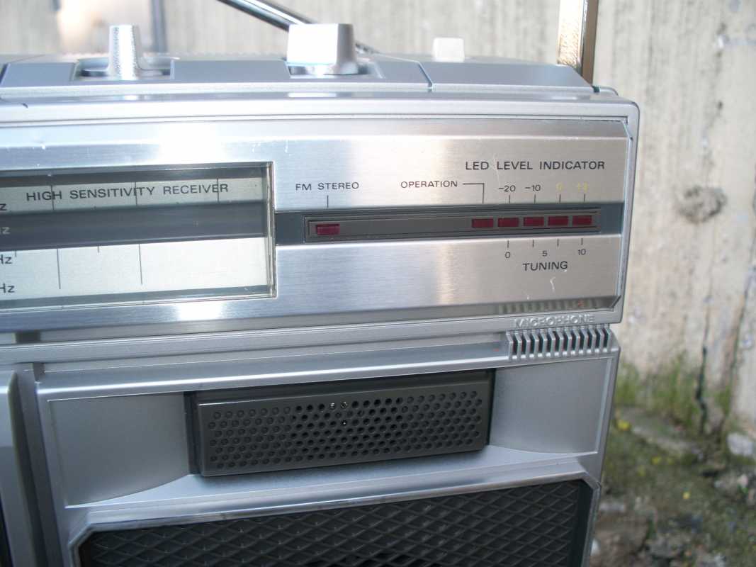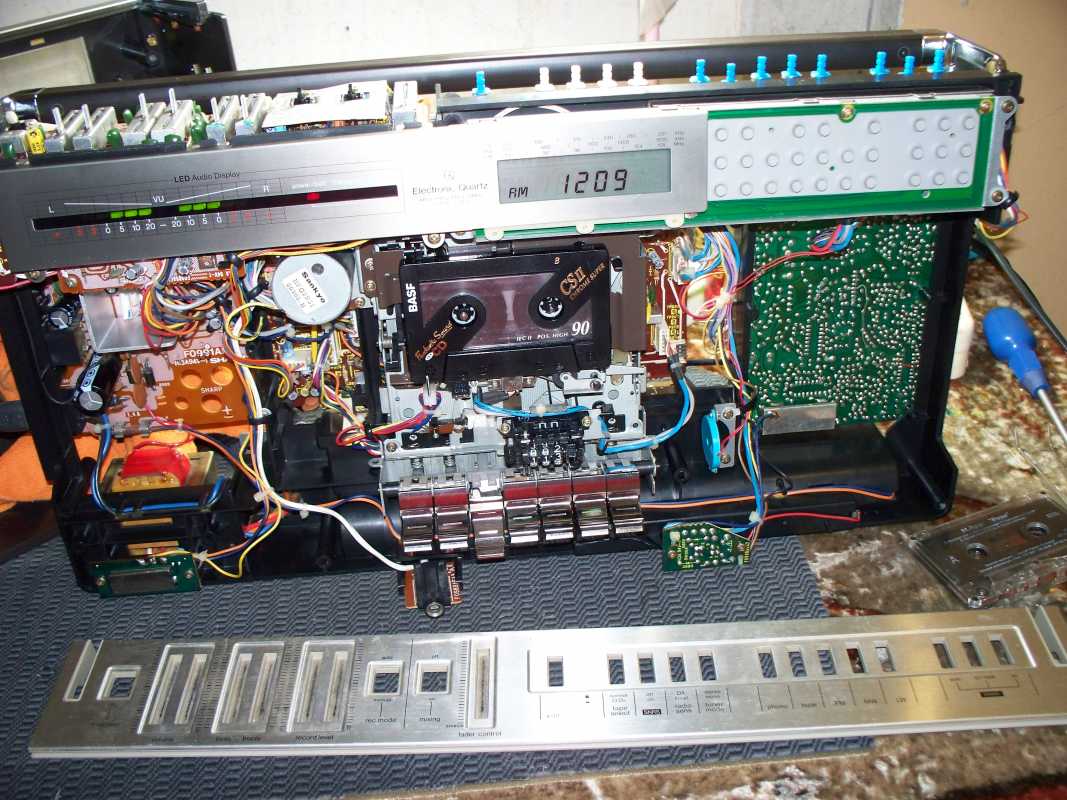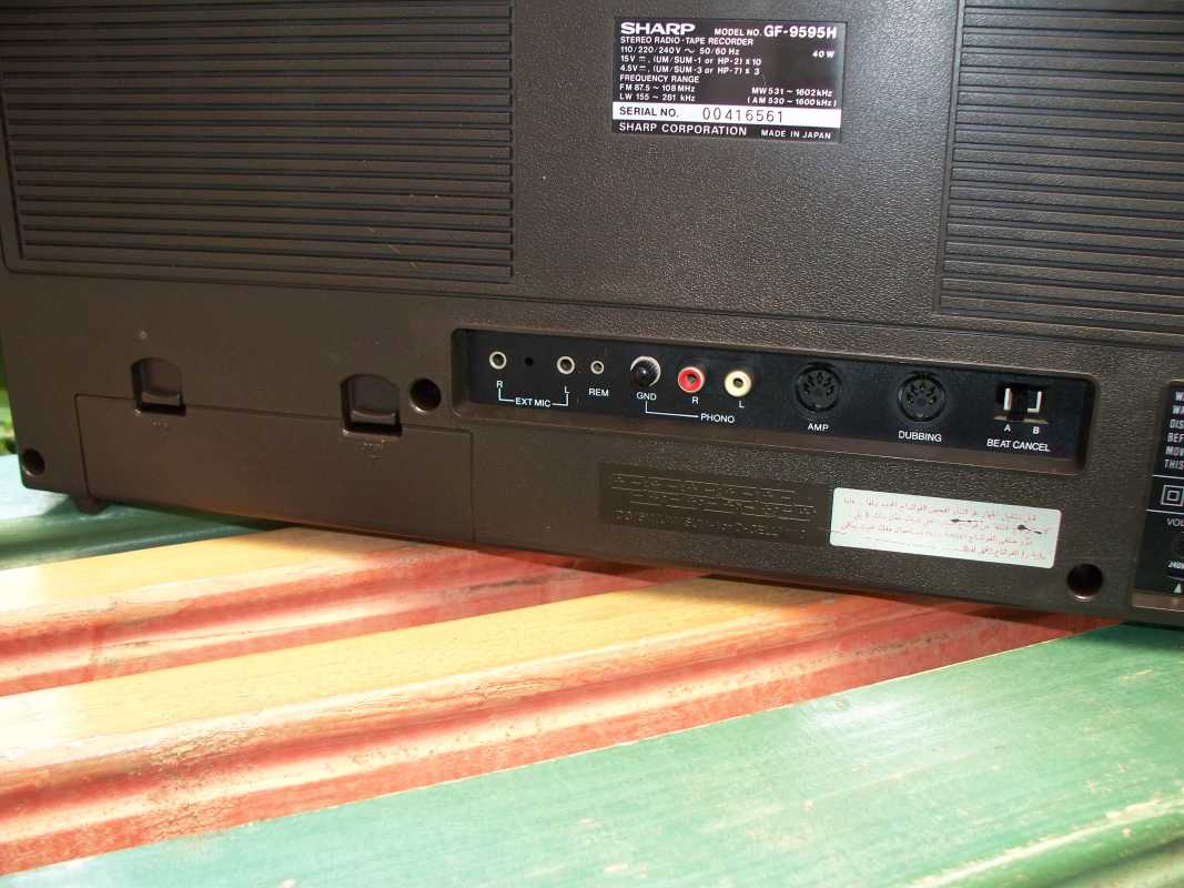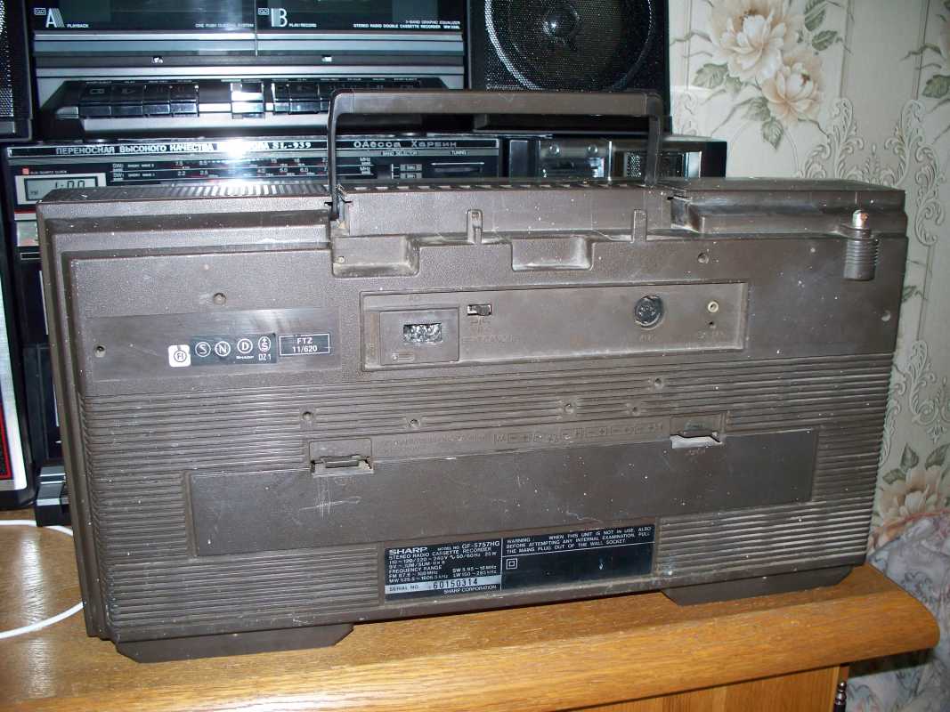 Компания Sharp всегда славилась своими неординарными разработками, вот и данная модель аппарата была в первых радах. Первый эксперимент с цифровым тюнером, Sharp делает смелые шаги не случайно, жидкие кристаллы это его научный конёк, к 70-ых годам уже вышли коммерческие образцы калькуляторов на жидких кристаллах. Sharp GF-9595 H, вот какой интересный аппарат на этот раз попал в мои руки. При покупке данной магнитолы, был определённый рыск купить ни кому не нужный ящик. А дело в том, что в объявлении было указано, что приёмник не запускается, а на всевозможных форумах пишут, что в случаи поломки, отремонтировать его практически не возможно. Я рискнул, правда пришлось потом немного понервничать, но об этом позже. Когда смотришь на эту магнитолу, вспонимаешь, весь смысл слов, «умели же люди делать». Досталась он мне в отличной косметике, как и все с детскими болячками, но ничего страшного, оживим. В плане разбора, всё просто, на мой взгляд. Выкручиваются винты, снимается задняя крышка. На ней кроме антенн, ничего больше нету, хотя нет, ещё установлен защитный экран. Затем снимается верхняя накладка с надписями, и вынимаем всю начинку на каркасе, из передней части корпуса, он абсолютно ни как не крепится, а просто одевается на направляющие для винтов. А вот на передней части уже кое что имеется, а именно блок кнопок управления радио и системой APLD, она здесь на 9 треков, и работает только при установленных батарейках. Пришлось его разобрать, что бы почистить все хромированные кнопочки. Ну и конечно же динамики. Они здесь на 16 см. Вот они мне понравились, очень добротное исполнение, диффузоры серого цвета, с белоснежными тканевыми куполами. Магниты П образной формы. Существует мнение, что динамики с П образными магнитами играют на порядок лучше. Вч динамики пьеза-электрические, в корпусе. Рядом установлены микрофоны. Ну а сейчас переходим к электронной составляющей, всё смонтировано на каркасе, в плане ремонта всё удобно, всё доступно со всех сторон. В глаза бросается огромное количество комплектации от Sanyo, особенно микросхем. Платы, от больших до маленьких, провода, пайка, разъёмы, всё здесь присутствует, как говориться в полном обьёме. Трансформатор хоть он и не больших размеров, но не в размере дело, со своей задачей справляется на все сто. Способен работать в тремя видами напряжения. Так как приёмник в этой модели цифровой, на нём хотелось остановится немного подробнее. Как уже было сказано выше, при проверке магнитолы, пришлось немного понервничать, а всё дело в том, что радио в этом аппарате работает только при установленных трёх пальчиковых батарейках, и когда я ух установил, запускаться оно отказалось, но почистив контакты батареек, всё заработало, и я вздохнул с облегчением.Вот фото отсека для батареек приёмника. Вот собственно и сама плата приёмника, привычный всем КПЕ отсутствует, ну конечно, ведь радио цифровое. Вся информация отображается на дисплее, в выключенном состоянии на нём работаю часы. Настроить их с первого раза было не просто, в смысле намудрили с комбинацией кнопок. Станций в память аппарат можно занести всего лишь пять , маловато, но на те времена, это было круто. А вот эта штучка имеет прямое отношение к настройке часов. Сразу и не разобрал, что это такое, но потом понял, это пьеза динамик. Слишком долго описывать какое именно, но нажав н