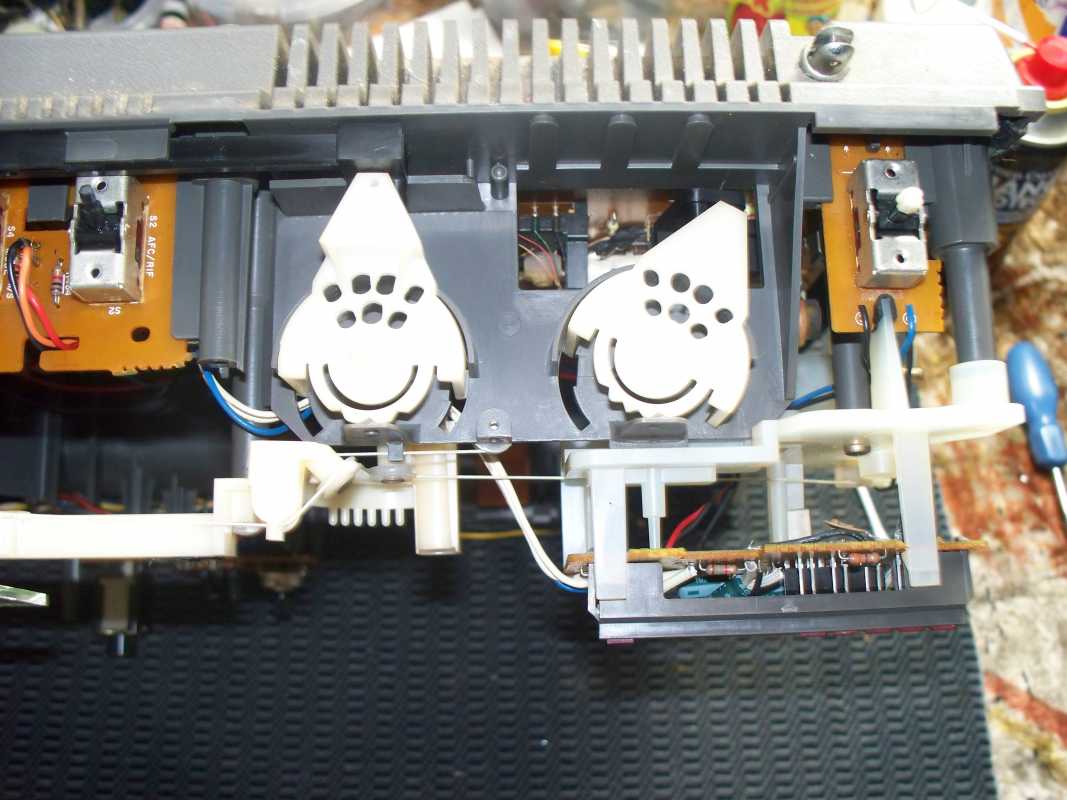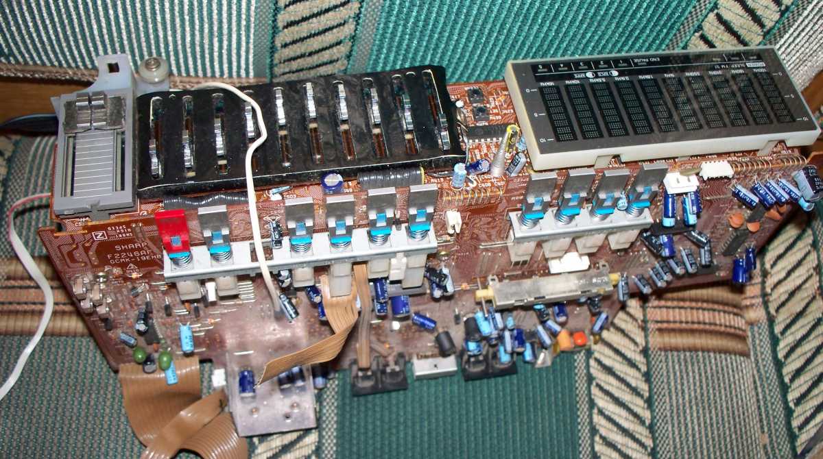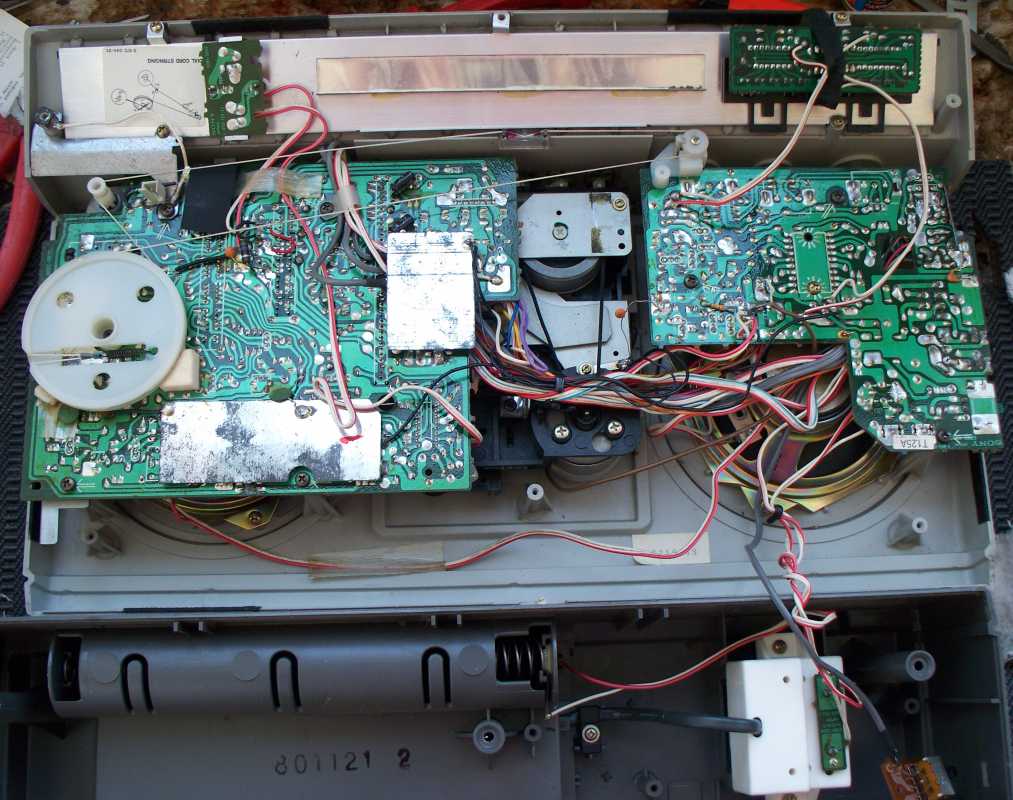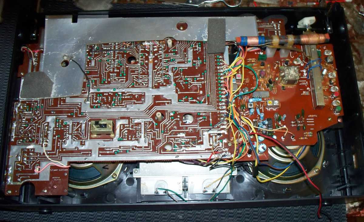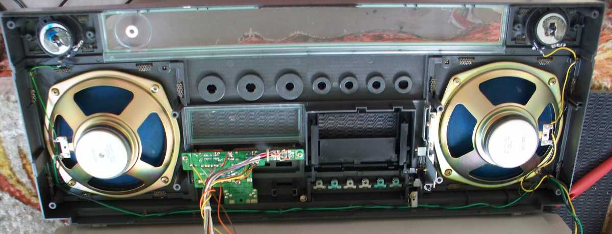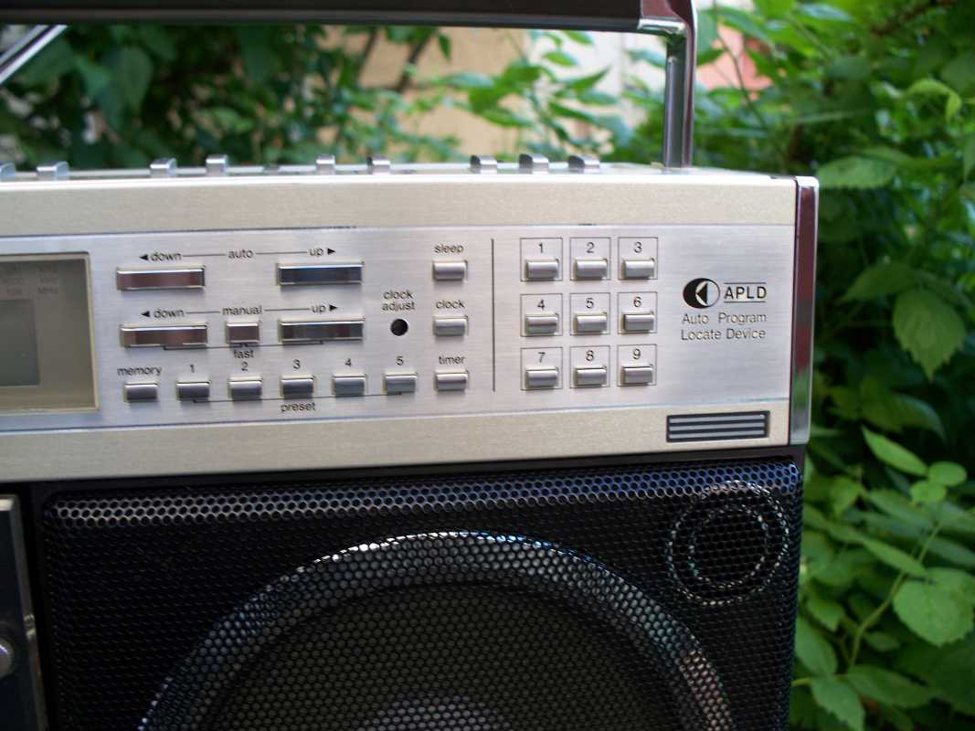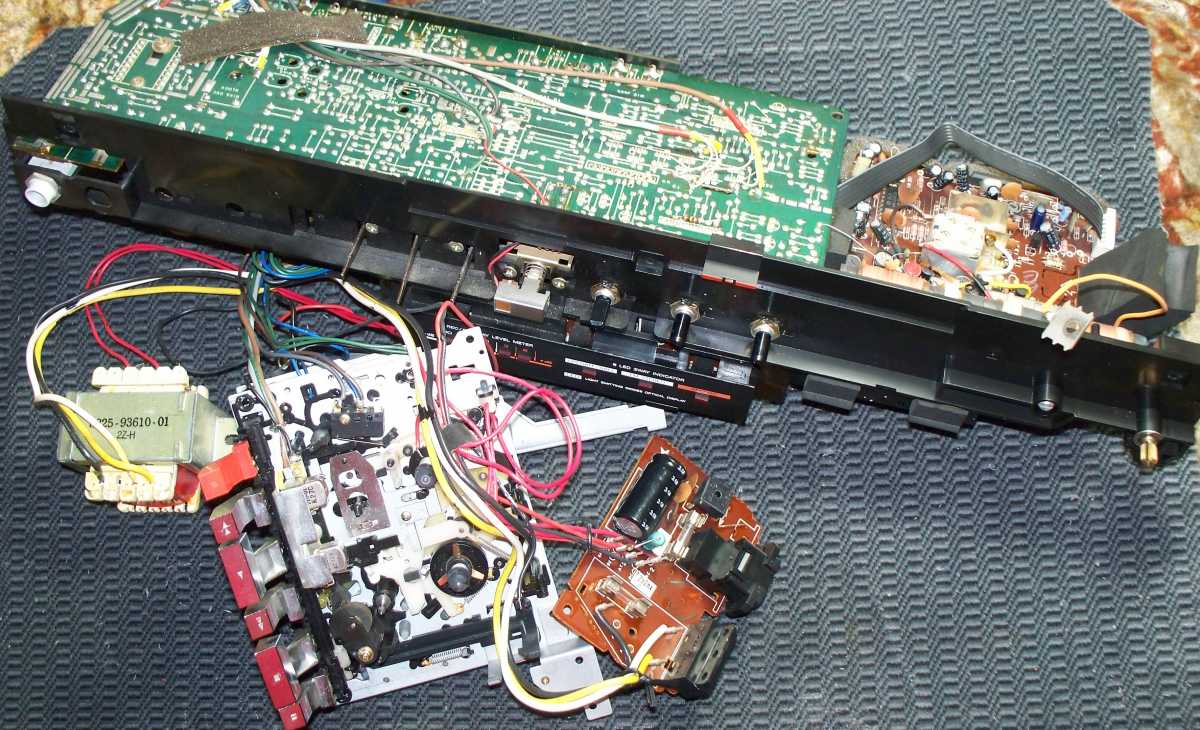Компания Sharp всегда славилась своими неординарными разработками, вот и данная модель аппарата была в первых радах. Первый эксперимент с цифровым тюнером, Sharp делает смелые шаги не случайно, жидкие кристаллы это его научный конёк, к 70-ых годам уже вышли коммерческие образцы калькуляторов на жидких кристаллах. Sharp GF-9595 H, вот какой интересный аппарат на этот раз попал в мои руки. При покупке данной магнитолы, был определённый рыск купить ни кому не нужный ящик. А дело в том, что в объявлении было указано, что приёмник не запускается, а на всевозможных форумах пишут, что в случаи поломки, отремонтировать его практически не возможно. Я рискнул, правда пришлось потом немного понервничать, но об этом позже. Когда смотришь на эту магнитолу, вспонимаешь, весь смысл слов, «умели же люди делать». Досталась он мне в отличной косметике, как и все с детскими болячками, но ничего страшного, оживим. В плане разбора, всё просто, на мой взгляд. Выкручиваются винты, снимается задняя крышка. На ней кроме антенн, ничего больше нету, хотя нет, ещё установлен защитный экран. Затем снимается верхняя накладка с надписями, и вынимаем всю начинку на каркасе, из передней части корпуса, он абсолютно ни как не крепится, а просто одевается на направляющие для винтов. А вот на передней части уже кое что имеется, а именно блок кнопок управления радио и системой APLD, она здесь на 9 треков, и работает только при установленных батарейках. Пришлось его разобрать, что бы почистить все хромированные кнопочки. Ну и конечно же динамики. Они здесь на 16 см. Вот они мне понравились, очень добротное исполнение, диффузоры серого цвета, с белоснежными тканевыми куполами. Магниты П образной формы. Существует мнение, что динамики с П образными магнитами играют на порядок лучше. Вч динамики пьеза-электрические, в корпусе. Рядом установлены микрофоны. Ну а сейчас переходим к электронной составляющей, всё смонтировано на каркасе, в плане ремонта всё удобно, всё доступно со всех сторон. В глаза бросается огромное количество комплектации от Sanyo, особенно микросхем. Платы, от больших до маленьких, провода, пайка, разъёмы, всё здесь присутствует, как говориться в полном обьёме. Трансформатор хоть он и не больших размеров, но не в размере дело, со своей задачей справляется на все сто. Способен работать в тремя видами напряжения. Так как приёмник в этой модели цифровой, на нём хотелось остановится немного подробнее. Как уже было сказано выше, при проверке магнитолы, пришлось немного понервничать, а всё дело в том, что радио в этом аппарате работает только при установленных трёх пальчиковых батарейках, и когда я ух установил, запускаться оно отказалось, но почистив контакты батареек, всё заработало, и я вздохнул с облегчением.Вот фото отсека для батареек приёмника. Вот собственно и сама плата приёмника, привычный всем КПЕ отсутствует, ну конечно, ведь радио цифровое. Вся информация отображается на дисплее, в выключенном состоянии на нём работаю часы. Настроить их с первого раза было не просто, в смысле намудрили с комбинацией кнопок. Станций в память аппарат можно занести всего лишь пять , маловато, но на те времена, это было круто. А вот эта штучка имеет прямое отношение к настройке часов. Сразу и не разобрал, что это такое, но потом понял, это пьеза динамик. Слишком долго описывать какое именно, но нажав н