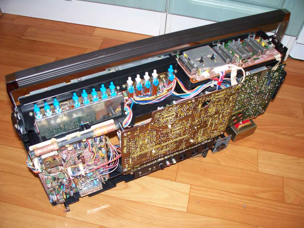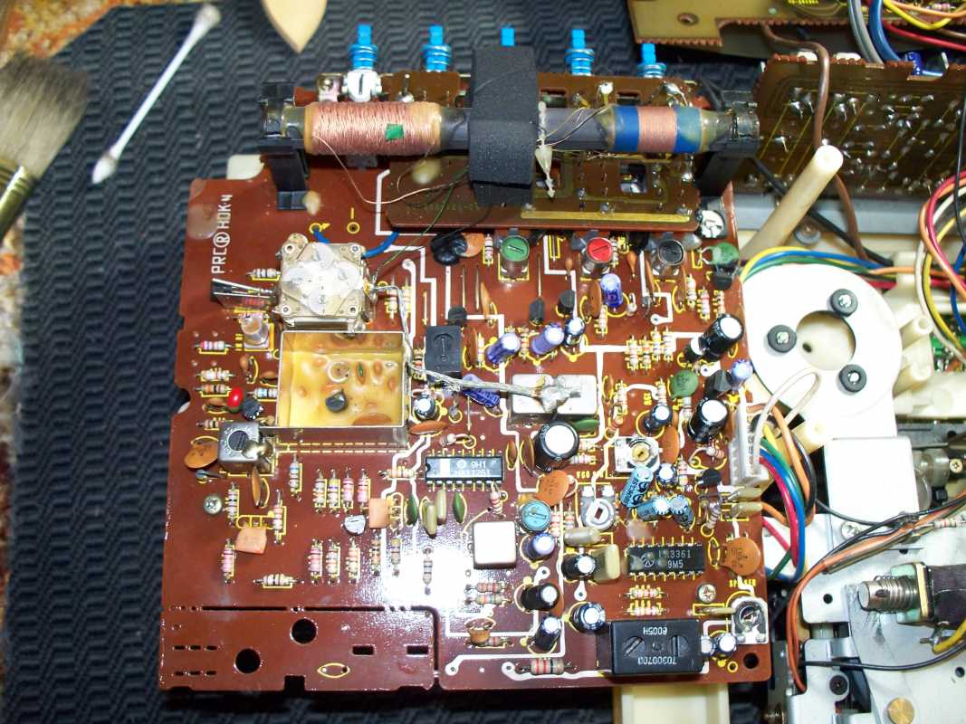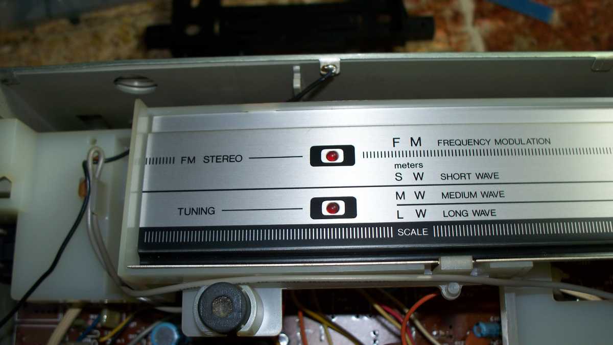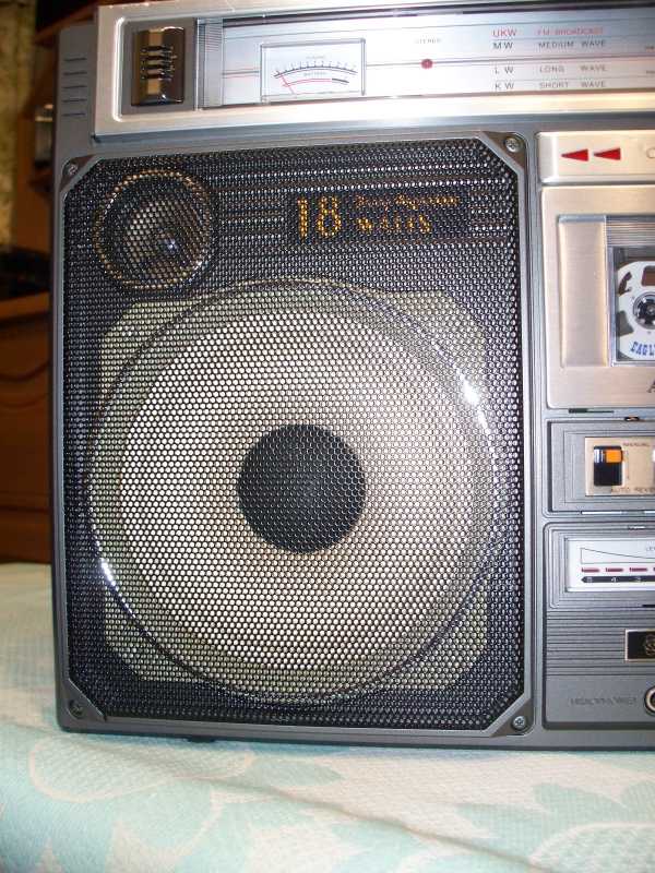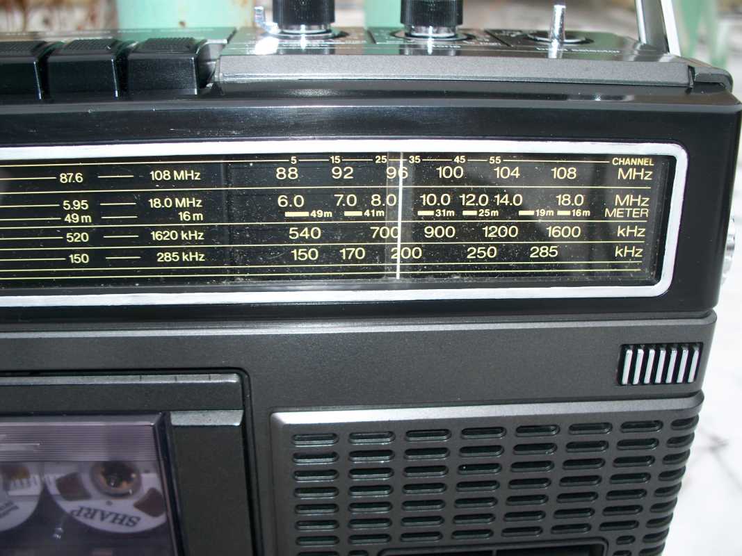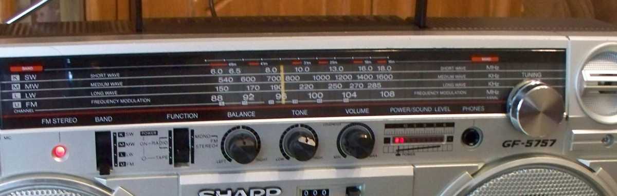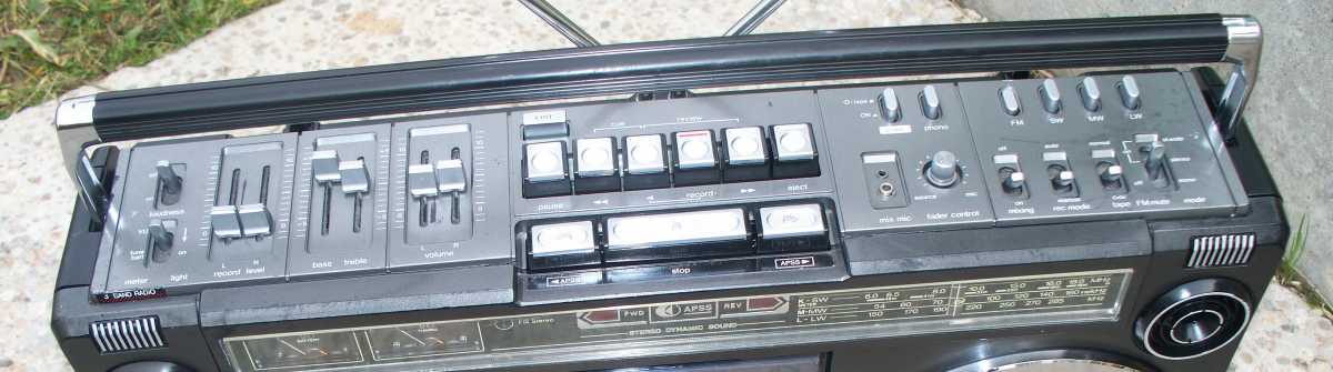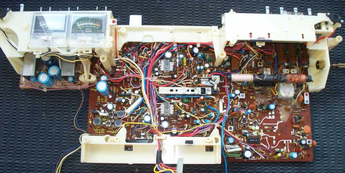 Компания Sharp всегда славилась своими неординарными разработками, вот и данная модель аппарата была в первых радах. Первый эксперимент с цифровым тюнером, Sharp делает смелые шаги не случайно, жидкие кристаллы это его научный конёк, к 70-ых годам уже вышли коммерческие образцы калькуляторов на жидких кристаллах. Sharp GF-9595 H, вот какой интересный аппарат на этот раз попал в мои руки. При покупке данной магнитолы, был определённый рыск купить ни кому не нужный ящик. А дело в том, что в объявлении было указано, что приёмник не запускается, а на всевозможных форумах пишут, что в случаи поломки, отремонтировать его практически не возможно. Я рискнул, правда пришлось потом немного понервничать, но об этом позже. Когда смотришь на эту магнитолу, вспонимаешь, весь смысл слов, «умели же люди делать». Досталась он мне в отличной косметике, как и все с детскими болячками, но ничего страшного, оживим. В плане разбора, всё просто, на мой взгляд. Выкручиваются винты, снимается задняя крышка. На ней кроме антенн, ничего больше нету, хотя нет, ещё установлен защитный экран. Затем снимается верхняя накладка с надписями, и вынимаем всю начинку на каркасе, из передней части корпуса, он абсолютно ни как не крепится, а просто одевается на направляющие для винтов. А вот на передней части уже кое что имеется, а именно блок кнопок управления радио и системой APLD, она здесь на 9 треков, и работает только при установленных батарейках. Пришлось его разобрать, что бы почистить все хромированные кнопочки. Ну и конечно же динамики. Они здесь на 16 см. Вот они мне понравились, очень добротное исполнение, диффузоры серого цвета, с белоснежными тканевыми куполами. Магниты П образной формы. Существует мнение, что динамики с П образными магнитами играют на порядок лучше. Вч динамики пьеза-электрические, в корпусе. Рядом установлены микрофоны. Ну а сейчас переходим к электронной составляющей, всё смонтировано на каркасе, в плане ремонта всё удобно, всё доступно со всех сторон. В глаза бросается огромное количество комплектации от Sanyo, особенно микросхем. Платы, от больших до маленьких, провода, пайка, разъёмы, всё здесь присутствует, как говориться в полном обьёме. Трансформатор хоть он и не больших размеров, но не в размере дело, со своей задачей справляется на все сто. Способен работать в тремя видами напряжения. Так как приёмник в этой модели цифровой, на нём хотелось остановится немного подробнее. Как уже было сказано выше, при проверке магнитолы, пришлось немного понервничать, а всё дело в том, что радио в этом аппарате работает только при установленных трёх пальчиковых батарейках, и когда я ух установил, запускаться оно отказалось, но почистив контакты батареек, всё заработало, и я вздохнул с облегчением.Вот фото отсека для батареек приёмника. Вот собственно и сама плата приёмника, привычный всем КПЕ отсутствует, ну конечно, ведь радио цифровое. Вся информация отображается на дисплее, в выключенном состоянии на нём работаю часы. Настроить их с первого раза было не просто, в смысле намудрили с комбинацией кнопок. Станций в память аппарат можно занести всего лишь пять , маловато, но на те времена, это было круто. А вот эта штучка имеет прямое отношение к настройке часов. Сразу и не разобрал, что это такое, но потом понял, это пьеза динамик. Слишком долго описывать какое именно, но нажав н