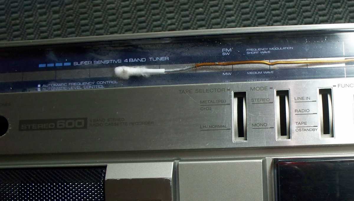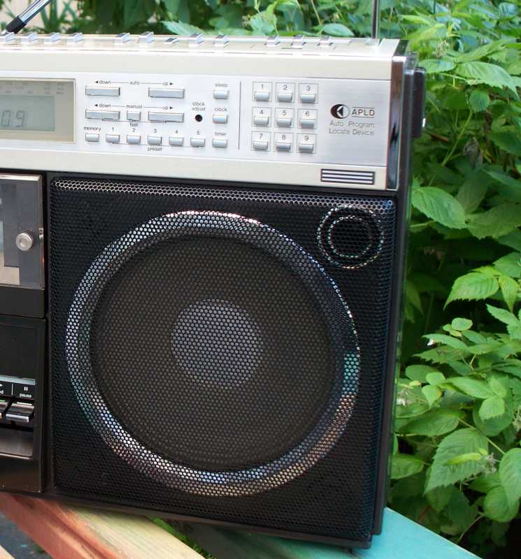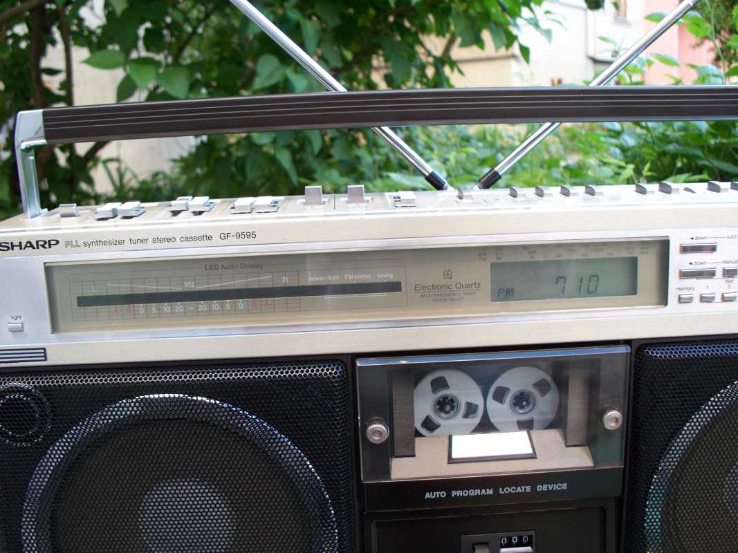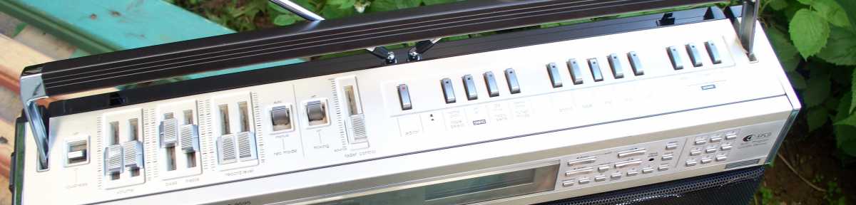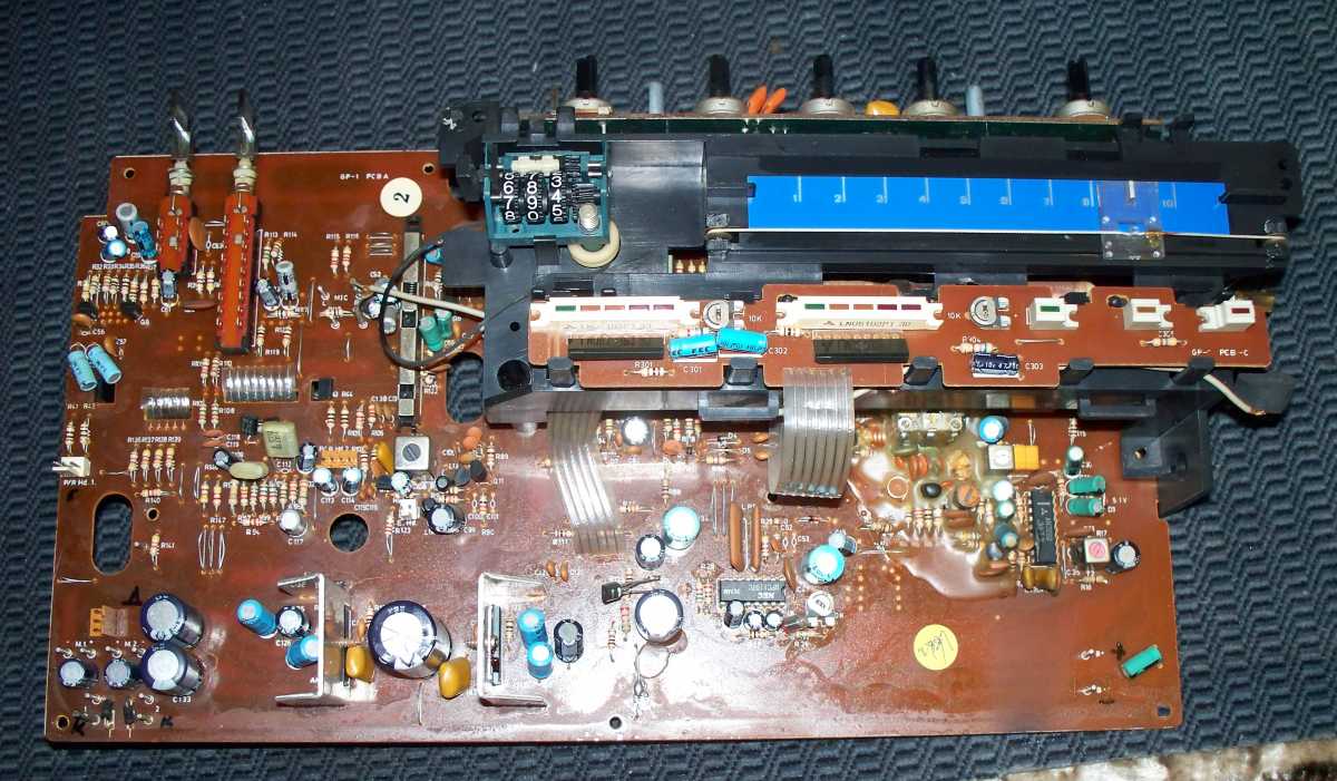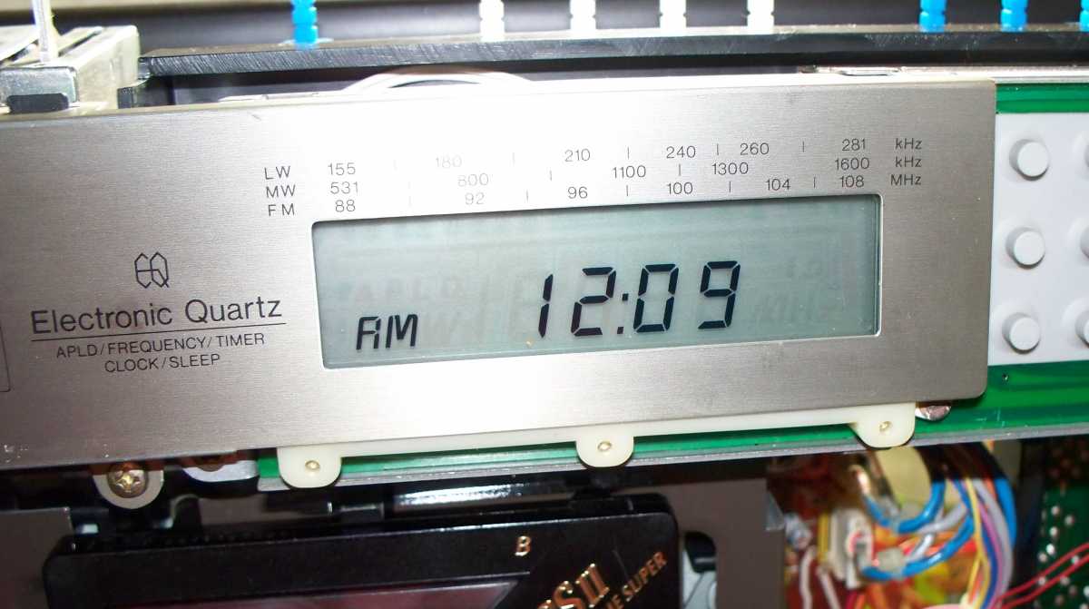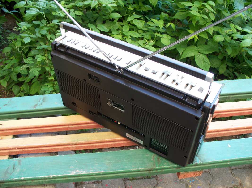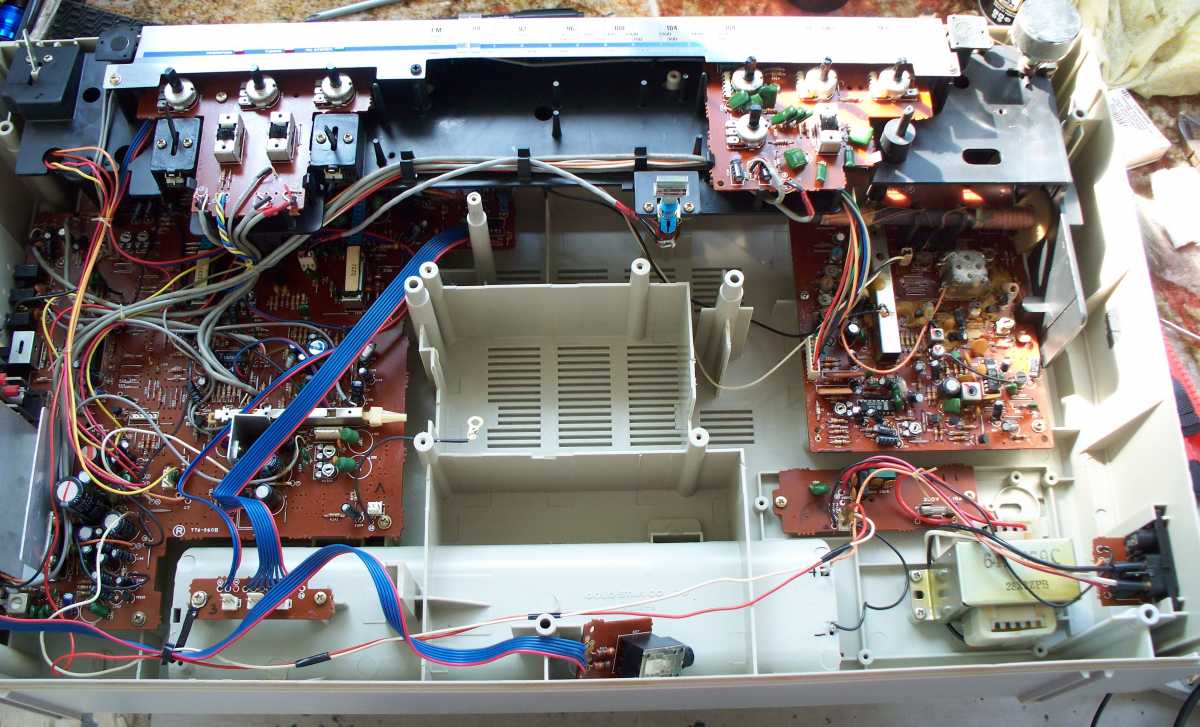 Компания Sharp всегда славилась своими неординарными разработками, вот и данная модель аппарата была в первых радах. Первый эксперимент с цифровым тюнером, Sharp делает смелые шаги не случайно, жидкие кристаллы это его научный конёк, к 70-ых годам уже вышли коммерческие образцы калькуляторов на жидких кристаллах. Sharp GF-9595 H, вот какой интересный аппарат на этот раз попал в мои руки. При покупке данной магнитолы, был определённый рыск купить ни кому не нужный ящик. А дело в том, что в объявлении было указано, что приёмник не запускается, а на всевозможных форумах пишут, что в случаи поломки, отремонтировать его практически не возможно. Я рискнул, правда пришлось потом немного понервничать, но об этом позже. Когда смотришь на эту магнитолу, вспонимаешь, весь смысл слов, «умели же люди делать». Досталась он мне в отличной косметике, как и все с детскими болячками, но ничего страшного, оживим. В плане разбора, всё просто, на мой взгляд. Выкручиваются винты, снимается задняя крышка. На ней кроме антенн, ничего больше нету, хотя нет, ещё установлен защитный экран. Затем снимается верхняя накладка с надписями, и вынимаем всю начинку на каркасе, из передней части корпуса, он абсолютно ни как не крепится, а просто одевается на направляющие для винтов. А вот на передней части уже кое что имеется, а именно блок кнопок управления радио и системой APLD, она здесь на 9 треков, и работает только при установленных батарейках. Пришлось его разобрать, что бы почистить все хромированные кнопочки. Ну и конечно же динамики. Они здесь на 16 см. Вот они мне понравились, очень добротное исполнение, диффузоры серого цвета, с белоснежными тканевыми куполами. Магниты П образной формы. Существует мнение, что динамики с П образными магнитами играют на порядок лучше. Вч динамики пьеза-электрические, в корпусе. Рядом установлены микрофоны. Ну а сейчас переходим к электронной составляющей, всё смонтировано на каркасе, в плане ремонта всё удобно, всё доступно со всех сторон. В глаза бросается огромное количество комплектации от Sanyo, особенно микросхем. Платы, от больших до маленьких, провода, пайка, разъёмы, всё здесь присутствует, как говориться в полном обьёме. Трансформатор хоть он и не больших размеров, но не в размере дело, со своей задачей справляется на все сто. Способен работать в тремя видами напряжения. Так как приёмник в этой модели цифровой, на нём хотелось остановится немного подробнее. Как уже было сказано выше, при проверке магнитолы, пришлось немного понервничать, а всё дело в том, что радио в этом аппарате работает только при установленных трёх пальчиковых батарейках, и когда я ух установил, запускаться оно отказалось, но почистив контакты батареек, всё заработало, и я вздохнул с облегчением.Вот фото отсека для батареек приёмника. Вот собственно и сама плата приёмника, привычный всем КПЕ отсутствует, ну конечно, ведь радио цифровое. Вся информация отображается на дисплее, в выключенном состоянии на нём работаю часы. Настроить их с первого раза было не просто, в смысле намудрили с комбинацией кнопок. Станций в память аппарат можно занести всего лишь пять , маловато, но на те времена, это было круто. А вот эта штучка имеет прямое отношение к настройке часов. Сразу и не разобрал, что это такое, но потом понял, это пьеза динамик. Слишком долго описывать какое именно, но нажав н