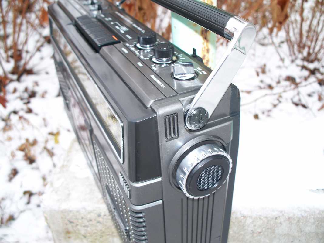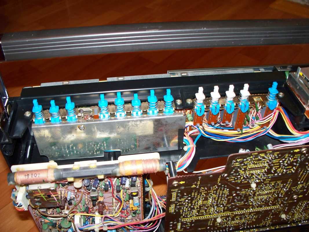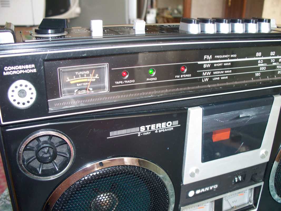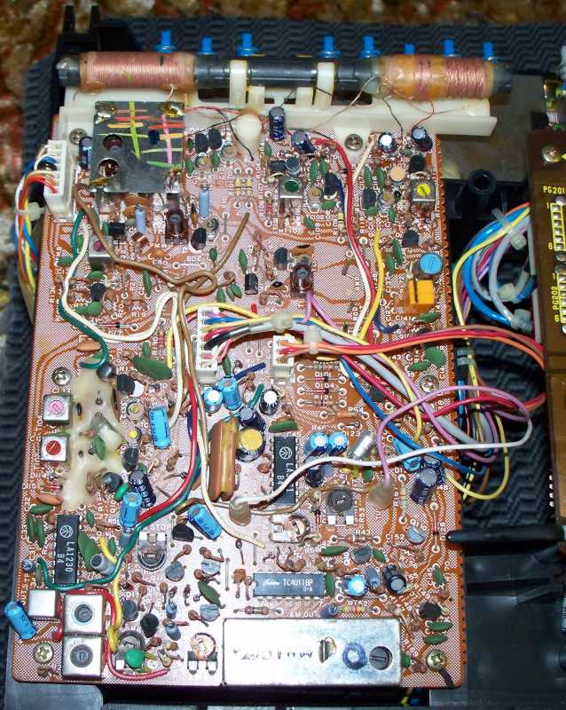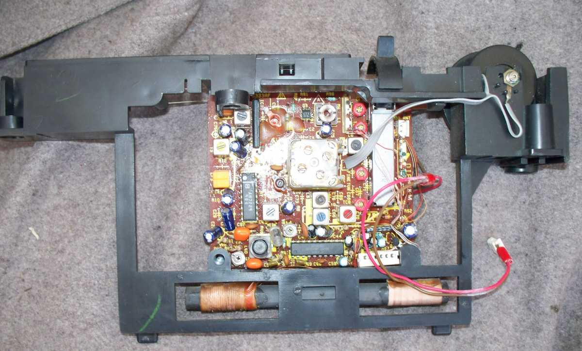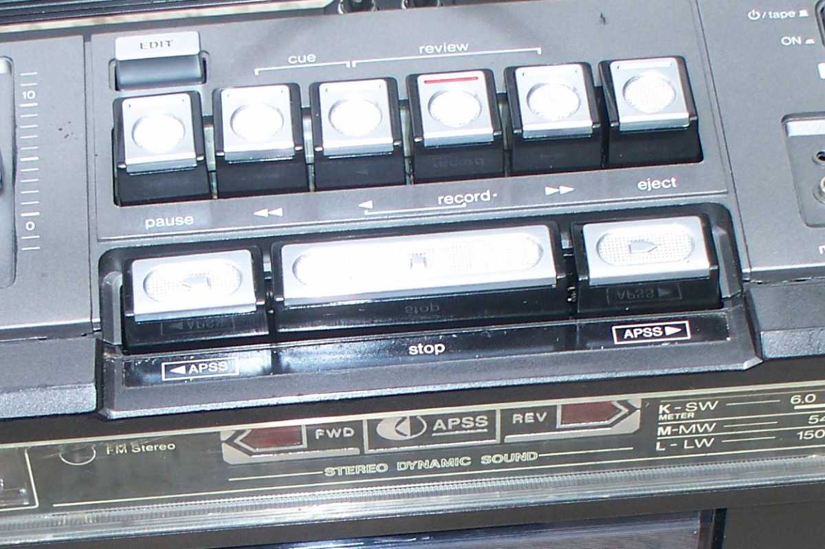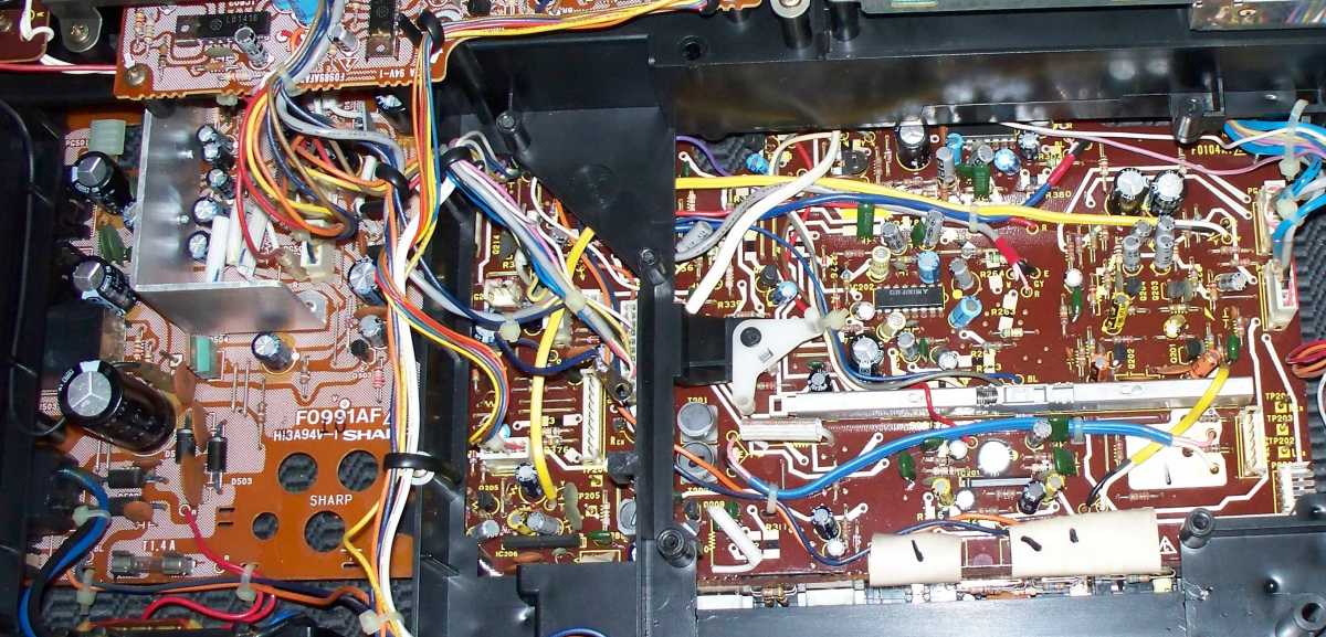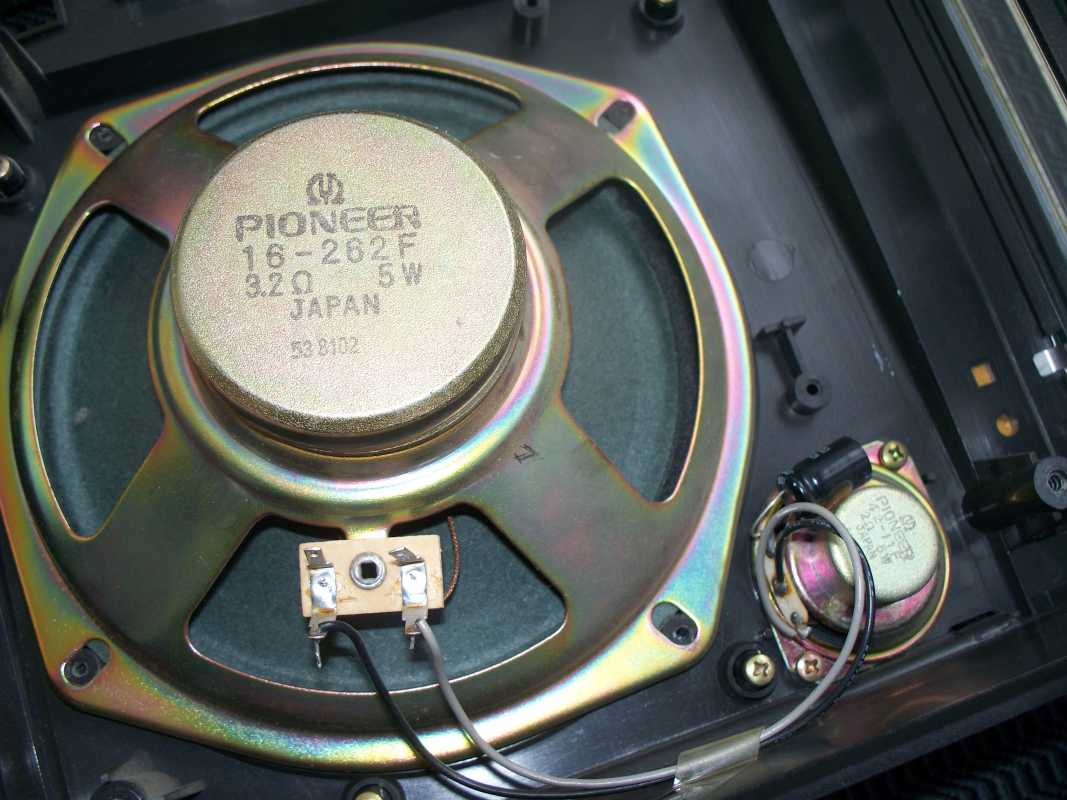 Компания Sharp всегда славилась своими неординарными разработками, вот и данная модель аппарата была в первых радах. Первый эксперимент с цифровым тюнером, Sharp делает смелые шаги не случайно, жидкие кристаллы это его научный конёк, к 70-ых годам уже вышли коммерческие образцы калькуляторов на жидких кристаллах. Sharp GF-9595 H, вот какой интересный аппарат на этот раз попал в мои руки. При покупке данной магнитолы, был определённый рыск купить ни кому не нужный ящик. А дело в том, что в объявлении было указано, что приёмник не запускается, а на всевозможных форумах пишут, что в случаи поломки, отремонтировать его практически не возможно. Я рискнул, правда пришлось потом немного понервничать, но об этом позже. Когда смотришь на эту магнитолу, вспонимаешь, весь смысл слов, «умели же люди делать». Досталась он мне в отличной косметике, как и все с детскими болячками, но ничего страшного, оживим. В плане разбора, всё просто, на мой взгляд. Выкручиваются винты, снимается задняя крышка. На ней кроме антенн, ничего больше нету, хотя нет, ещё установлен защитный экран. Затем снимается верхняя накладка с надписями, и вынимаем всю начинку на каркасе, из передней части корпуса, он абсолютно ни как не крепится, а просто одевается на направляющие для винтов. А вот на передней части уже кое что имеется, а именно блок кнопок управления радио и системой APLD, она здесь на 9 треков, и работает только при установленных батарейках. Пришлось его разобрать, что бы почистить все хромированные кнопочки. Ну и конечно же динамики. Они здесь на 16 см. Вот они мне понравились, очень добротное исполнение, диффузоры серого цвета, с белоснежными тканевыми куполами. Магниты П образной формы. Существует мнение, что динамики с П образными магнитами играют на порядок лучше. Вч динамики пьеза-электрические, в корпусе. Рядом установлены микрофоны. Ну а сейчас переходим к электронной составляющей, всё смонтировано на каркасе, в плане ремонта всё удобно, всё доступно со всех сторон. В глаза бросается огромное количество комплектации от Sanyo, особенно микросхем. Платы, от больших до маленьких, провода, пайка, разъёмы, всё здесь присутствует, как говориться в полном обьёме. Трансформатор хоть он и не больших размеров, но не в размере дело, со своей задачей справляется на все сто. Способен работать в тремя видами напряжения. Так как приёмник в этой модели цифровой, на нём хотелось остановится немного подробнее. Как уже было сказано выше, при проверке магнитолы, пришлось немного понервничать, а всё дело в том, что радио в этом аппарате работает только при установленных трёх пальчиковых батарейках, и когда я ух установил, запускаться оно отказалось, но почистив контакты батареек, всё заработало, и я вздохнул с облегчением.Вот фото отсека для батареек приёмника. Вот собственно и сама плата приёмника, привычный всем КПЕ отсутствует, ну конечно, ведь радио цифровое. Вся информация отображается на дисплее, в выключенном состоянии на нём работаю часы. Настроить их с первого раза было не просто, в смысле намудрили с комбинацией кнопок. Станций в память аппарат можно занести всего лишь пять , маловато, но на те времена, это было круто. А вот эта штучка имеет прямое отношение к настройке часов. Сразу и не разобрал, что это такое, но потом понял, это пьеза динамик. Слишком долго описывать какое именно, но нажав н