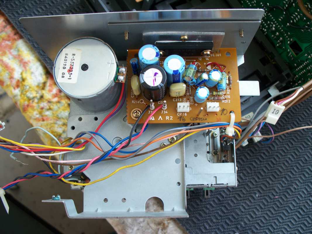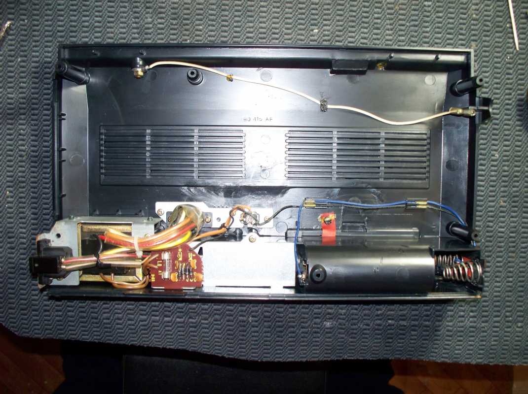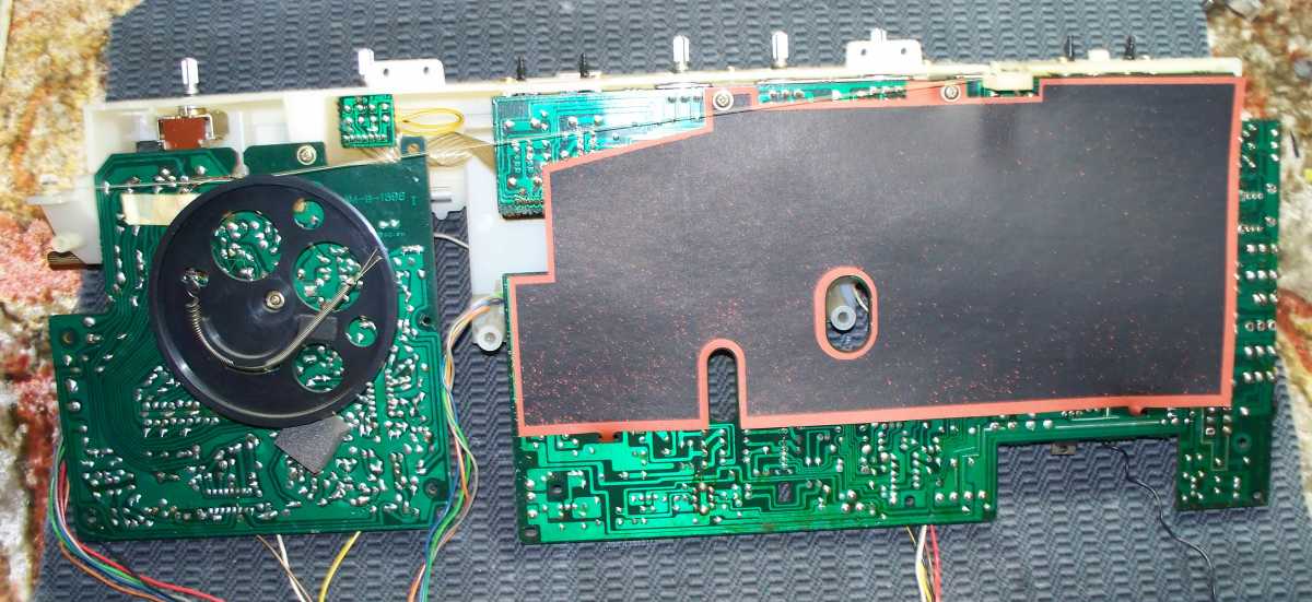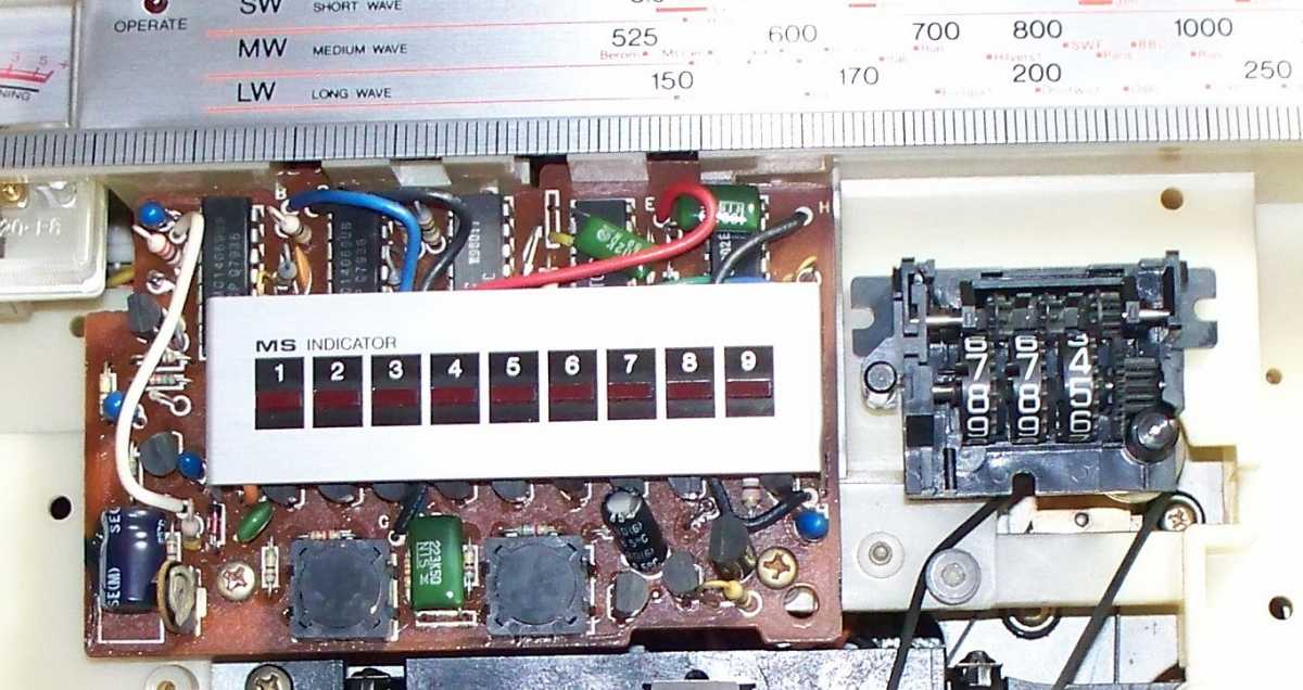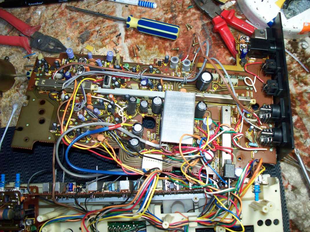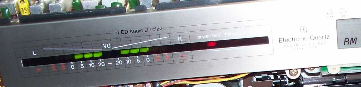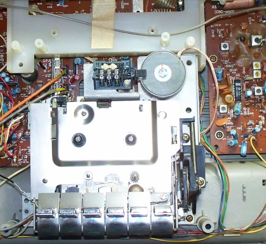 Компания Sharp всегда славилась своими неординарными разработками, вот и данная модель аппарата была в первых радах. Первый эксперимент с цифровым тюнером, Sharp делает смелые шаги не случайно, жидкие кристаллы это его научный конёк, к 70-ых годам уже вышли коммерческие образцы калькуляторов на жидких кристаллах. Sharp GF-9595 H, вот какой интересный аппарат на этот раз попал в мои руки. При покупке данной магнитолы, был определённый рыск купить ни кому не нужный ящик. А дело в том, что в объявлении было указано, что приёмник не запускается, а на всевозможных форумах пишут, что в случаи поломки, отремонтировать его практически не возможно. Я рискнул, правда пришлось потом немного понервничать, но об этом позже. Когда смотришь на эту магнитолу, вспонимаешь, весь смысл слов, «умели же люди делать». Досталась он мне в отличной косметике, как и все с детскими болячками, но ничего страшного, оживим. В плане разбора, всё просто, на мой взгляд. Выкручиваются винты, снимается задняя крышка. На ней кроме антенн, ничего больше нету, хотя нет, ещё установлен защитный экран. Затем снимается верхняя накладка с надписями, и вынимаем всю начинку на каркасе, из передней части корпуса, он абсолютно ни как не крепится, а просто одевается на направляющие для винтов. А вот на передней части уже кое что имеется, а именно блок кнопок управления радио и системой APLD, она здесь на 9 треков, и работает только при установленных батарейках. Пришлось его разобрать, что бы почистить все хромированные кнопочки. Ну и конечно же динамики. Они здесь на 16 см. Вот они мне понравились, очень добротное исполнение, диффузоры серого цвета, с белоснежными тканевыми куполами. Магниты П образной формы. Существует мнение, что динамики с П образными магнитами играют на порядок лучше. Вч динамики пьеза-электрические, в корпусе. Рядом установлены микрофоны. Ну а сейчас переходим к электронной составляющей, всё смонтировано на каркасе, в плане ремонта всё удобно, всё доступно со всех сторон. В глаза бросается огромное количество комплектации от Sanyo, особенно микросхем. Платы, от больших до маленьких, провода, пайка, разъёмы, всё здесь присутствует, как говориться в полном обьёме. Трансформатор хоть он и не больших размеров, но не в размере дело, со своей задачей справляется на все сто. Способен работать в тремя видами напряжения. Так как приёмник в этой модели цифровой, на нём хотелось остановится немного подробнее. Как уже было сказано выше, при проверке магнитолы, пришлось немного понервничать, а всё дело в том, что радио в этом аппарате работает только при установленных трёх пальчиковых батарейках, и когда я ух установил, запускаться оно отказалось, но почистив контакты батареек, всё заработало, и я вздохнул с облегчением.Вот фото отсека для батареек приёмника. Вот собственно и сама плата приёмника, привычный всем КПЕ отсутствует, ну конечно, ведь радио цифровое. Вся информация отображается на дисплее, в выключенном состоянии на нём работаю часы. Настроить их с первого раза было не просто, в смысле намудрили с комбинацией кнопок. Станций в память аппарат можно занести всего лишь пять , маловато, но на те времена, это было круто. А вот эта штучка имеет прямое отношение к настройке часов. Сразу и не разобрал, что это такое, но потом понял, это пьеза динамик. Слишком долго описывать какое именно, но нажав н