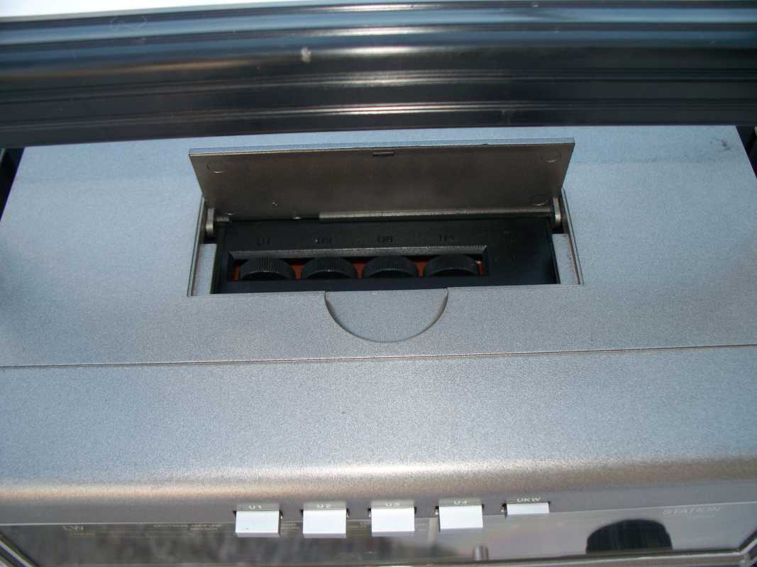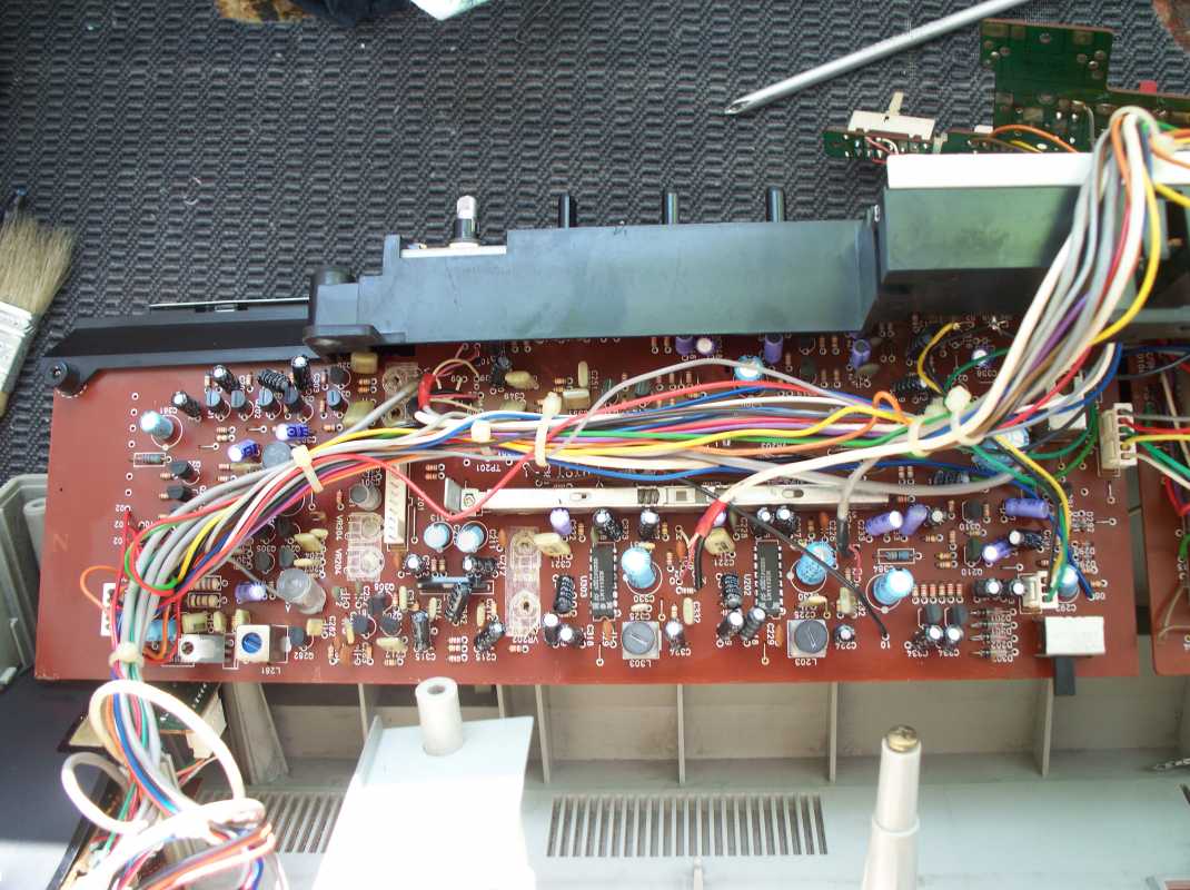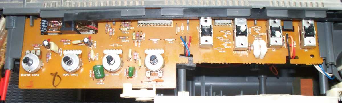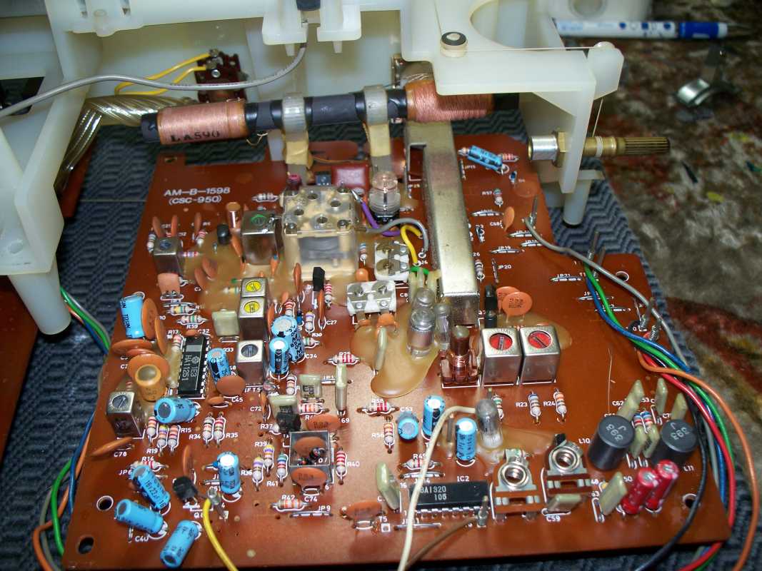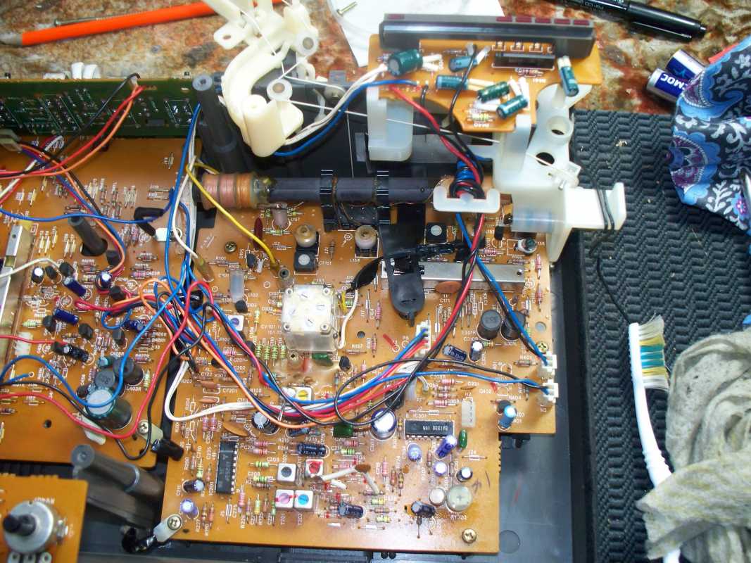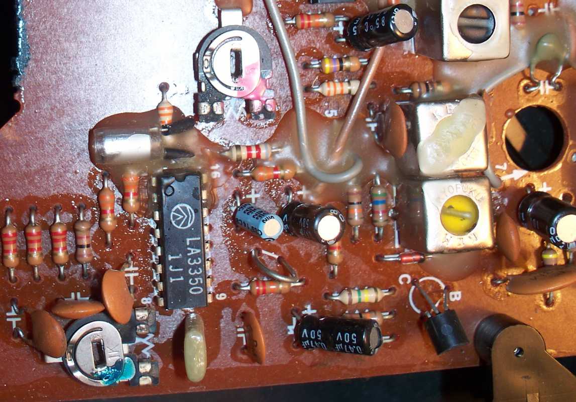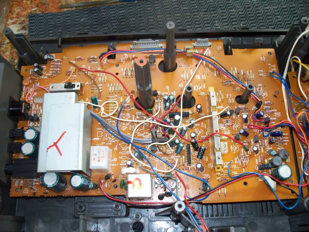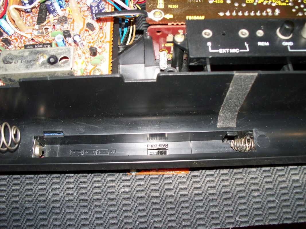 Компания Sharp всегда славилась своими неординарными разработками, вот и данная модель аппарата была в первых радах. Первый эксперимент с цифровым тюнером, Sharp делает смелые шаги не случайно, жидкие кристаллы это его научный конёк, к 70-ых годам уже вышли коммерческие образцы калькуляторов на жидких кристаллах. Sharp GF-9595 H, вот какой интересный аппарат на этот раз попал в мои руки. При покупке данной магнитолы, был определённый рыск купить ни кому не нужный ящик. А дело в том, что в объявлении было указано, что приёмник не запускается, а на всевозможных форумах пишут, что в случаи поломки, отремонтировать его практически не возможно. Я рискнул, правда пришлось потом немного понервничать, но об этом позже. Когда смотришь на эту магнитолу, вспонимаешь, весь смысл слов, «умели же люди делать». Досталась он мне в отличной косметике, как и все с детскими болячками, но ничего страшного, оживим. В плане разбора, всё просто, на мой взгляд. Выкручиваются винты, снимается задняя крышка. На ней кроме антенн, ничего больше нету, хотя нет, ещё установлен защитный экран. Затем снимается верхняя накладка с надписями, и вынимаем всю начинку на каркасе, из передней части корпуса, он абсолютно ни как не крепится, а просто одевается на направляющие для винтов. А вот на передней части уже кое что имеется, а именно блок кнопок управления радио и системой APLD, она здесь на 9 треков, и работает только при установленных батарейках. Пришлось его разобрать, что бы почистить все хромированные кнопочки. Ну и конечно же динамики. Они здесь на 16 см. Вот они мне понравились, очень добротное исполнение, диффузоры серого цвета, с белоснежными тканевыми куполами. Магниты П образной формы. Существует мнение, что динамики с П образными магнитами играют на порядок лучше. Вч динамики пьеза-электрические, в корпусе. Рядом установлены микрофоны. Ну а сейчас переходим к электронной составляющей, всё смонтировано на каркасе, в плане ремонта всё удобно, всё доступно со всех сторон. В глаза бросается огромное количество комплектации от Sanyo, особенно микросхем. Платы, от больших до маленьких, провода, пайка, разъёмы, всё здесь присутствует, как говориться в полном обьёме. Трансформатор хоть он и не больших размеров, но не в размере дело, со своей задачей справляется на все сто. Способен работать в тремя видами напряжения. Так как приёмник в этой модели цифровой, на нём хотелось остановится немного подробнее. Как уже было сказано выше, при проверке магнитолы, пришлось немного понервничать, а всё дело в том, что радио в этом аппарате работает только при установленных трёх пальчиковых батарейках, и когда я ух установил, запускаться оно отказалось, но почистив контакты батареек, всё заработало, и я вздохнул с облегчением.Вот фото отсека для батареек приёмника. Вот собственно и сама плата приёмника, привычный всем КПЕ отсутствует, ну конечно, ведь радио цифровое. Вся информация отображается на дисплее, в выключенном состоянии на нём работаю часы. Настроить их с первого раза было не просто, в смысле намудрили с комбинацией кнопок. Станций в память аппарат можно занести всего лишь пять , маловато, но на те времена, это было круто. А вот эта штучка имеет прямое отношение к настройке часов. Сразу и не разобрал, что это такое, но потом понял, это пьеза динамик. Слишком долго описывать какое именно, но нажав н