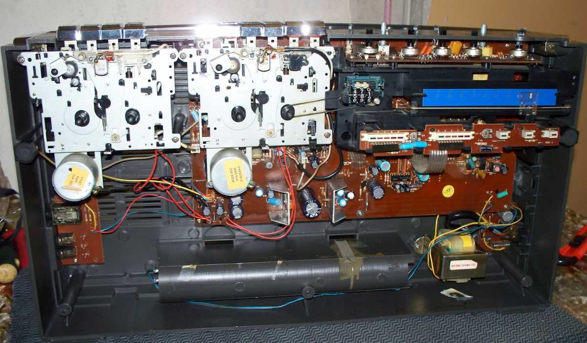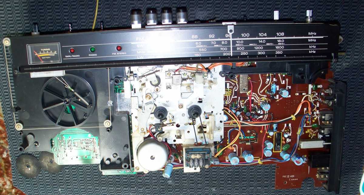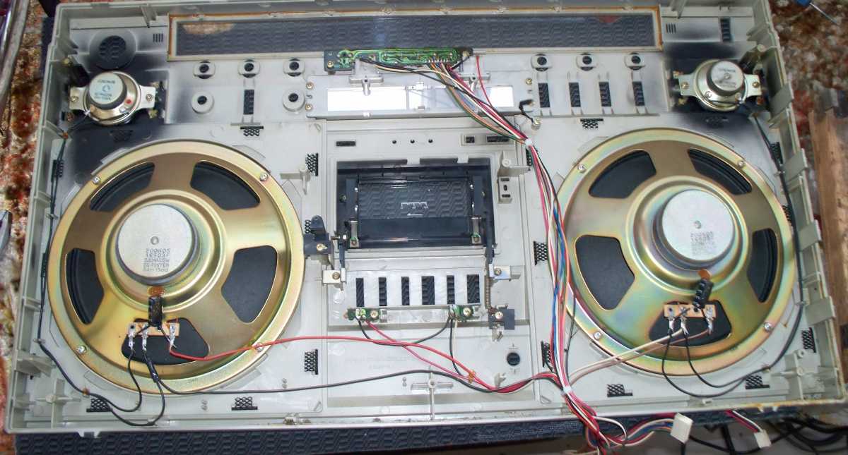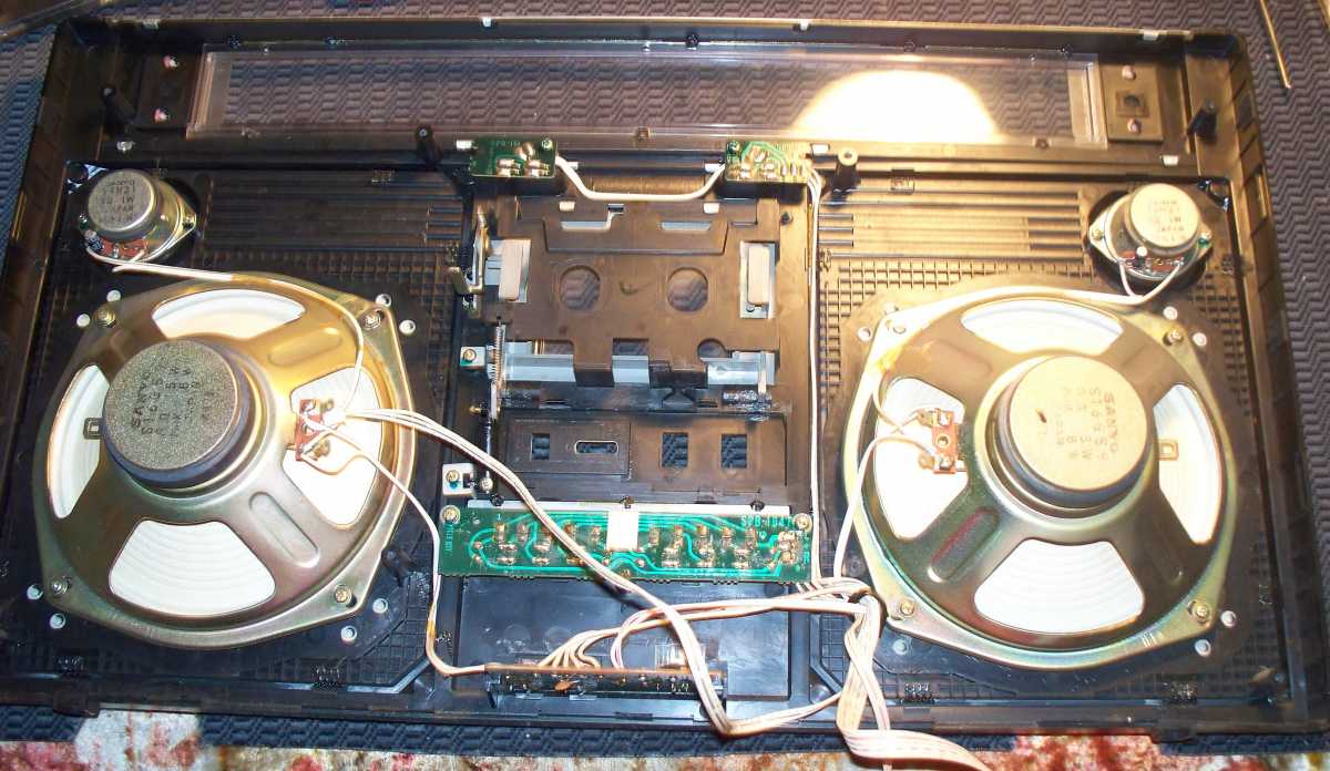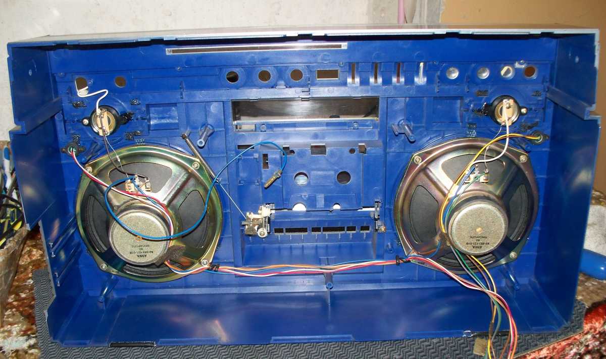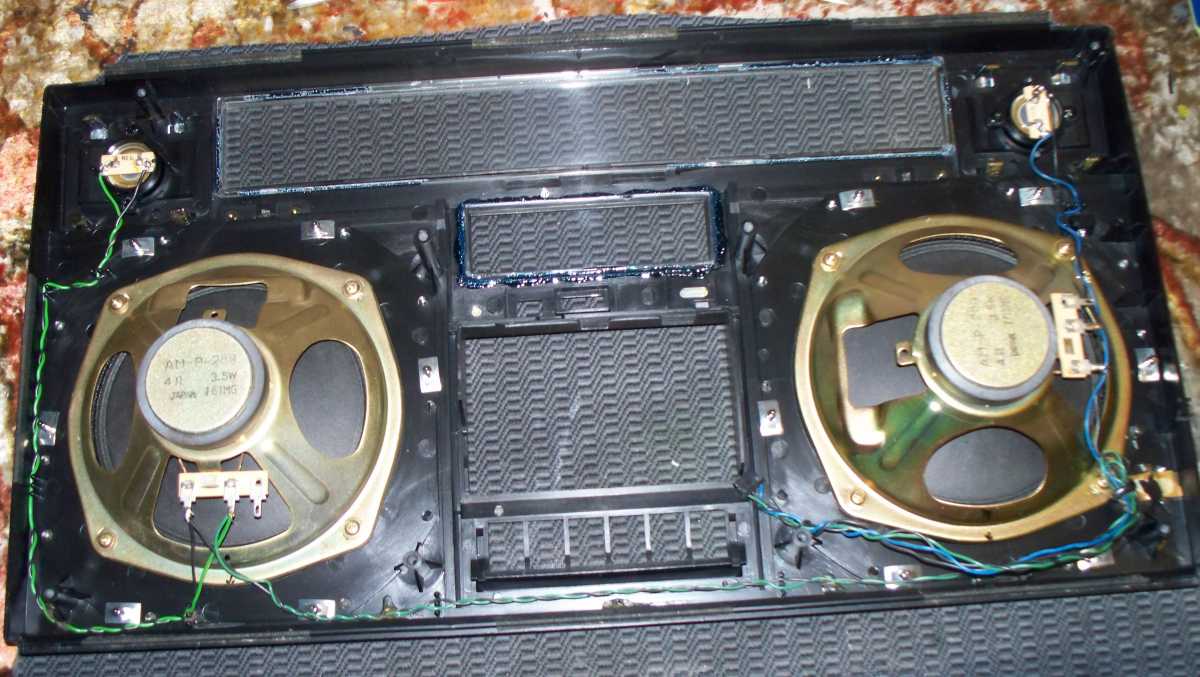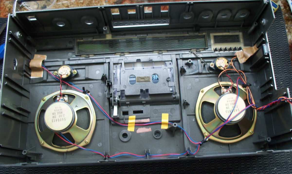 Когда взял её в руки, она мне показалась уж очень тяжёлой для своих размеров. Сняв крышку батарейного отсека, я увидел полный отсек батареек, хорошо что они ещё не потекли. Магнитола в неплохой косметике и как всегда пыль, грязь, замена пассиков и т.д. Снимаем заднюю часть, отвинтив аж 13 винтов, и вот оно, изобилие проводов и плат. Всё собрано очень компактно, фишки, пайка ну и конечно фирменное от SANYO, провода намоточное на штырьки. К слову, все фишки имеют номер. Лицевую часть снимать не стал, причин для этого не было. Обнаружил первую неисправность, отскочила дорожка от ножки транса. В ЛПМ царствует металл, пластмассы практически нету, за исключением шестерёнок. Пассик плоский, долезть до него проблематично, но самое не приятное одеть пассик счётчика ленты после или вернее это нужно делать в процессе установки ЛПМ на своё место. Как я уже писал всё очень компактно. Платы расположены одна над одной, между ними тканевая прокладка, видимо что бы пыль на неё собиралась. Плата приёмника в самом верху, приёмник работает очень качественно, приём отличный, также есть точная подстройка. Плата усилителя, ей больше не нашлось ни где места, и её прикрутили к ЛПМ, не очень удобно. Транс и плата пикового индикатора. . Шкала приёмника установлена под углом, стрелка со светодиодом, индикатор в своеобразном окошке, смотрится неплохо. Хочется отметит своеобразное крепление колонок, с мощным штырём сверху, механизмом защёлки внутри колонки, почти как капот в автомобиле. Колонки закрытого типа, внутри никакого наполнителя, кроме распорки, динамики 12 см и бумажные пищалки от SANYO. Механизм приёма кассеты схож с 939 Шарпом. Вот такая магнитолка, приятная в обращении, ни чего лишнего, всё на своих местах. Неплохой аппарат, с неплохим функционалом, система DOLBI, линейный вход с фоно корректором, лифт ЛПМ, автостоп, светодиодный индикатор, да и приятный внешний вид с изобилием хрома. По звуку ничего сверх естественного, для своего класса очень даже неплохо. SANYO C3D.