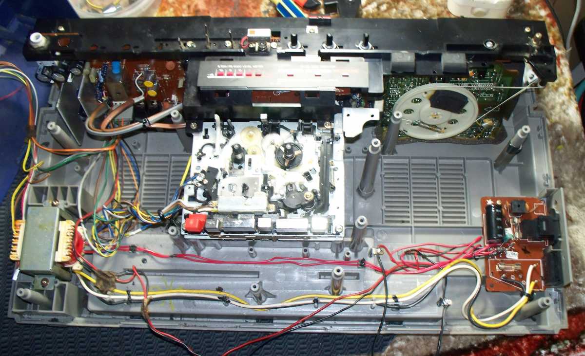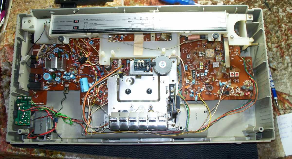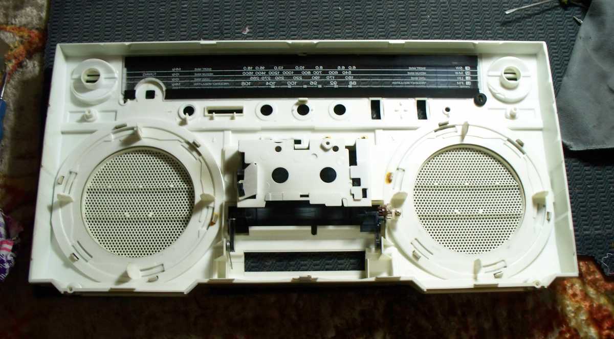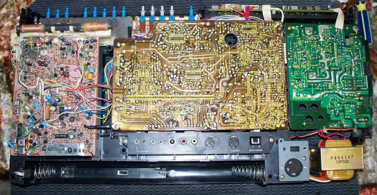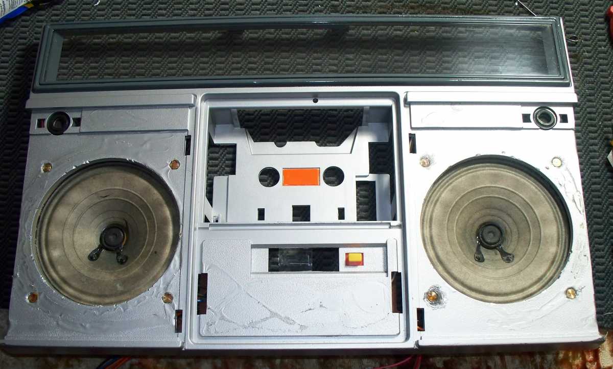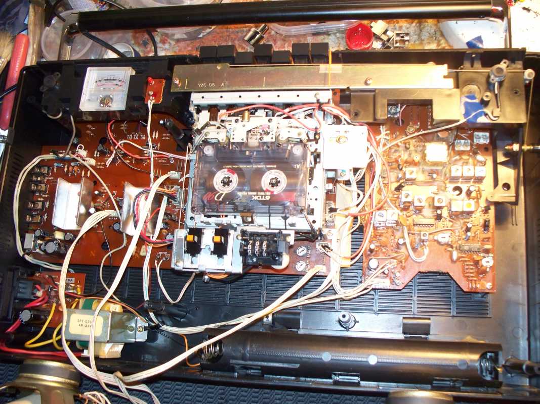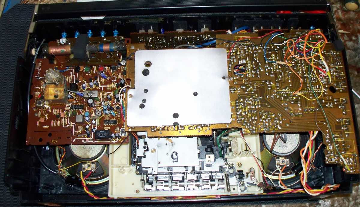 Когда взял её в руки, она мне показалась уж очень тяжёлой для своих размеров. Сняв крышку батарейного отсека, я увидел полный отсек батареек, хорошо что они ещё не потекли. Магнитола в неплохой косметике и как всегда пыль, грязь, замена пассиков и т.д. Снимаем заднюю часть, отвинтив аж 13 винтов, и вот оно, изобилие проводов и плат. Всё собрано очень компактно, фишки, пайка ну и конечно фирменное от SANYO, провода намоточное на штырьки. К слову, все фишки имеют номер. Лицевую часть снимать не стал, причин для этого не было. Обнаружил первую неисправность, отскочила дорожка от ножки транса. В ЛПМ царствует металл, пластмассы практически нету, за исключением шестерёнок. Пассик плоский, долезть до него проблематично, но самое не приятное одеть пассик счётчика ленты после или вернее это нужно делать в процессе установки ЛПМ на своё место. Как я уже писал всё очень компактно. Платы расположены одна над одной, между ними тканевая прокладка, видимо что бы пыль на неё собиралась. Плата приёмника в самом верху, приёмник работает очень качественно, приём отличный, также есть точная подстройка. Плата усилителя, ей больше не нашлось ни где места, и её прикрутили к ЛПМ, не очень удобно. Транс и плата пикового индикатора. . Шкала приёмника установлена под углом, стрелка со светодиодом, индикатор в своеобразном окошке, смотрится неплохо. Хочется отметит своеобразное крепление колонок, с мощным штырём сверху, механизмом защёлки внутри колонки, почти как капот в автомобиле. Колонки закрытого типа, внутри никакого наполнителя, кроме распорки, динамики 12 см и бумажные пищалки от SANYO. Механизм приёма кассеты схож с 939 Шарпом. Вот такая магнитолка, приятная в обращении, ни чего лишнего, всё на своих местах. Неплохой аппарат, с неплохим функционалом, система DOLBI, линейный вход с фоно корректором, лифт ЛПМ, автостоп, светодиодный индикатор, да и приятный внешний вид с изобилием хрома. По звуку ничего сверх естественного, для своего класса очень даже неплохо. SANYO C3D.
