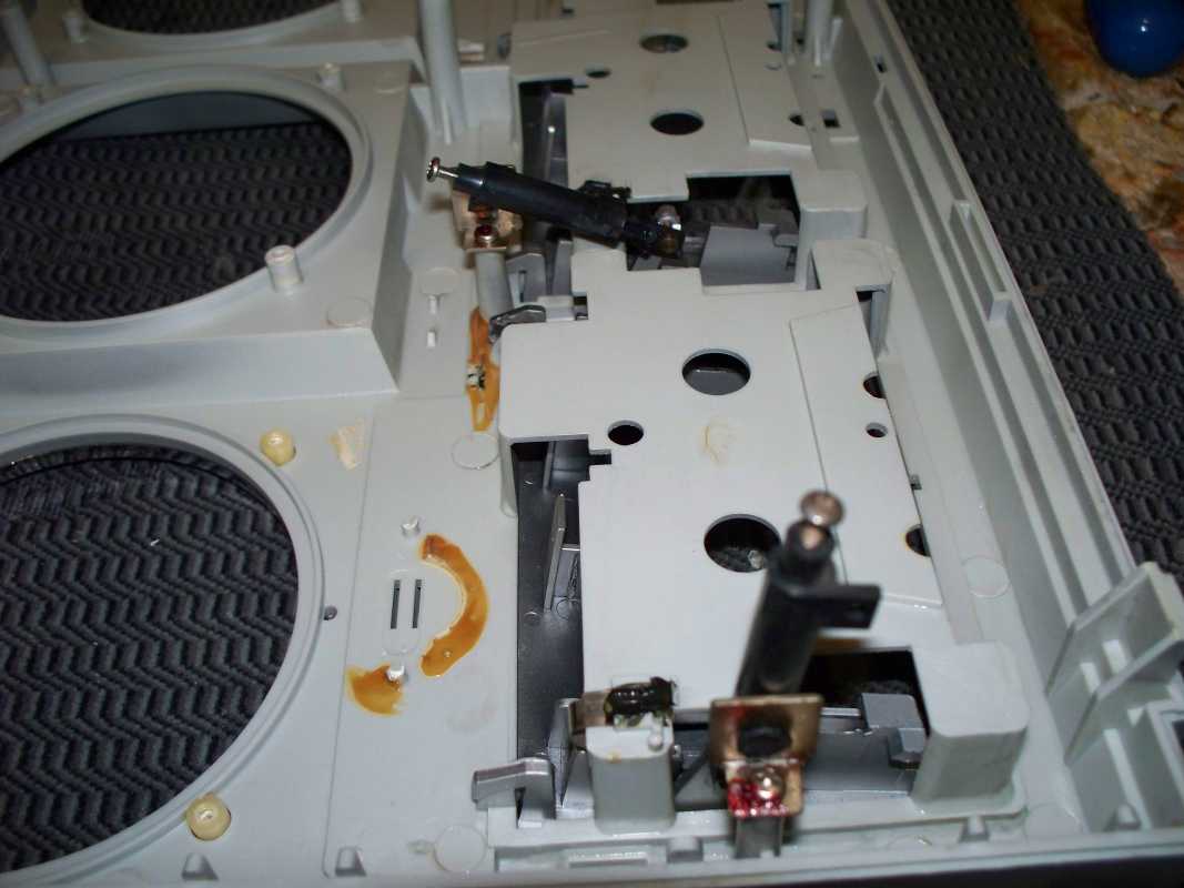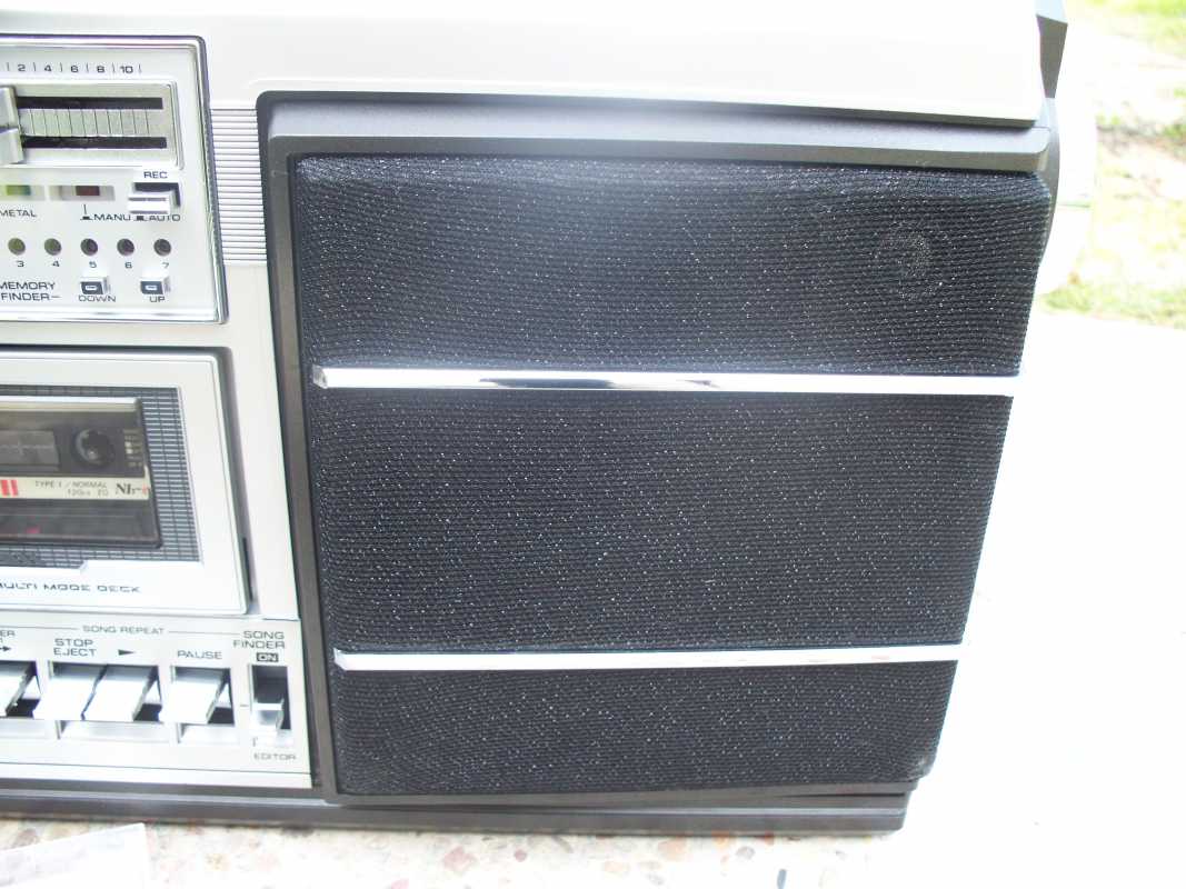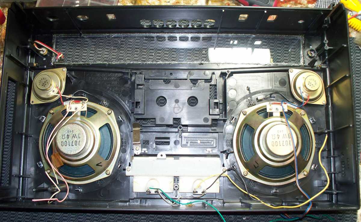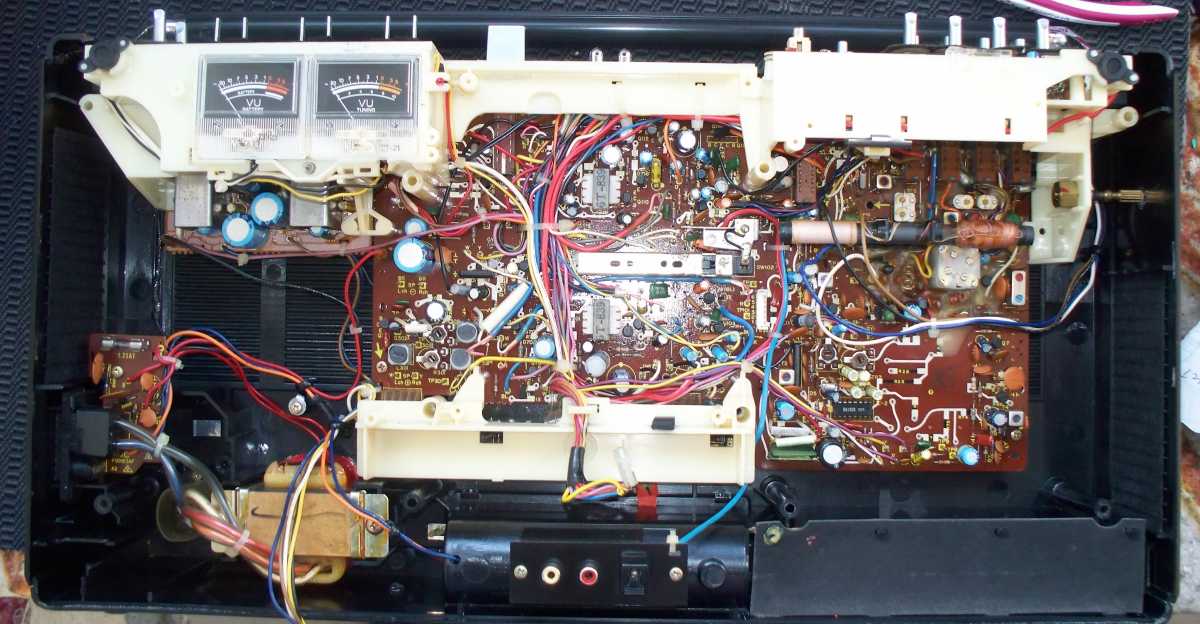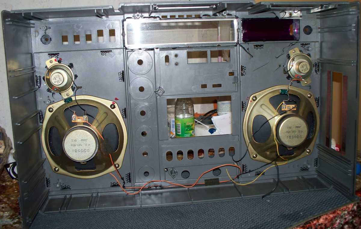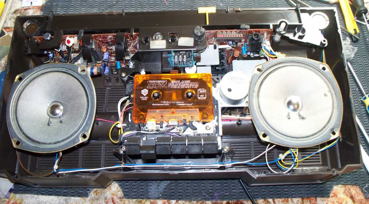 Когда взял её в руки, она мне показалась уж очень тяжёлой для своих размеров. Сняв крышку батарейного отсека, я увидел полный отсек батареек, хорошо что они ещё не потекли. Магнитола в неплохой косметике и как всегда пыль, грязь, замена пассиков и т.д. Снимаем заднюю часть, отвинтив аж 13 винтов, и вот оно, изобилие проводов и плат. Всё собрано очень компактно, фишки, пайка ну и конечно фирменное от SANYO, провода намоточное на штырьки. К слову, все фишки имеют номер. Лицевую часть снимать не стал, причин для этого не было. Обнаружил первую неисправность, отскочила дорожка от ножки транса. В ЛПМ царствует металл, пластмассы практически нету, за исключением шестерёнок. Пассик плоский, долезть до него проблематично, но самое не приятное одеть пассик счётчика ленты после или вернее это нужно делать в процессе установки ЛПМ на своё место. Как я уже писал всё очень компактно. Платы расположены одна над одной, между ними тканевая прокладка, видимо что бы пыль на неё собиралась. Плата приёмника в самом верху, приёмник работает очень качественно, приём отличный, также есть точная подстройка. Плата усилителя, ей больше не нашлось ни где места, и её прикрутили к ЛПМ, не очень удобно. Транс и плата пикового индикатора. . Шкала приёмника установлена под углом, стрелка со светодиодом, индикатор в своеобразном окошке, смотрится неплохо. Хочется отметит своеобразное крепление колонок, с мощным штырём сверху, механизмом защёлки внутри колонки, почти как капот в автомобиле. Колонки закрытого типа, внутри никакого наполнителя, кроме распорки, динамики 12 см и бумажные пищалки от SANYO. Механизм приёма кассеты схож с 939 Шарпом. Вот такая магнитолка, приятная в обращении, ни чего лишнего, всё на своих местах. Неплохой аппарат, с неплохим функционалом, система DOLBI, линейный вход с фоно корректором, лифт ЛПМ, автостоп, светодиодный индикатор, да и приятный внешний вид с изобилием хрома. По звуку ничего сверх естественного, для своего класса очень даже неплохо. SANYO C3D.