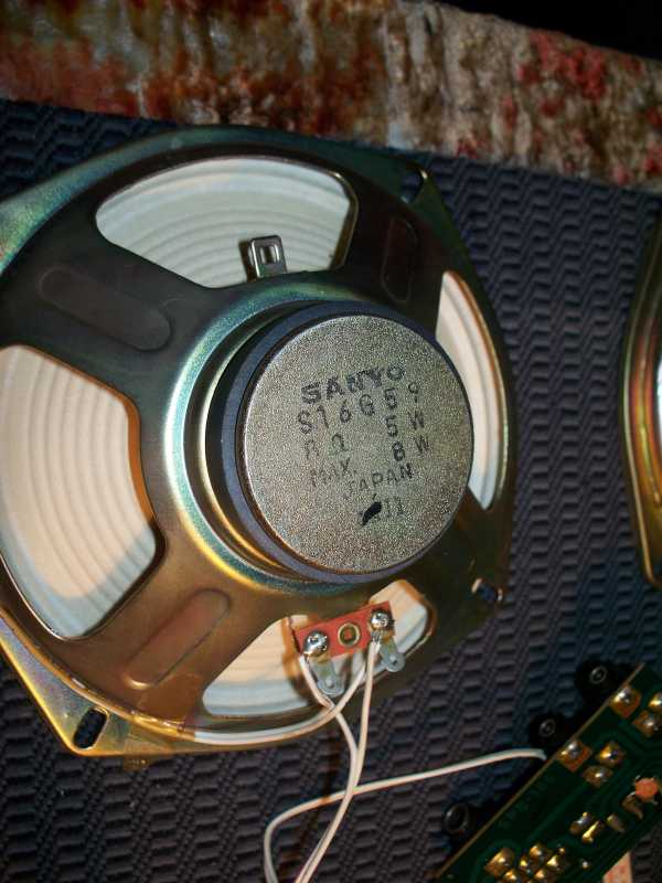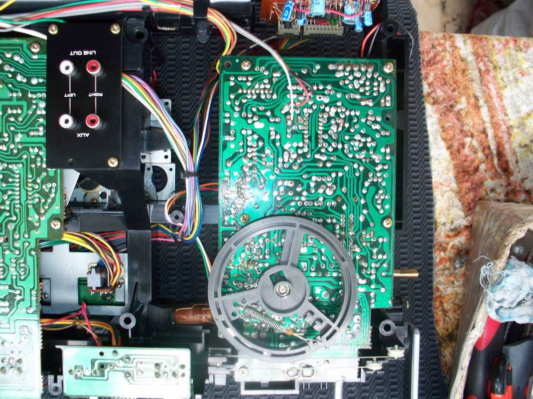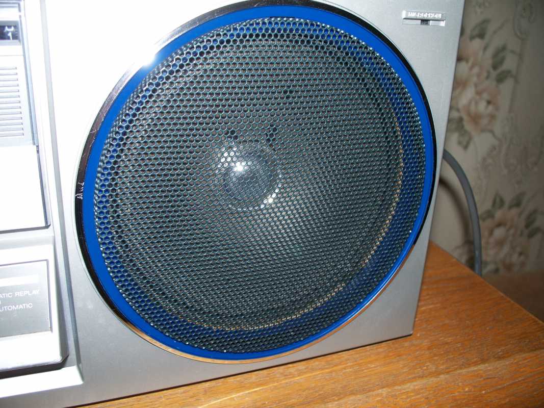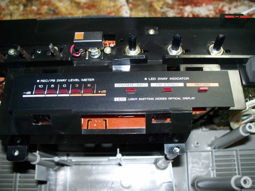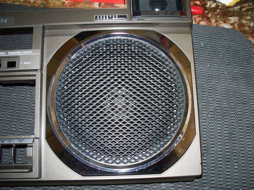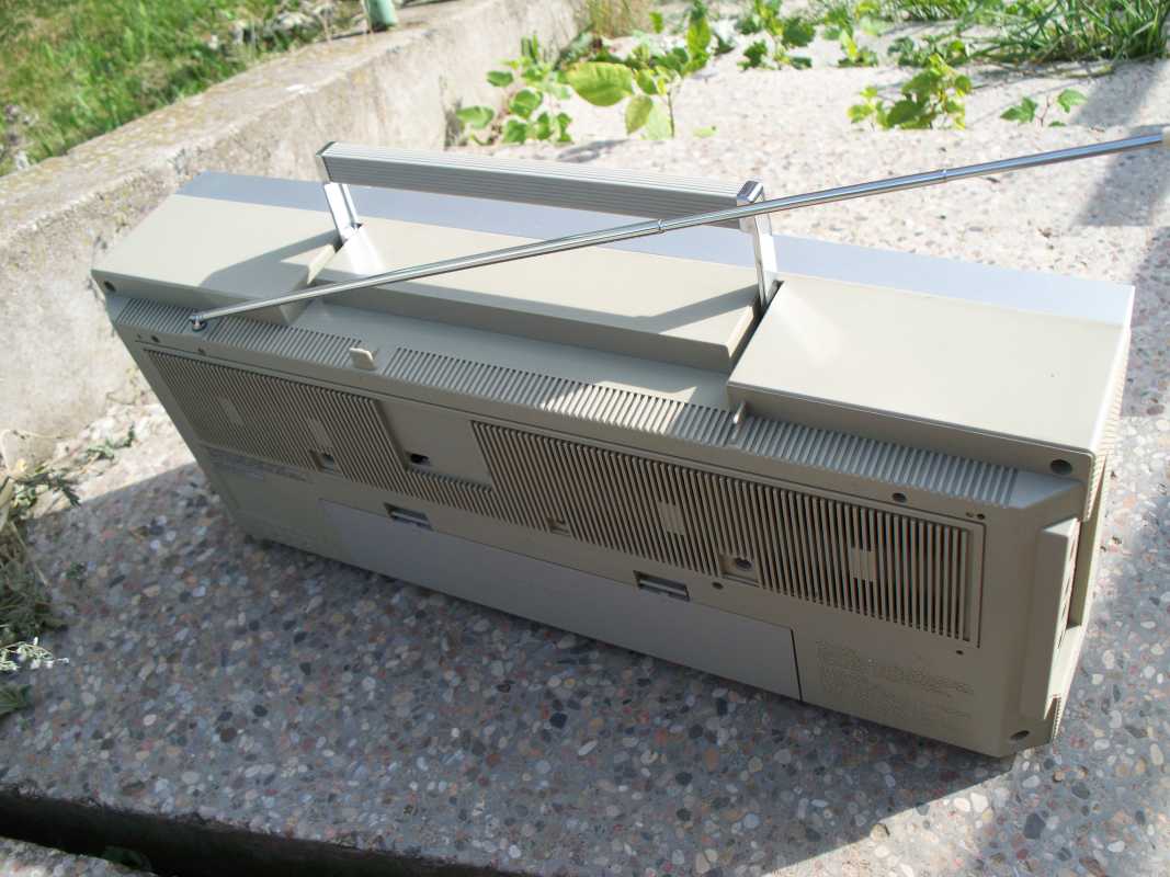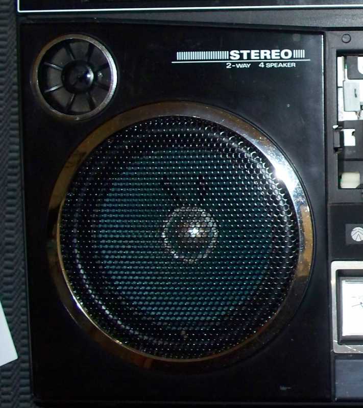 Когда взял её в руки, она мне показалась уж очень тяжёлой для своих размеров. Сняв крышку батарейного отсека, я увидел полный отсек батареек, хорошо что они ещё не потекли. Магнитола в неплохой косметике и как всегда пыль, грязь, замена пассиков и т.д. Снимаем заднюю часть, отвинтив аж 13 винтов, и вот оно, изобилие проводов и плат. Всё собрано очень компактно, фишки, пайка ну и конечно фирменное от SANYO, провода намоточное на штырьки. К слову, все фишки имеют номер. Лицевую часть снимать не стал, причин для этого не было. Обнаружил первую неисправность, отскочила дорожка от ножки транса. В ЛПМ царствует металл, пластмассы практически нету, за исключением шестерёнок. Пассик плоский, долезть до него проблематично, но самое не приятное одеть пассик счётчика ленты после или вернее это нужно делать в процессе установки ЛПМ на своё место. Как я уже писал всё очень компактно. Платы расположены одна над одной, между ними тканевая прокладка, видимо что бы пыль на неё собиралась. Плата приёмника в самом верху, приёмник работает очень качественно, приём отличный, также есть точная подстройка. Плата усилителя, ей больше не нашлось ни где места, и её прикрутили к ЛПМ, не очень удобно. Транс и плата пикового индикатора. . Шкала приёмника установлена под углом, стрелка со светодиодом, индикатор в своеобразном окошке, смотрится неплохо. Хочется отметит своеобразное крепление колонок, с мощным штырём сверху, механизмом защёлки внутри колонки, почти как капот в автомобиле. Колонки закрытого типа, внутри никакого наполнителя, кроме распорки, динамики 12 см и бумажные пищалки от SANYO. Механизм приёма кассеты схож с 939 Шарпом. Вот такая магнитолка, приятная в обращении, ни чего лишнего, всё на своих местах. Неплохой аппарат, с неплохим функционалом, система DOLBI, линейный вход с фоно корректором, лифт ЛПМ, автостоп, светодиодный индикатор, да и приятный внешний вид с изобилием хрома. По звуку ничего сверх естественного, для своего класса очень даже неплохо. SANYO C3D.