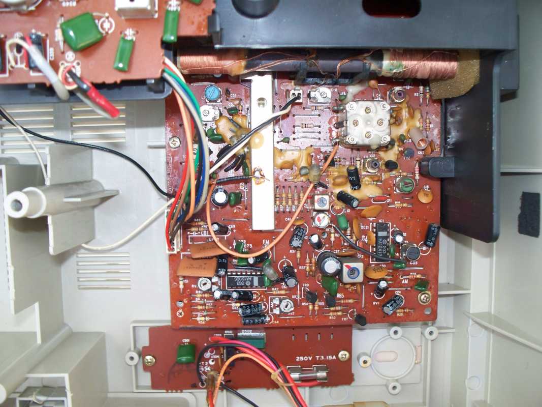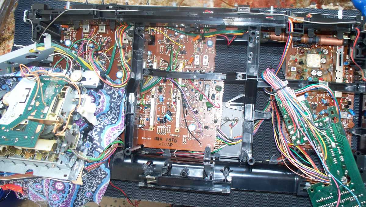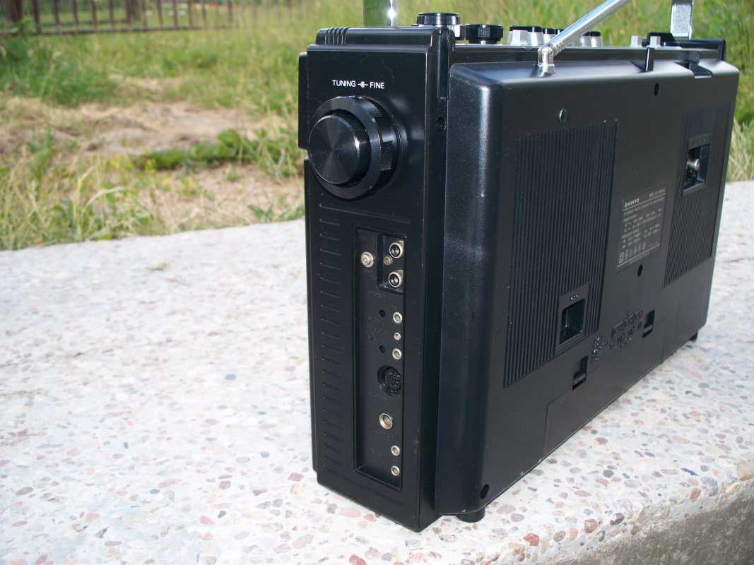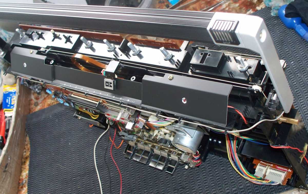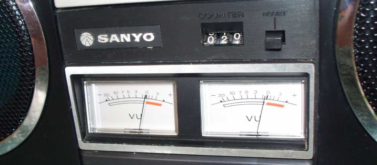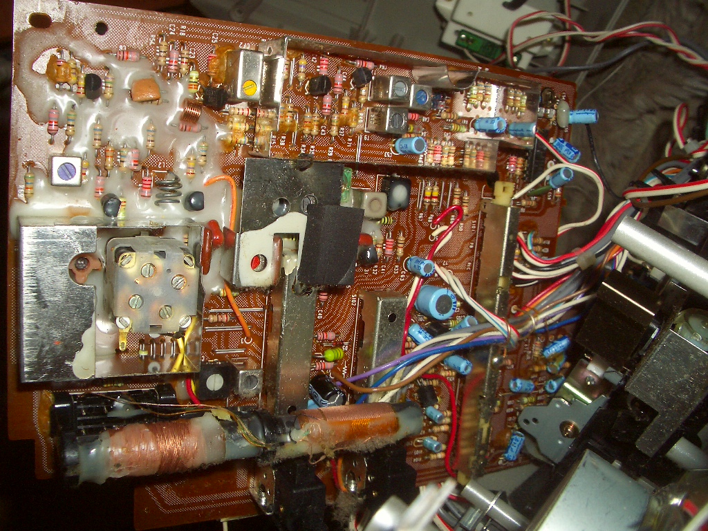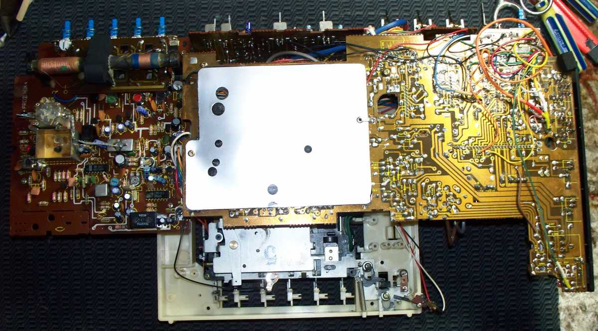 Когда взял её в руки, она мне показалась уж очень тяжёлой для своих размеров. Сняв крышку батарейного отсека, я увидел полный отсек батареек, хорошо что они ещё не потекли. Магнитола в неплохой косметике и как всегда пыль, грязь, замена пассиков и т.д. Снимаем заднюю часть, отвинтив аж 13 винтов, и вот оно, изобилие проводов и плат. Всё собрано очень компактно, фишки, пайка ну и конечно фирменное от SANYO, провода намоточное на штырьки. К слову, все фишки имеют номер. Лицевую часть снимать не стал, причин для этого не было. Обнаружил первую неисправность, отскочила дорожка от ножки транса. В ЛПМ царствует металл, пластмассы практически нету, за исключением шестерёнок. Пассик плоский, долезть до него проблематично, но самое не приятное одеть пассик счётчика ленты после или вернее это нужно делать в процессе установки ЛПМ на своё место. Как я уже писал всё очень компактно. Платы расположены одна над одной, между ними тканевая прокладка, видимо что бы пыль на неё собиралась. Плата приёмника в самом верху, приёмник работает очень качественно, приём отличный, также есть точная подстройка. Плата усилителя, ей больше не нашлось ни где места, и её прикрутили к ЛПМ, не очень удобно. Транс и плата пикового индикатора. . Шкала приёмника установлена под углом, стрелка со светодиодом, индикатор в своеобразном окошке, смотрится неплохо. Хочется отметит своеобразное крепление колонок, с мощным штырём сверху, механизмом защёлки внутри колонки, почти как капот в автомобиле. Колонки закрытого типа, внутри никакого наполнителя, кроме распорки, динамики 12 см и бумажные пищалки от SANYO. Механизм приёма кассеты схож с 939 Шарпом. Вот такая магнитолка, приятная в обращении, ни чего лишнего, всё на своих местах. Неплохой аппарат, с неплохим функционалом, система DOLBI, линейный вход с фоно корректором, лифт ЛПМ, автостоп, светодиодный индикатор, да и приятный внешний вид с изобилием хрома. По звуку ничего сверх естественного, для своего класса очень даже неплохо. SANYO C3D.