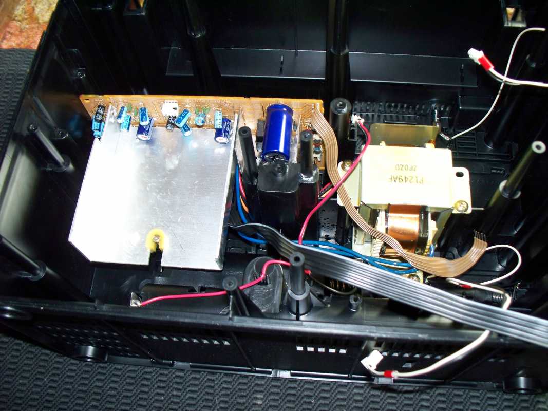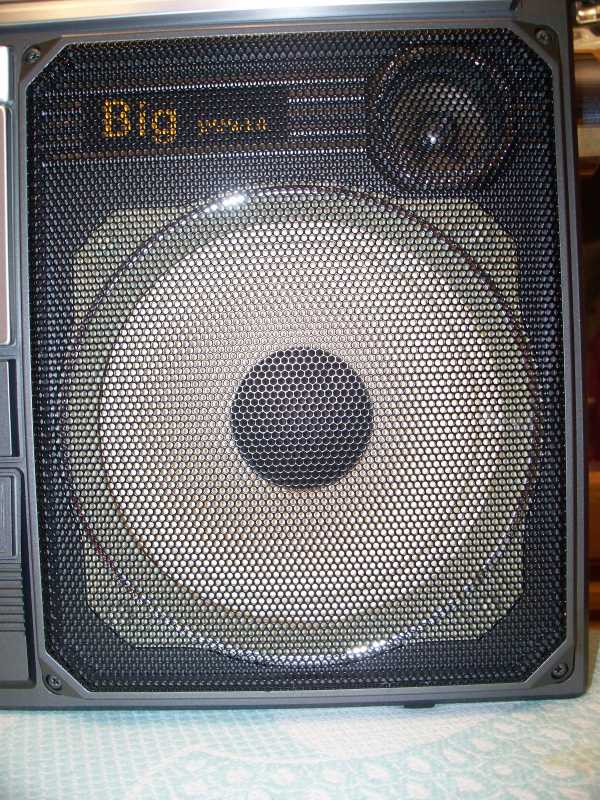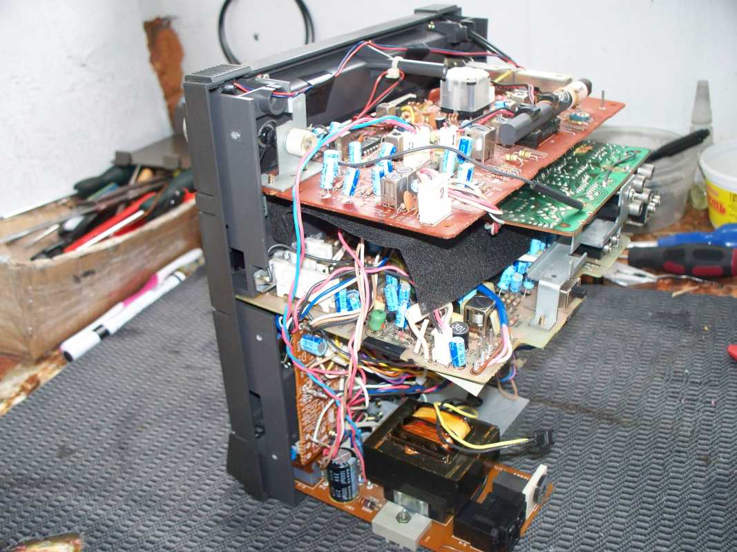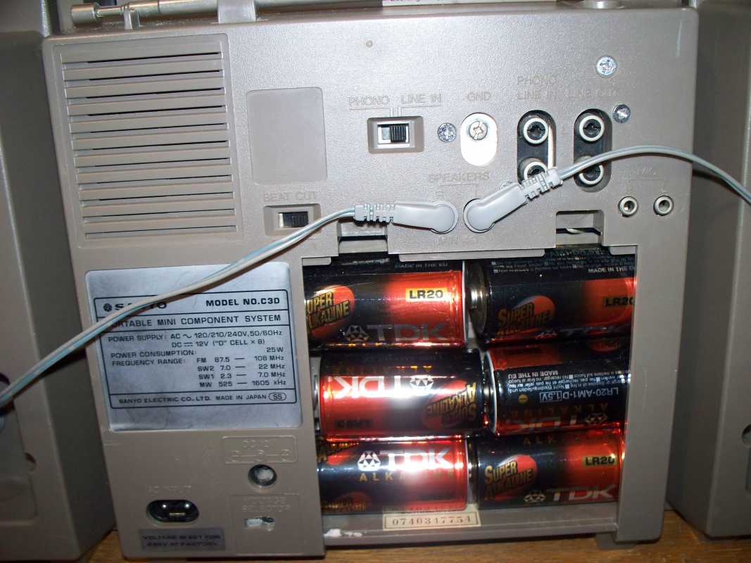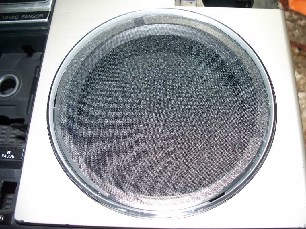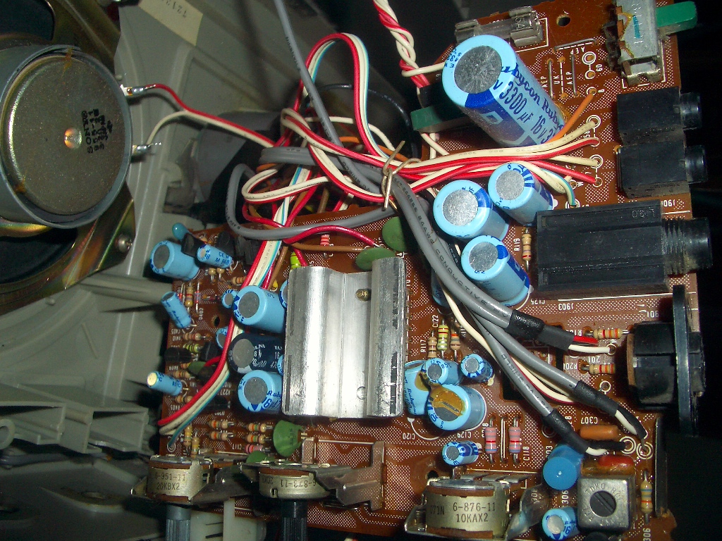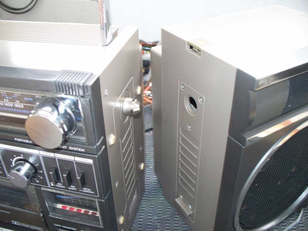 Когда взял её в руки, она мне показалась уж очень тяжёлой для своих размеров. Сняв крышку батарейного отсека, я увидел полный отсек батареек, хорошо что они ещё не потекли. Магнитола в неплохой косметике и как всегда пыль, грязь, замена пассиков и т.д. Снимаем заднюю часть, отвинтив аж 13 винтов, и вот оно, изобилие проводов и плат. Всё собрано очень компактно, фишки, пайка ну и конечно фирменное от SANYO, провода намоточное на штырьки. К слову, все фишки имеют номер. Лицевую часть снимать не стал, причин для этого не было. Обнаружил первую неисправность, отскочила дорожка от ножки транса. В ЛПМ царствует металл, пластмассы практически нету, за исключением шестерёнок. Пассик плоский, долезть до него проблематично, но самое не приятное одеть пассик счётчика ленты после или вернее это нужно делать в процессе установки ЛПМ на своё место. Как я уже писал всё очень компактно. Платы расположены одна над одной, между ними тканевая прокладка, видимо что бы пыль на неё собиралась. Плата приёмника в самом верху, приёмник работает очень качественно, приём отличный, также есть точная подстройка. Плата усилителя, ей больше не нашлось ни где места, и её прикрутили к ЛПМ, не очень удобно. Транс и плата пикового индикатора. . Шкала приёмника установлена под углом, стрелка со светодиодом, индикатор в своеобразном окошке, смотрится неплохо. Хочется отметит своеобразное крепление колонок, с мощным штырём сверху, механизмом защёлки внутри колонки, почти как капот в автомобиле. Колонки закрытого типа, внутри никакого наполнителя, кроме распорки, динамики 12 см и бумажные пищалки от SANYO. Механизм приёма кассеты схож с 939 Шарпом. Вот такая магнитолка, приятная в обращении, ни чего лишнего, всё на своих местах. Неплохой аппарат, с неплохим функционалом, система DOLBI, линейный вход с фоно корректором, лифт ЛПМ, автостоп, светодиодный индикатор, да и приятный внешний вид с изобилием хрома. По звуку ничего сверх естественного, для своего класса очень даже неплохо. SANYO C3D.