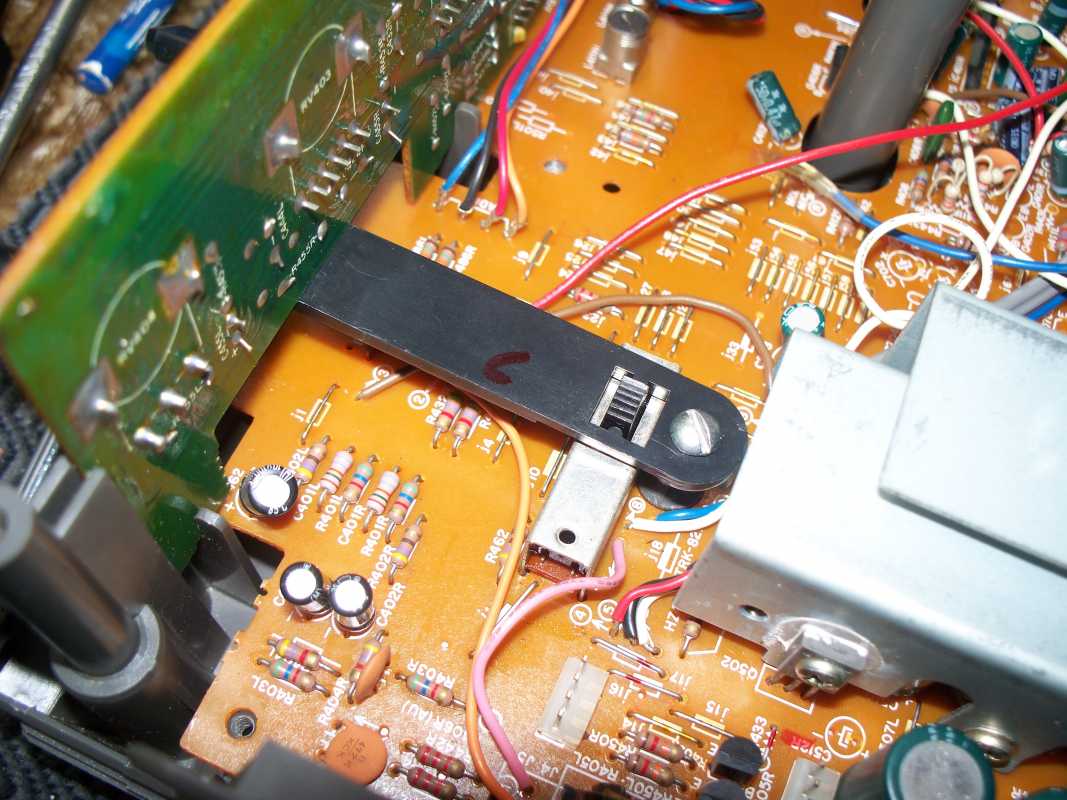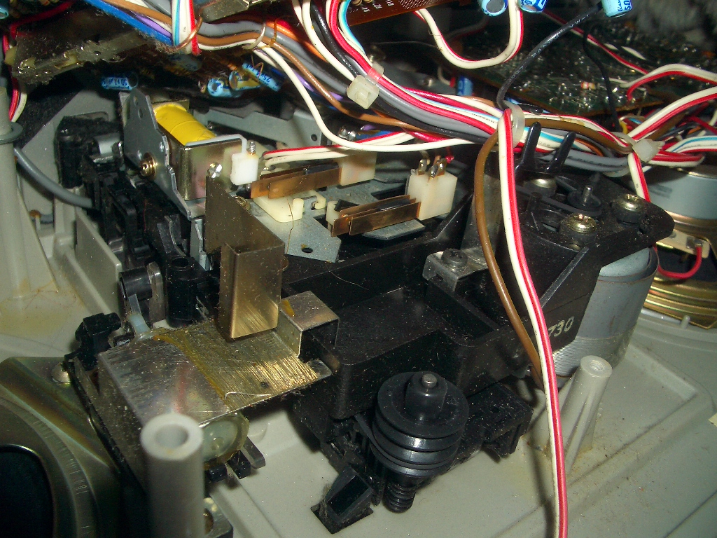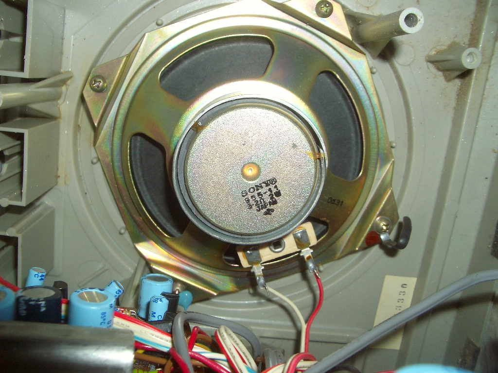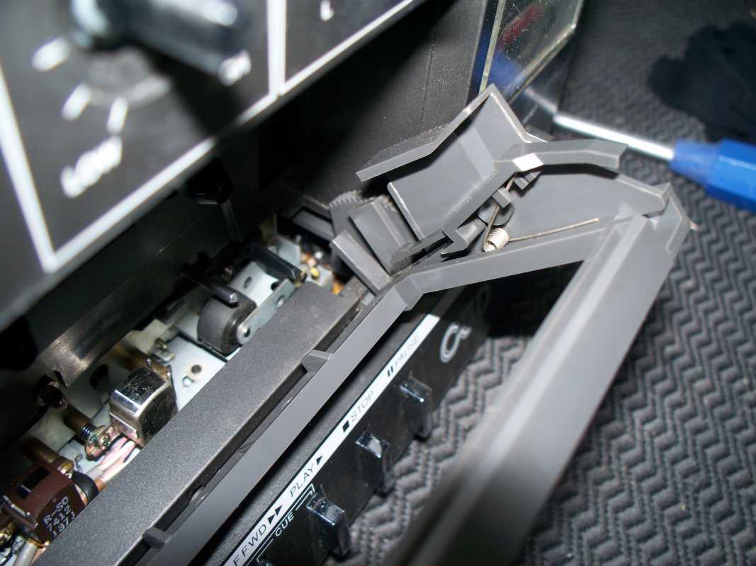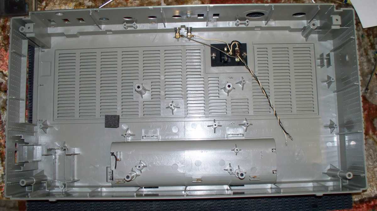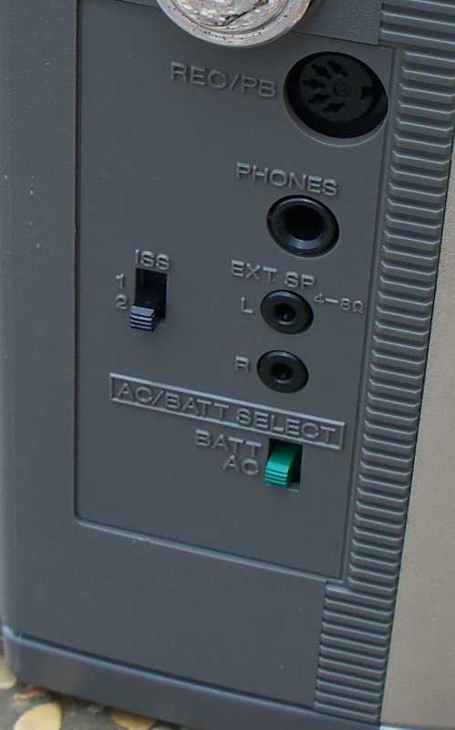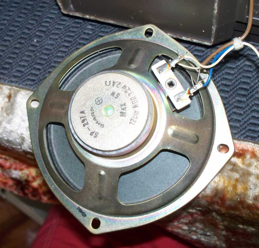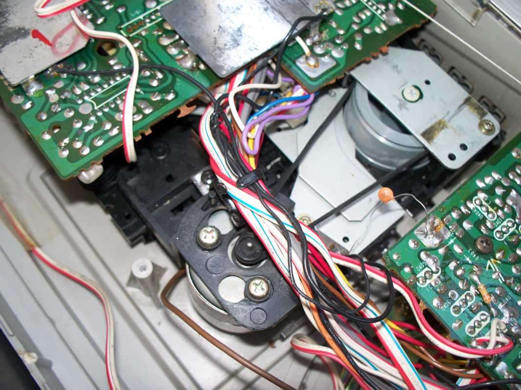 Когда взял её в руки, она мне показалась уж очень тяжёлой для своих размеров. Сняв крышку батарейного отсека, я увидел полный отсек батареек, хорошо что они ещё не потекли. Магнитола в неплохой косметике и как всегда пыль, грязь, замена пассиков и т.д. Снимаем заднюю часть, отвинтив аж 13 винтов, и вот оно, изобилие проводов и плат. Всё собрано очень компактно, фишки, пайка ну и конечно фирменное от SANYO, провода намоточное на штырьки. К слову, все фишки имеют номер. Лицевую часть снимать не стал, причин для этого не было. Обнаружил первую неисправность, отскочила дорожка от ножки транса. В ЛПМ царствует металл, пластмассы практически нету, за исключением шестерёнок. Пассик плоский, долезть до него проблематично, но самое не приятное одеть пассик счётчика ленты после или вернее это нужно делать в процессе установки ЛПМ на своё место. Как я уже писал всё очень компактно. Платы расположены одна над одной, между ними тканевая прокладка, видимо что бы пыль на неё собиралась. Плата приёмника в самом верху, приёмник работает очень качественно, приём отличный, также есть точная подстройка. Плата усилителя, ей больше не нашлось ни где места, и её прикрутили к ЛПМ, не очень удобно. Транс и плата пикового индикатора. . Шкала приёмника установлена под углом, стрелка со светодиодом, индикатор в своеобразном окошке, смотрится неплохо. Хочется отметит своеобразное крепление колонок, с мощным штырём сверху, механизмом защёлки внутри колонки, почти как капот в автомобиле. Колонки закрытого типа, внутри никакого наполнителя, кроме распорки, динамики 12 см и бумажные пищалки от SANYO. Механизм приёма кассеты схож с 939 Шарпом. Вот такая магнитолка, приятная в обращении, ни чего лишнего, всё на своих местах. Неплохой аппарат, с неплохим функционалом, система DOLBI, линейный вход с фоно корректором, лифт ЛПМ, автостоп, светодиодный индикатор, да и приятный внешний вид с изобилием хрома. По звуку ничего сверх естественного, для своего класса очень даже неплохо. SANYO C3D.