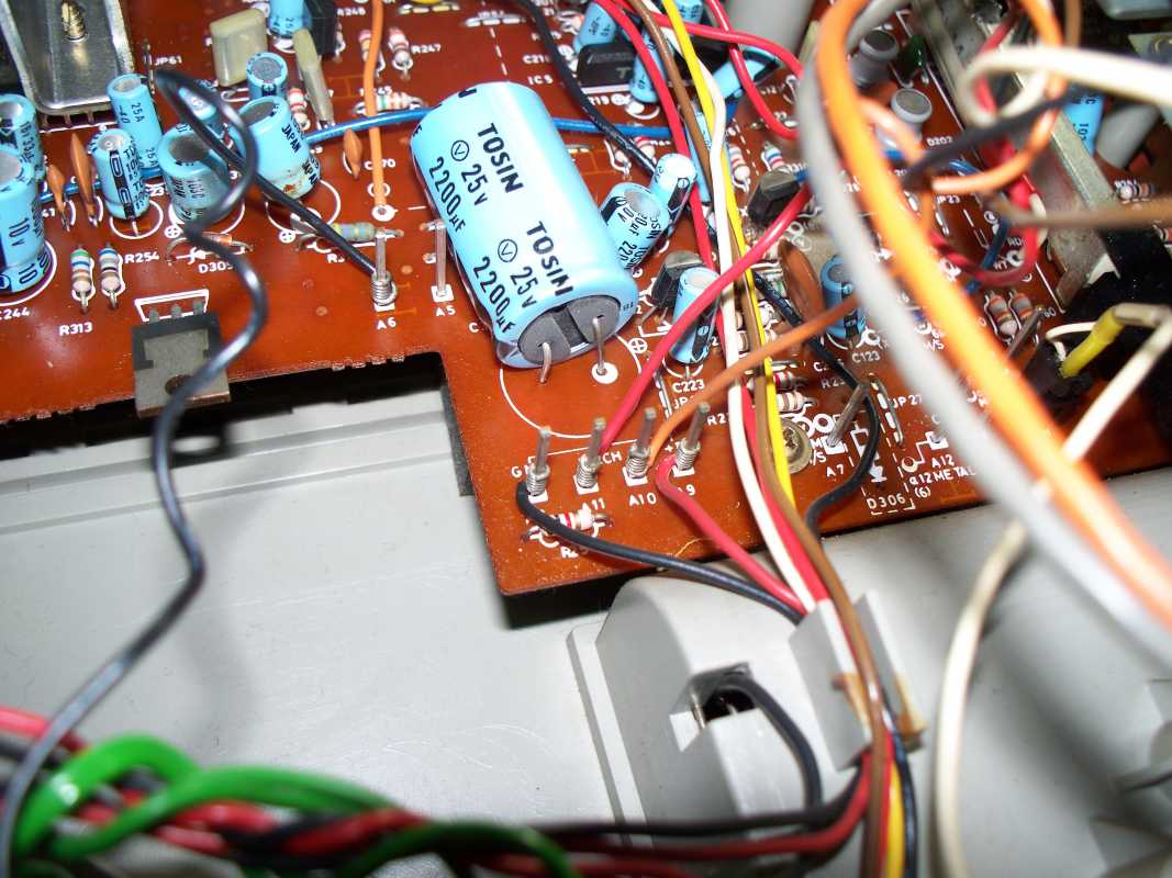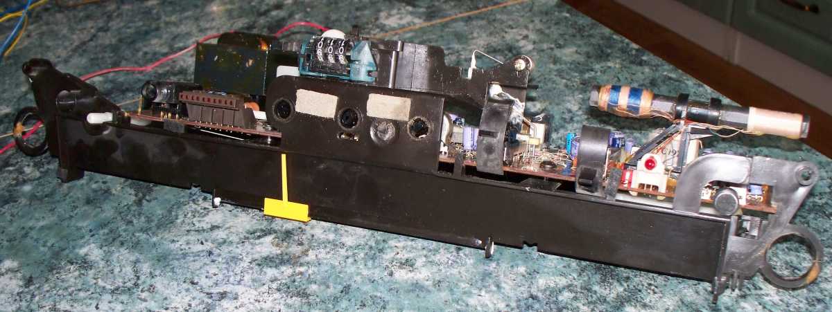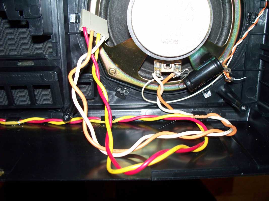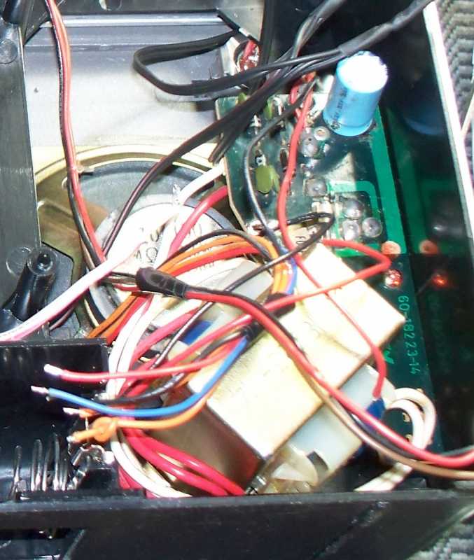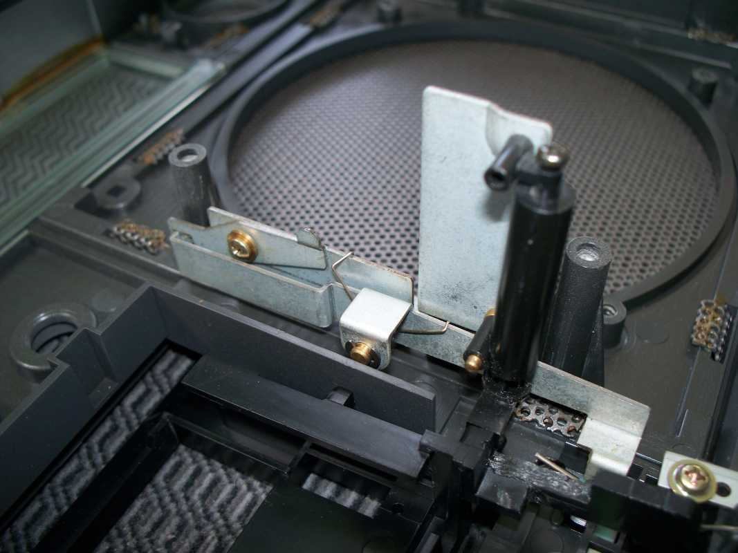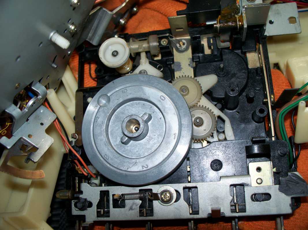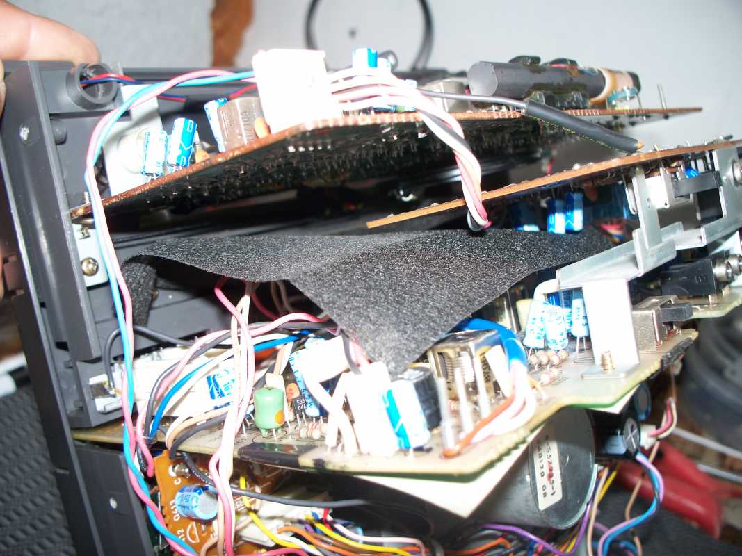 Когда взял её в руки, она мне показалась уж очень тяжёлой для своих размеров. Сняв крышку батарейного отсека, я увидел полный отсек батареек, хорошо что они ещё не потекли. Магнитола в неплохой косметике и как всегда пыль, грязь, замена пассиков и т.д. Снимаем заднюю часть, отвинтив аж 13 винтов, и вот оно, изобилие проводов и плат. Всё собрано очень компактно, фишки, пайка ну и конечно фирменное от SANYO, провода намоточное на штырьки. К слову, все фишки имеют номер. Лицевую часть снимать не стал, причин для этого не было. Обнаружил первую неисправность, отскочила дорожка от ножки транса. В ЛПМ царствует металл, пластмассы практически нету, за исключением шестерёнок. Пассик плоский, долезть до него проблематично, но самое не приятное одеть пассик счётчика ленты после или вернее это нужно делать в процессе установки ЛПМ на своё место. Как я уже писал всё очень компактно. Платы расположены одна над одной, между ними тканевая прокладка, видимо что бы пыль на неё собиралась. Плата приёмника в самом верху, приёмник работает очень качественно, приём отличный, также есть точная подстройка. Плата усилителя, ей больше не нашлось ни где места, и её прикрутили к ЛПМ, не очень удобно. Транс и плата пикового индикатора. . Шкала приёмника установлена под углом, стрелка со светодиодом, индикатор в своеобразном окошке, смотрится неплохо. Хочется отметит своеобразное крепление колонок, с мощным штырём сверху, механизмом защёлки внутри колонки, почти как капот в автомобиле. Колонки закрытого типа, внутри никакого наполнителя, кроме распорки, динамики 12 см и бумажные пищалки от SANYO. Механизм приёма кассеты схож с 939 Шарпом. Вот такая магнитолка, приятная в обращении, ни чего лишнего, всё на своих местах. Неплохой аппарат, с неплохим функционалом, система DOLBI, линейный вход с фоно корректором, лифт ЛПМ, автостоп, светодиодный индикатор, да и приятный внешний вид с изобилием хрома. По звуку ничего сверх естественного, для своего класса очень даже неплохо. SANYO C3D.