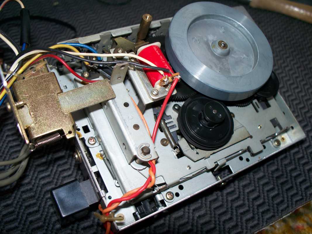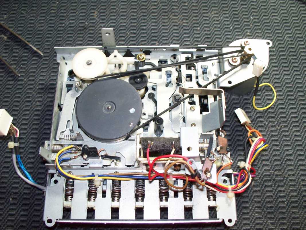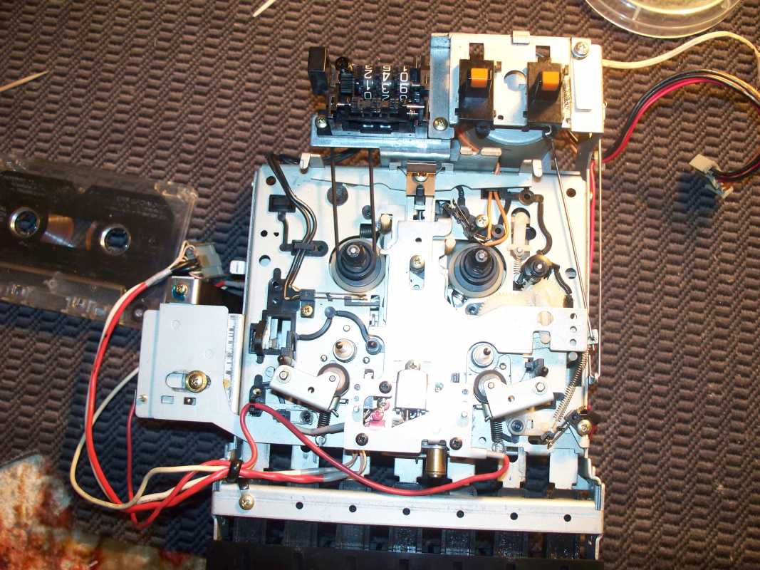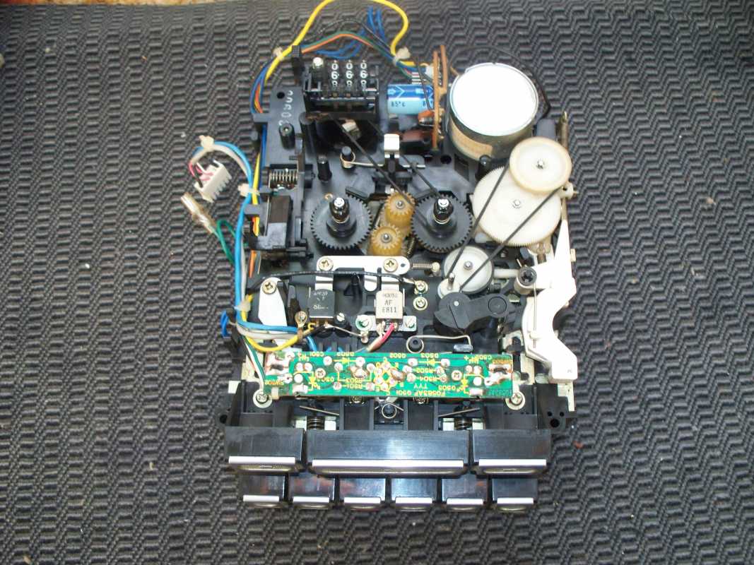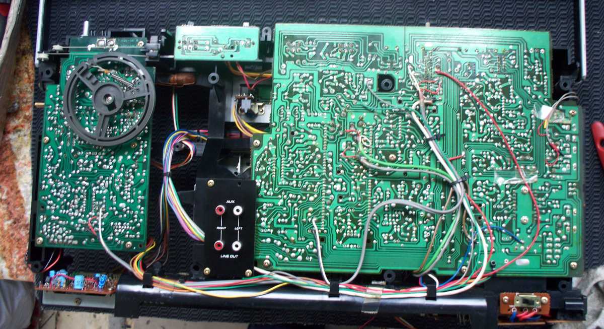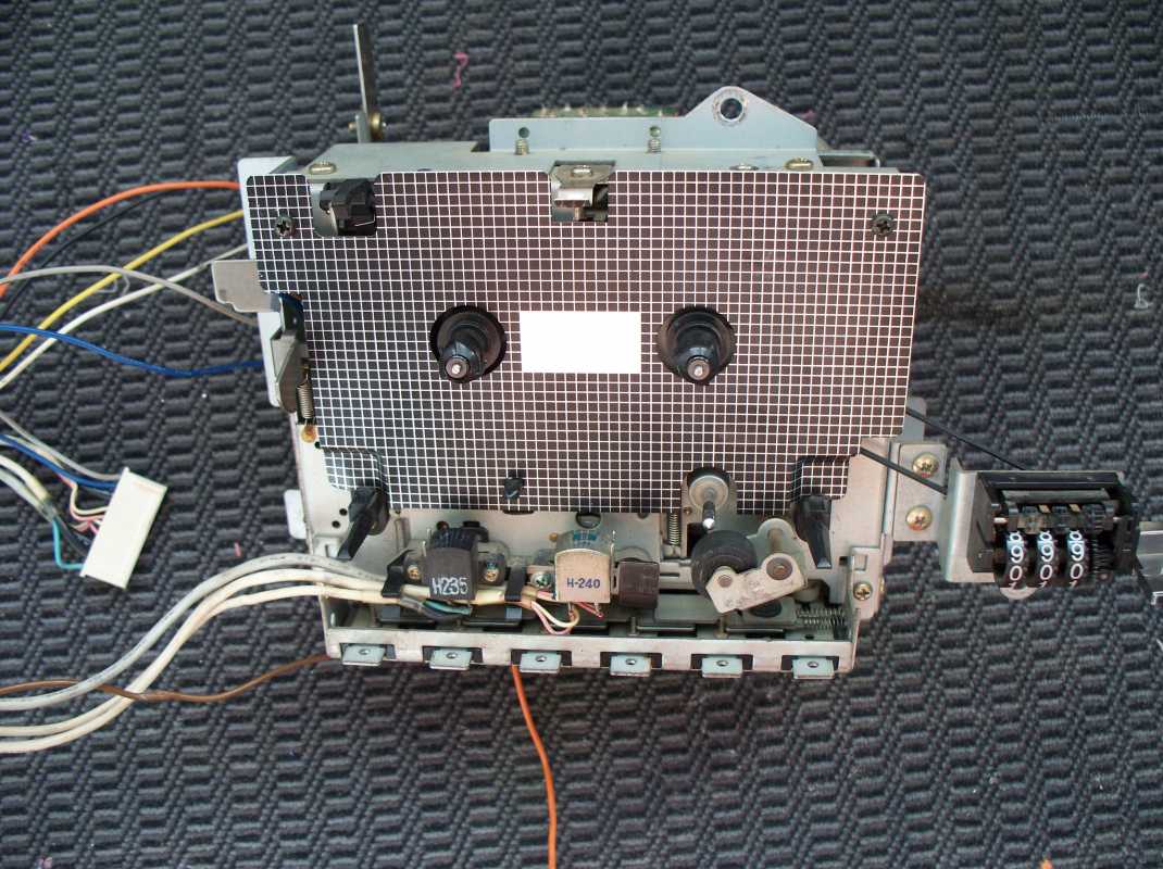 Конкурс приурочен к дню смеха, подходит к концу, а желающих поучаствовать в нём что то нету. Вот я решил представить обзор магнитолки с обманчивой внешностью. AIWA CS-600E, в моём распоряжении их оказалось аж две штуки. Раньше не приходилось с ними иметь дело, хотя у знакомых они были, но мнения разных людей были настолько противоречивы, одни утверждали что это хорошо поющая магнитола, другим она не нравилась, и по этому когда появилась возможность её приобретения, не задумываясь её купил и вторую на всякий случай, пускай будет. Магнитола досталась мне в хорошей косметике, с рабочим приёмником, но неисправным ЛПМ, со слов бывшего владельца этого аппарата, в ней был неисправен моторчик, и якобы он какой то мудрёный. Почему то мне казалось, что эта магнитола должна быть напичкана платами, проводами и т.д., но на деле оказалось всё наоборот, я даже несколько был разочарован разобрав её. Сняв переднюю часть, а этот аппарат разбирается именно так, я увидел грустную картинку, полупустая, с двумя маленькими платами верхней компоновки. Плата приемника. Основная плата скромных размеров. Извлекаются эти две платы с корпуса вместе, и шкала приёмника с механизмом настройки и ЛПМ. По середине лицевой части магнитолы расположено информационное табло с пиковым светодиодным индикатором, диодом питания, FM стерео и записи. Все органы управления находятся на передней части. Снизу корпуса расположен трансформатор, и почему то он и плата выпрямителя разнесены по разным углам, соединены между собой приличным жгутом проводов. На плате два предохранителя, первичный и вторичный, не часто такое встретишь. В центре расположен ЛПМ. Извлекается из корпуса просто, но вот дальше, все провода припаяны к плате, и лишние движения паяльником делать не хотелось, пришлось устранять все проблемы будучи привязанным проводами. Лентопротяжка сделана добротно, имеет систему с Soft-touch управлением, по вине которой, как мне кажется и перегорает большое количество моторчиков., большой маховик тон вала, мощный рычаг включения записи. Головки закрыты своеобразным защитным экраном. Мотор действительно оказался перегоревший, но ничего необычного в нём я не заметил, мотор от фирмы MATSUSHITA, 12V, левого вращения. Пришлось снять мотор со второй магнитолы, на неё потом что то подберу. После установки нового мотора, замены пассиков, запустил ЛПМ, и здесь всплыла ещё одна неисправность, подмотка кассеты не работала, а причина оказалась в треснутой резинке на ролике. Долго ломал голову, что же туда поставить, ведь пресловутые колечки из сантехнического магазина туда не поставишь. И вот выход был найден. Взял старый прижимной ролик подходящего размера, снял резинку, отрезал узенькую полоску, и всё под моточный ролик готов, ставим его на место и всё прекрасно работает. Передняя часть изнутри тёмно синего цвета, на ней расположены динамики и микрофоны, хочется отметить качественные Вч динамики, Вч 14 см, общая мощность 14Wt, что в сочетании с функцией DSL (Dynamic Super Loudness) выдают отличный и сочный бас. Кстати, решётки динамиков тоже темно синего цвета, вокруг них также присутствует обрамление синего цвета, плюс хром, смотрится очень оригинально. Шкала приёмника реализована не очень удачно, она закрыта не съёмным стеклом, и что бы почистить там пыль, пришлось повозиться. Так же были изготовлены новые насадки на