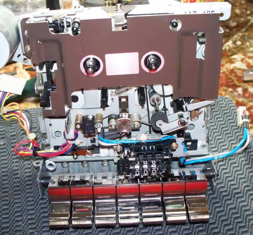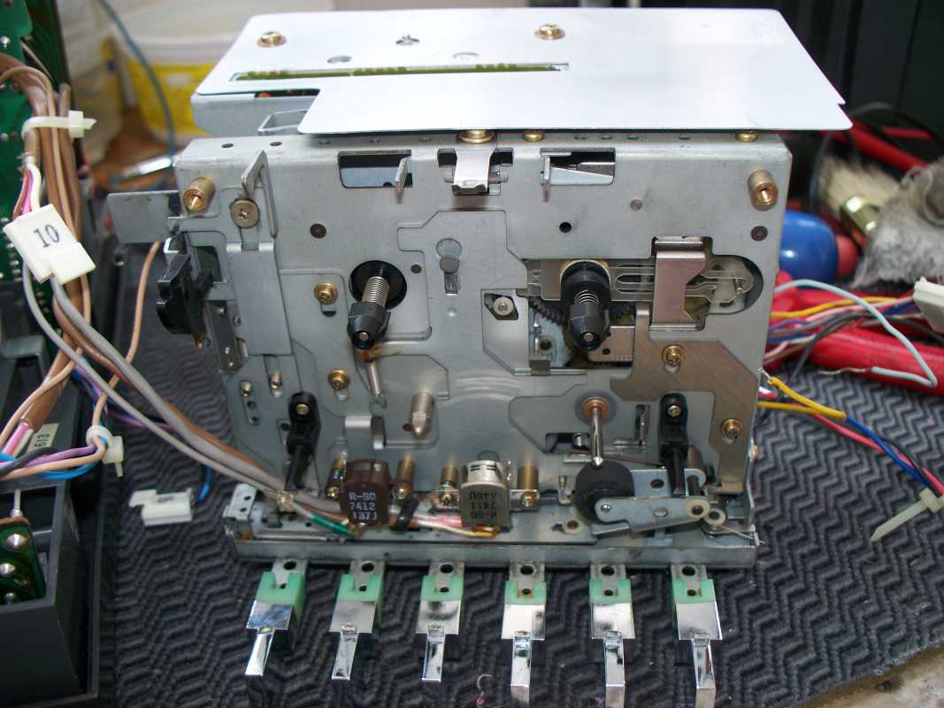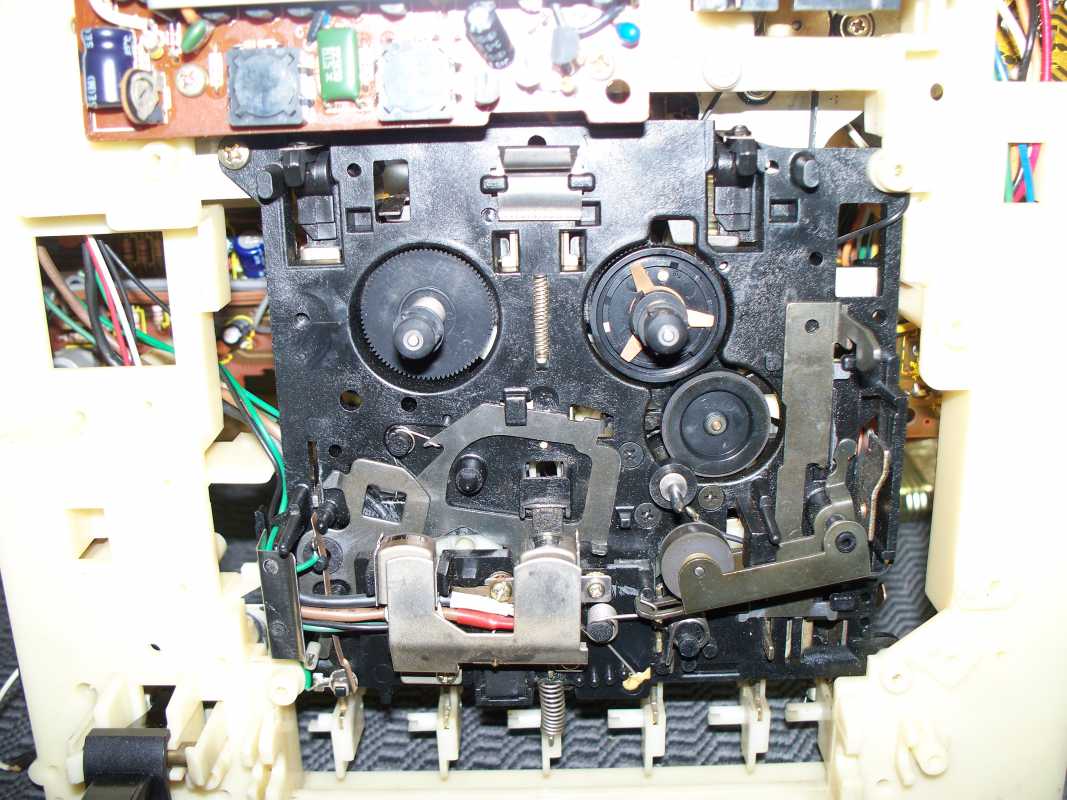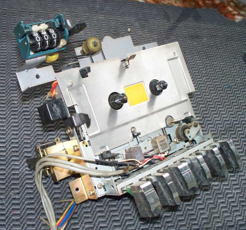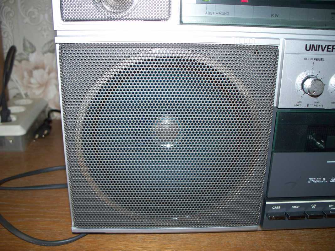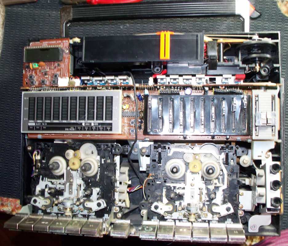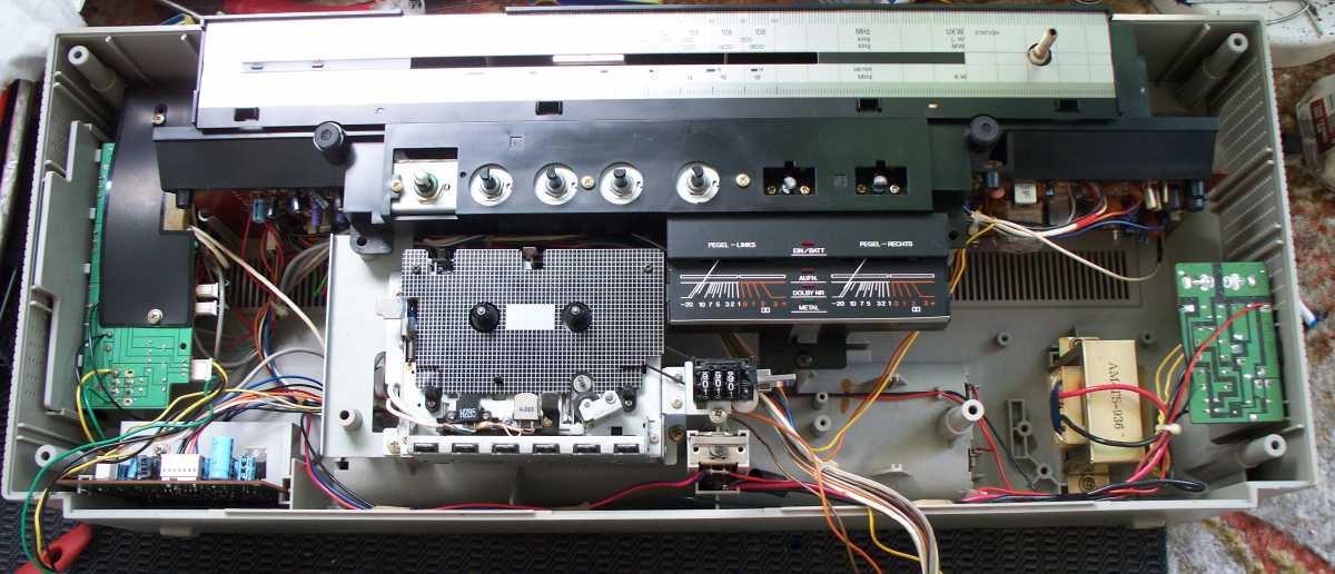 Естественно, без детские болячек никуда, это нормально решил я, и вскрыл её. Внутри всё цивильно, много разъёмов и конечно пайки.Конструктора здесь потрудились на славу. Не смотря на свои внушительные размеры внутри всё довольна компактно. Огромные платы. Плата приёмника с внушительным колесом на КПЕ. Вид плат с обратной стороны. ЛПМ полностью из железа, пассик плоский, всё надёжно, мощный мотор, магнит поиска песен. Передняя часть, где находятся шестерёнки закрыта декоротивной крышкой.Очень оригинально смотрится.Кнопки ЛПМ с Soft-touch управлением. Мощный моховик тон вала. Усилитель низкой частоты расположен на отдельной плате. Солидных размеров радиатор, не оставляет сомнения, что запас мощности у неё имеется. Естественно для мощной магнитолы нужен подходящий источник питания. Механизм открывания подкассетника с демпфером поршневого типа. Приятная мелочь, все пластиковые стекляшки с эффектом натурального стекла, с зеленоватым оттенком. Не обошлось в этой магнитоле и без так модных в те времена стрелочных индикаторов. Они здесь не совсем обычно исполнены, индикаторы открытого типа, стекло закрывающее их расположено на передней части корпуса. Ну и наверно не нашлось больше нигде места для информационных диодов, их размести в стрелочниках. Очень оригинально исполнено управление магнитолой, правда маленькими ползунками не очень удобно пользоваться. На передней панели магнитолы расположены динамики. Они от Японского производителя-16см, в оригинальном голубом цвете. Вч бумажные-5см. Качество звука конечно на высоте. Так же имеется не плохой набор разьёмов. В предыдущих моделях UNIVERSUM, начинка встречалась от SANYO, здесь же от HITACHI и Matsushita. Universum никогда не делал сам технику. Это просто торговая марка, принадлежащая торговой компании Quelle. Внутри их аппаратов, может быть что угодно. Из наворотов есть всё необходимое: линейный вход, DOLBI, расширение стерео, выбор типа плёнки(метал), расширение стерео, поиск песен, автостоп, ручная по канальная регулировка уровня записи. Довольно приятный в обращении экземпляр, с приятным звуком и внешностью. Только положительные эмоции при использовании этой магнитолы. UNIVERSUM SENATOR 2226
