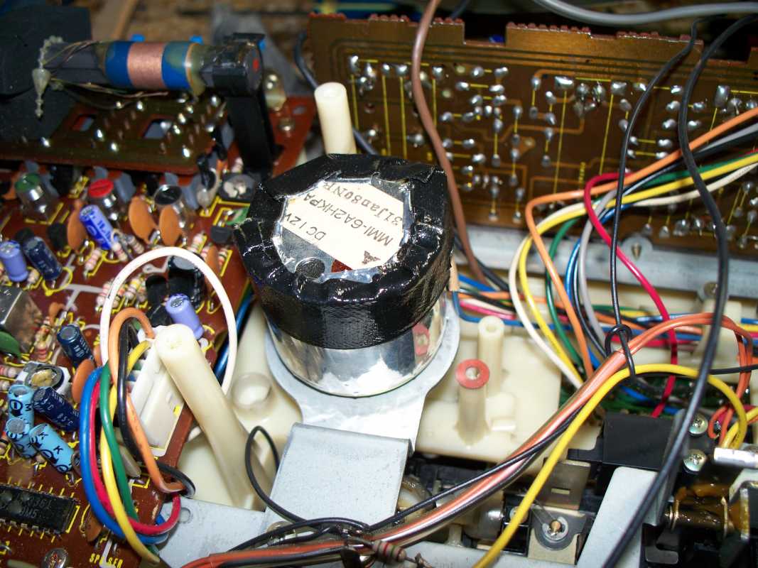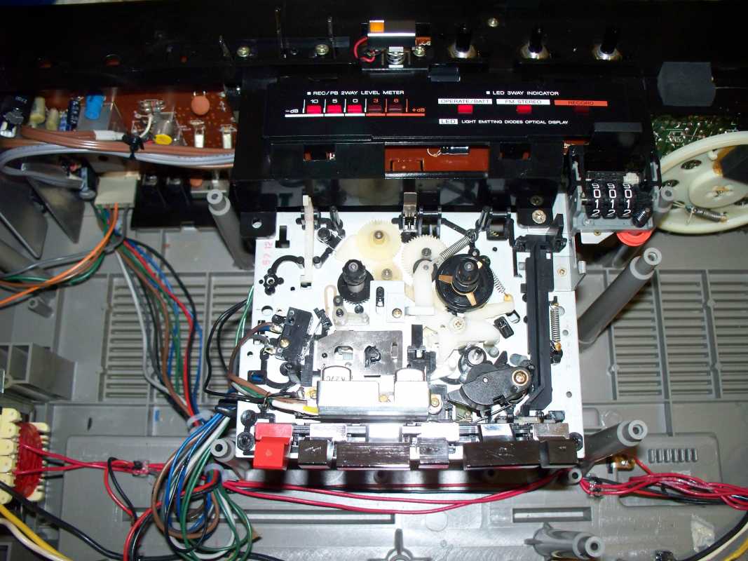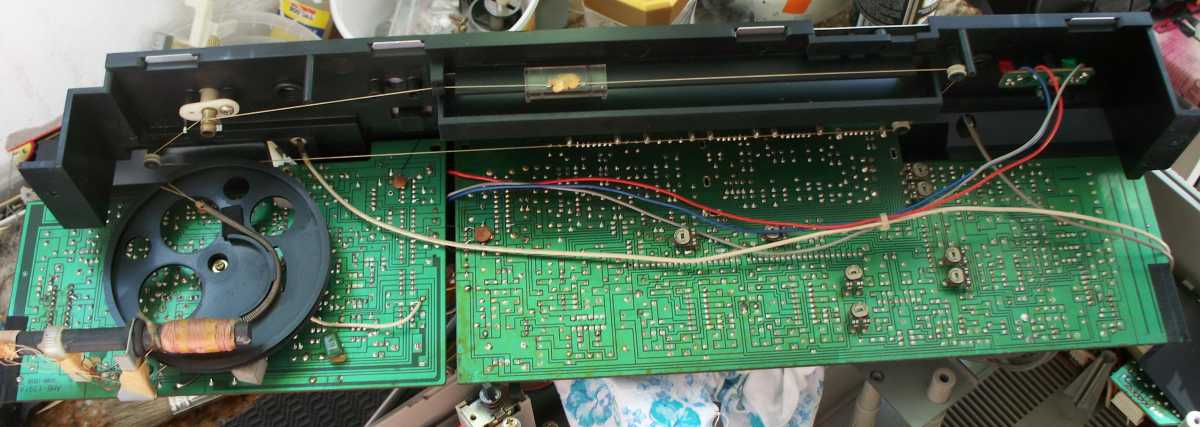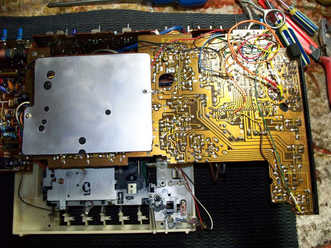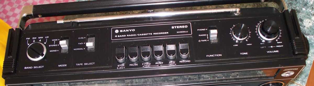 Многие аппараты от SANYO не уважают в плане починки, вот и я прочитав инфу в нете, честно говоря, испугался. А рассказ мой будет о магнитоле SANYO M4500LU. В прочем обо всём попа рядку. Ещё года два назад, когда только начал увлекаться винтажными аппаратами, попала ко мне данная магнитолка. Опыта ни какого, аппарат полу рабочий, да и чистка не мешала бы. Залез я в интернет, в надежде что то найти о данном аппарате, и надо же было мне наткнуться на статейку, где мастер честно говоря не лесно отзывался об данном аппарате, дескать, магнитола вообще не ремонтируется, всё ужасно сделано и т.д. и т.п. После долгих раздумий, я всё же решил не рисковать, и моя магнитолка была продана. После этого ещё парк раз в поле моего зрения попадал этот аппарат, и каждый раз , я проходил мимо. Но вот симпатичный дизайн не давал мне покоя, да и опыта вроде немного прибавилась, и вот Sanyo снова у меня. Честно говоря никаких сложностей в этой магнитоле я не заметил, да много проводов, да нет разъёмов, тем интереснее процесс. Предлагаю вам убедится в правоте моих слов, не зря я назвал свой обзор « Ложная паника». И так начинаю разбирать эту ужасную и страшную магнитолу. Выворачиваем винты на задней крышке и снимаем её, не забыв отпаять провода питания. Пришлось подписать, куда они были припаяны, так как обозначения отсутствуют. Сразу же несколько слов о блоке питания. Внушительных таких размеров и тяжёлый, работает с двумя видами напряжения, здесь же плата выпрямителя. На решётки наклеена ткань, что бы предотвратить попадание во внутрь пыли. Ещё на ней расположена телескопическая антенна и блок с переключателем разъёмом дня подключения внешней антенны. А вот и крышка в зборе, очищена от пыли грязи, и совсем навесным. Что же там внутри.Сразу в глаза бросается экран на плате, ну и конечно же провода, и ни каких разъёмов. К слову провода очень ломкие, пару неосторожных движений и провод отломается в месте пайки, по этому прежде чем лесть глубже, я всё сфоткал. После детального изучения внутренностей, пришёл к выводу, что вся начинка извлекается из корпуса, нужно только выкрутить винты, они все розового цвета, отпаять левый микрофон и динамики. Вся начинка извлекается из передней части на каркасе, включая ЛПМ. Две раздельные платы, все дорожки лужёные. С левой стороны плата приёмника. Радио имеет диапазон FM по 108 Mhz, что не часто встретишь на этой модели. Вот фото передней части плат с ЛПМ. Что бы заменить пассики, нужно немного поработать паяльником, отпаять провода которые идут на контактную группу, и мотор. Провода с головок отпаивать не стал, а просто открутил их, так проще. Вот ЛПМ во всей красе, ни чего сложного, выполнен он из металла, отдельные элементы из пластика. Пассика три штуки и ещё один на счётчик ленты. Мотор имеет внутреннюю плату стабилизации. На передней части расположились динамики, они 12 см и пищалки по 5см. Сетки немного поржавели, по этому их пришлось снять, отпескоструить, и покрасить заново. Не смотря на скромный размер динамиков, магнитола играет относительно не плохо, с ненавязчивым басом. Так же здесь установлены стрелочные индикаторы, без них магнитола бы имела совсем другой вид, смотрятся они оригинально, на фоне чёрного корпуса. Стрелочники, это слабое место этой модели, практически у всех магнитол, хоть один да не работает, мне же повезло, они полностью рабочие. На 