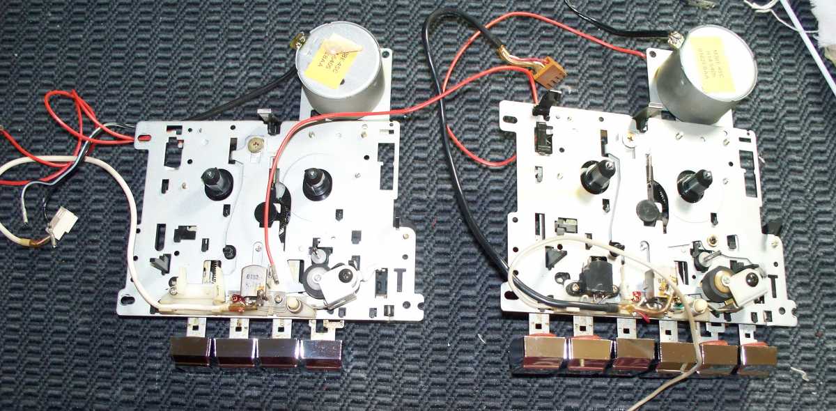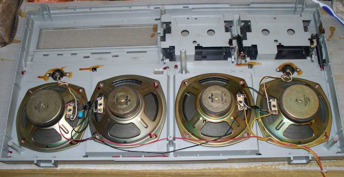 Но если честно, как то ещё раньше листая страницы нашего форума увидел это магнитолу и загорелся желанием её иметь в своей коллекции. На помощь пришёл Польский аукцион, но в первый раз она была продана за приличные деньги, и желающих было не мало, и вот как говорится вторая попытка, всё на том же аукционе, грязная, потрёпанная жизнью с недостающими кнопками. Ну и пусть решил я, будет над чем поработать. А сейчас небольшой отчёт о приведении в чувства этой красавицы. Запасся всем необходимым и вперёд. Сразу скажу магнитола тяжёлая и приличных размеров. Снимаю переднюю часть и передо мной все прелести начинки , много пайки, разъёмов и проводов. Сразу вынимаю всё с корпуса, что бы отмыть его. Вот он сверкает после мойки. Начинка магнитолы собрана на каркасе отдельными платами и легко демонтируется. Платы усилителя и приёмника. На передней крышке остаются динамики, плата система FSAP поиска песен и стрелочные индикаторы. На всех элементах корпуса отлит вот такой логотип. Патом берусь за ЛПМ, он небольших размеров, но сделан добротно, обилие металла, мощный маховик тон вала, пассик всего один. ЛПМ с системой "Soft touch." Красного цвета это электромагнит системы поиска. Два пассика на счётчик ленты. Всё просто и надёжно. На клавишах два информационных светодиода. Блок питания выдаёт 15 вольт, но вот по мощности слабоват для неё, на большом звуке магнитола начинает захлёбываться, и по этому, по совету одного мастера пришлось установить дополнительный конденсатор на выходе . В отсек для батареек устанавливается 10 элементов питания. Даже сохранились специальные футляры. Динамики заслуживают отдельного внимания, огромные- 20 см от фирмы FOSTER, тяжёлые, магниты не большие, бумага на диффузорах толстая, почти как картон, даже пришлось силиконам промазать подвесы, что бы мягче были, большие серебристые купола. ВЧ-5.2 см, бумажные. Плата FSAP, с информационными светодиодами поиска песен. Шикарные стрелочники. Крепление ручки к корпусу, довольно своеобразное. Ну а теперь над чем пришлось поработать отдельно. Отсутствовала кнопка открывания крышки кассеты, пришлось изготовить другую. Также на стрелке шкалы приёмника были отломаны штырьки крепления нити, до меня её пытались приклеить клеем. Я сделал проще, впаял два штырька и одел нить. Ну и на одной антенне был отломан кончик, тоже пришлось изготовить новый, всё же оригинальная антенна лучше левой. Хочется немного остановится на внешности этой магнитолы. Смотрится она довольно оригинально, такой монстр, не слабых размеров. Множество хромированных переключателей скомпоновано на передней части, огромные сетки динамиков , придают ей особый шик. Ну и конечно не обошлось без так модных в те времена стрелочных индикаторов. На одном сайте даже прочитал, что Корейские технари , при создании этой магнитолы, одним глазом посматривали на знаменитый JVS M 90. Ну а теперь немного о функционале , на борту она имеет – Soft touch управление кассетной декой, функцию SLEEP, расширение стерео, LOUDNES, система FSAP поиск до пяти треков,о чём гласит гордая надпись , стрелочные индикаторы, по канальная регулировка уровня записи, автостоп, также воспроизводит ленту металл и т.д.Ну и конечно в арсенале неплохой набор разъёмов для подключения различных устройств. Вот такая магнитола от Корейского производителя, занимает не последнюю позицию в моей ко