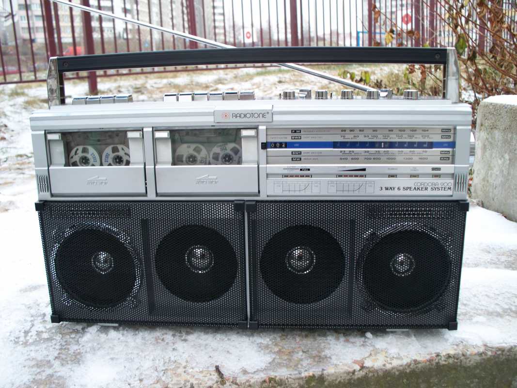 Представляю Вашему вниманию обзор магнитолы от торговой марки RADIOTON, под брендом CORDOBA 900, по-моему существует ещё пару аналогичных магнитол под другими брендами. Аппарат не из дешёвых балалаек, сделан добротно, качественный пластик, ничего не скрипит и т.д., вся электронная начинка от Matsushita, а был у меня ещё RADIOTONE RRC-468L с начинкой от SANYO. Заглянем во внутрь этого девайса. Снимается передняя часть вместе с динамиками. Всё просто, без фанатизма, скомпоновано на одной основной плате, также плата индикации и плата управления. На передней части расположено аж шесть динамиков. Два в хромированном ободке, очень красиво смотрится. Четыре динамика он знаменитой фирмы Foster + два Вч, они пьеза. Трансформатор не очень большой, но со своей ролью справляется отлично, даже на большом звуке светодиод питания не моргает. ЛПМ, это вершина простоты, всё просто и надёжно, никаких тебе непонятных рычажков и пружинок, работает всё чётко и бесшумно, один плоский пассик, регулировка скорости вращения производится прямо в моторчике. Отдельного внимания заслуживают пиковые индикаторы, очень красочно, правда для отличной их работы пришлось заменить один подстроечнный резистор. Крышки кассет с демпферным механизмом вакуумного типа, со временем колечко на поршеньке становится дубовое, и плавности хода от такого механизма добиться трудно. Также в этом аппарате есть одна интересная функция, микширование между двумя деками. Хочется сказать, что данная магнитола относится к несложному классу, и поэтому каких либо сложных изысков у неё нету, по весу около 6 кг, приличных размеров, но главный её конёк это внешность, хорошим звуком она тоже не обделена. Выпускалась примерно в первой половине 80х, по функционалу имеет линейный вход, работает с лентой метал, автостоп, ускоренная запись и т.д. RADIOTON CORDOBA 900. |