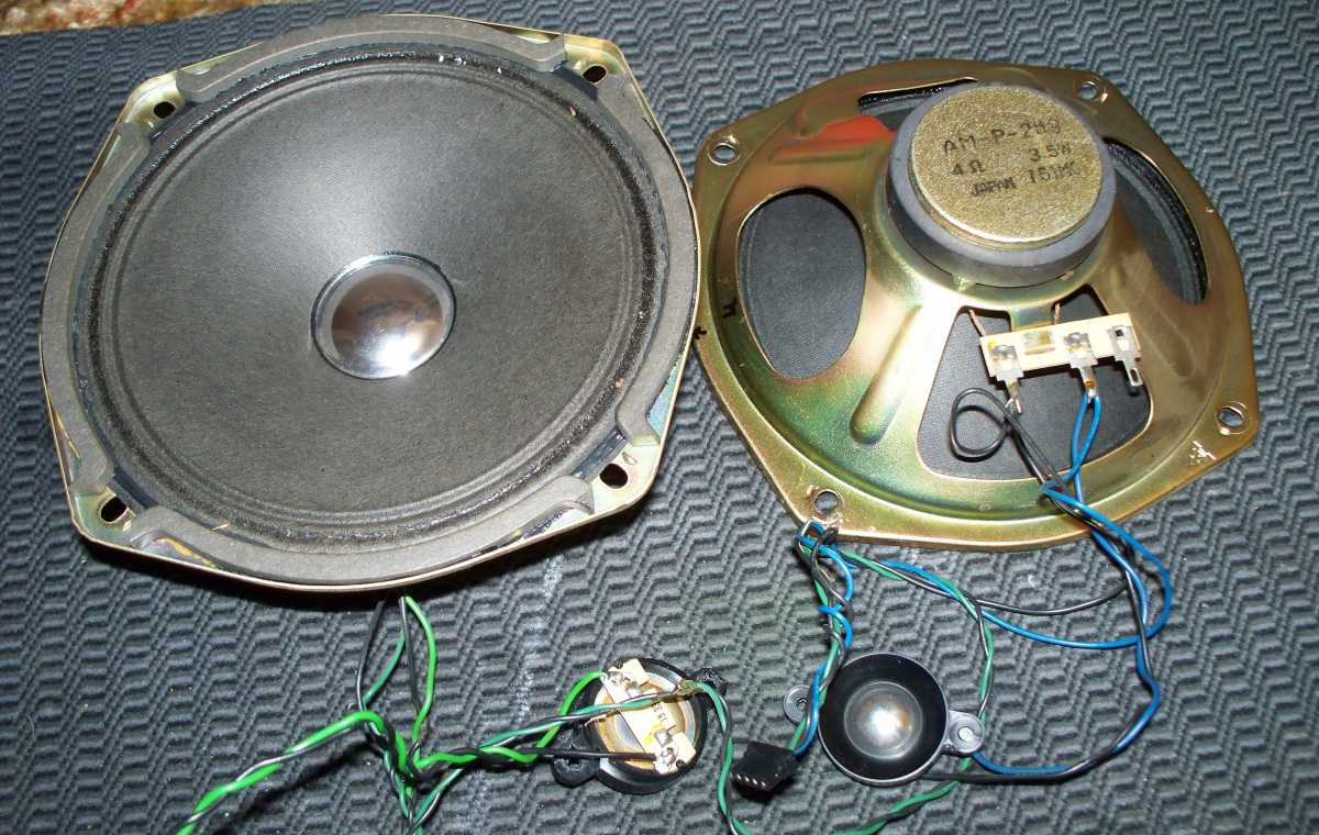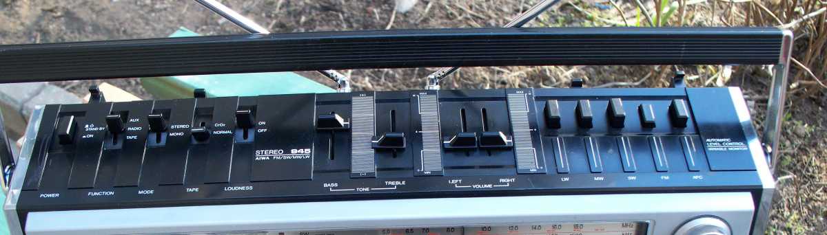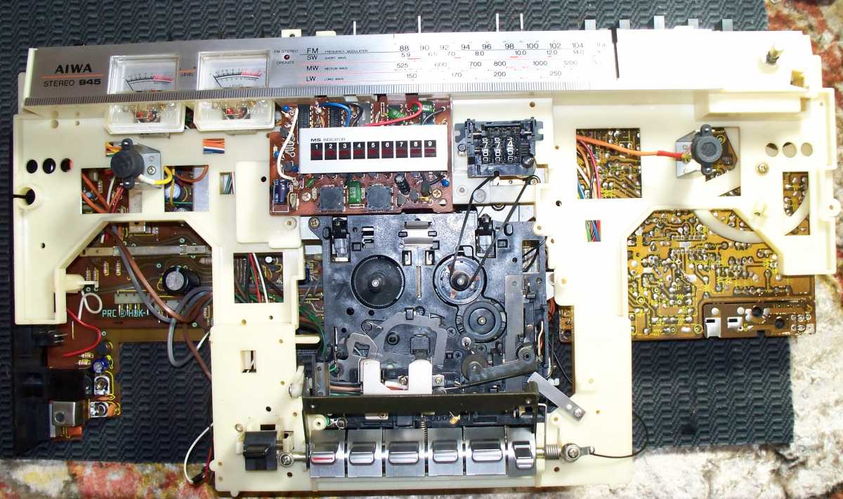 Сегодня мой обзор будет посвящён магнитоле Aiwa TPR-945Е, магнитола родом из далёкого 1978, аппарат в виду небольшого тиража встречается не часто, очень качественно сделан, и это не удивительно, ведь в те годы не экономили, и уж если что то творили, то качественно и на века. Дизайн в стиле 70х, всё продумано до мелочей, всё радует глаз, особенно мне понравилось ,как реализовано управление магнитолой, все переключатели и ползунки расположены с верху, и не совсем обычном исполнении, ну и конечно здесь присутствуют, так модные в те времена стрелочные индикаторы. Но хватит лирики, предлагаю вам самим убедится, в том, что это стоящий аппарат, способный удивить своим дизайном и звуком даже самого требовательного пользователя. Я не буду описывать весь процесс приведения этого аппарата до соответствия, мелкие ремонты и т.д, вам это будет не интересно, а расскажу и покажу лишь из чего же сделана эта красавица. И так начнём. Выворачиваем винты, и снимаем заднюю крышку, на ней остаются антенны и транс, (после рассмотри её отдельно). Что же мы видим, даже бегущим взглядом можно определить, что технари постарались, а именно в плане звука. Защитный экран на плате, транс полностью помещён в кожух, даже мотор ЛПМ в капсуле. Внутри магнитолы всё перемешалось, любимая компоновка 70х, множество проводов и мало разъёмов. Всё скомпоновано на каркасе, выкручиваю винты, и пытаюсь всё извлечь наружу, но не тут то было, после детального осмотра, убеждаюсь, что нужно снять крышку кассеты, она крепится двумя винтами к металлической планке.Вот как всё выглядит после демонтажа. Вид с переди. Вид сзади. Огромная основная плата, множество проводов, пайки. ЛПМ расположен под этой платой. Слева плата приёмника. Сверху плата управления звуком и переключения диапазонов приёмника. По середине плата управления системой MUSIC SENSOR, иными словами системы поиска песен на 9 треков. Интересно реализовано включение этой функцией. Там нету ни какого переключателя, есть обычные контакты, закреплённые на ЛПМ и клавиша включения на передней панели, при нажатии на неё срабатывает защёлка, аналогичная устанавливается на клавише паузы, клавиша фиксируется и контакты замыкаются. Нажатием красной кнопочки на центральной панели вы можете выбрать какой трек по счёту вам нужен, что будет отображать светодиод под определённым номером. После извлечения каркаса с электроникой, я был немного удивлён, увидев динамики во всей их красе, они всего лишь 12 см, но это ещё не показатель, ведь играет магнитола очень и очень не плохо. Снимаю динамики, и вижу в каком они идеальном состоянии, ни намёка на пыль и грязь, мастика которой пропитаны подвесы, спустя 35 лет, просто идеально сохранила свои качества. А всё дело в том, что за металлической сеткой натянута ещё и тонкая капроновая, которая и предотвратила попадание мусора.Хотелось бы немного остановится на конструкции динамика, обратите внимание на сам диффузор и на хромированный купол. Ну и, вот какими проводами, а вернее с каким сечением провода, должны подключаться динамики, и это скорее всего не с проста использовали в этом аппарате. Твитера бумажные 4 см, сняв их, также снимаются декоративные накладки на лицевой панели. Ну а сейчас переходим к задней крышке, я обещал остановится на ней подробнее. Что же здесь интересного, начнём с трансформатора, он приличных раз