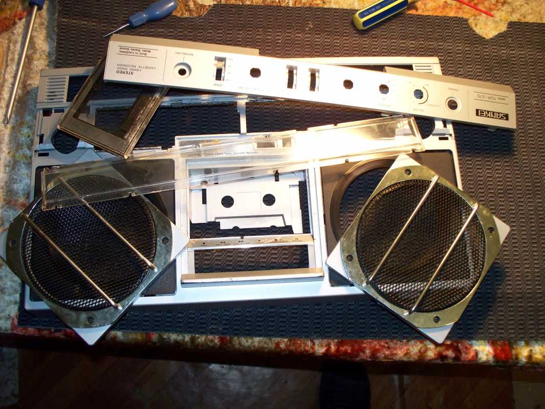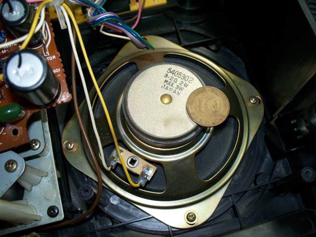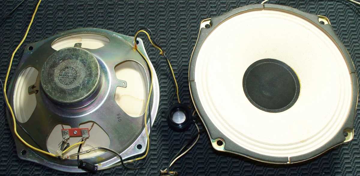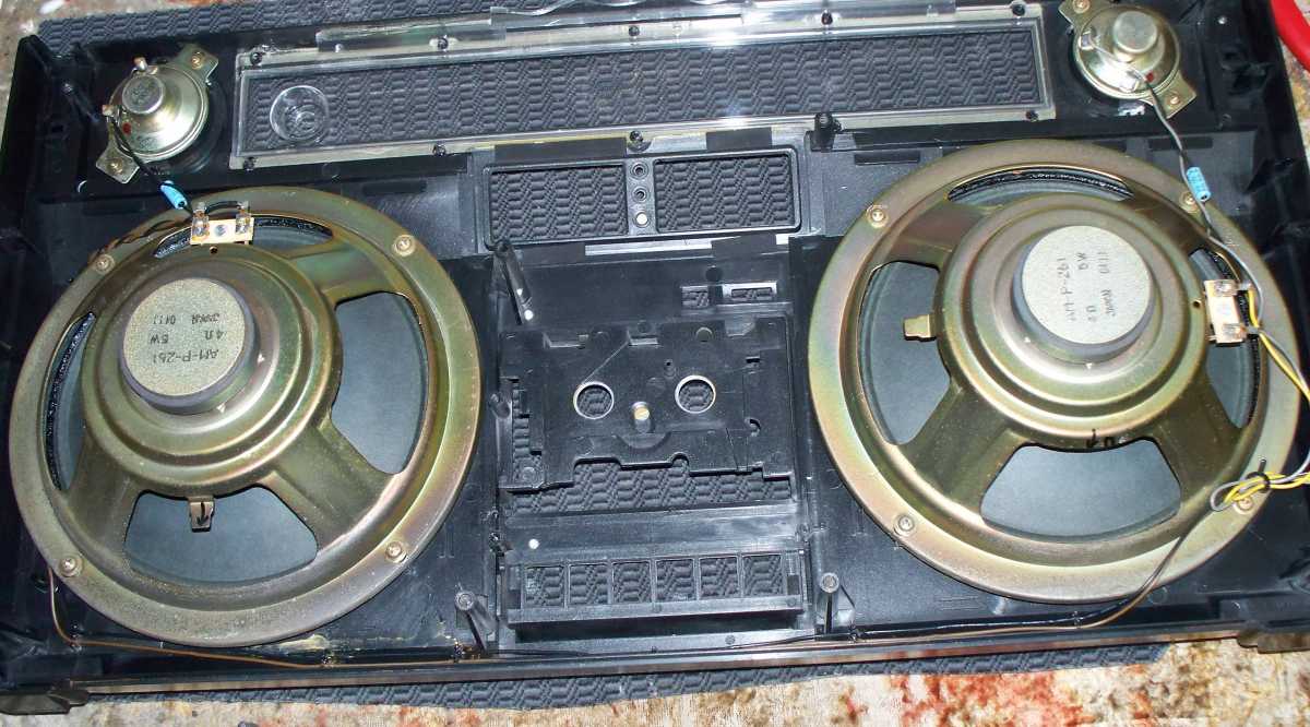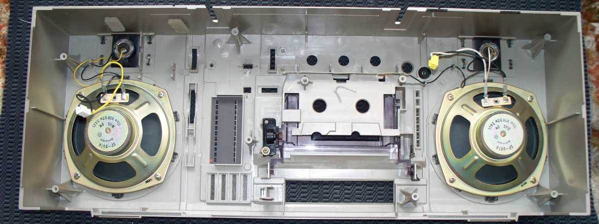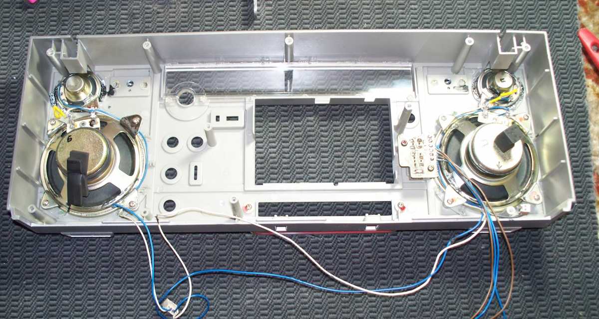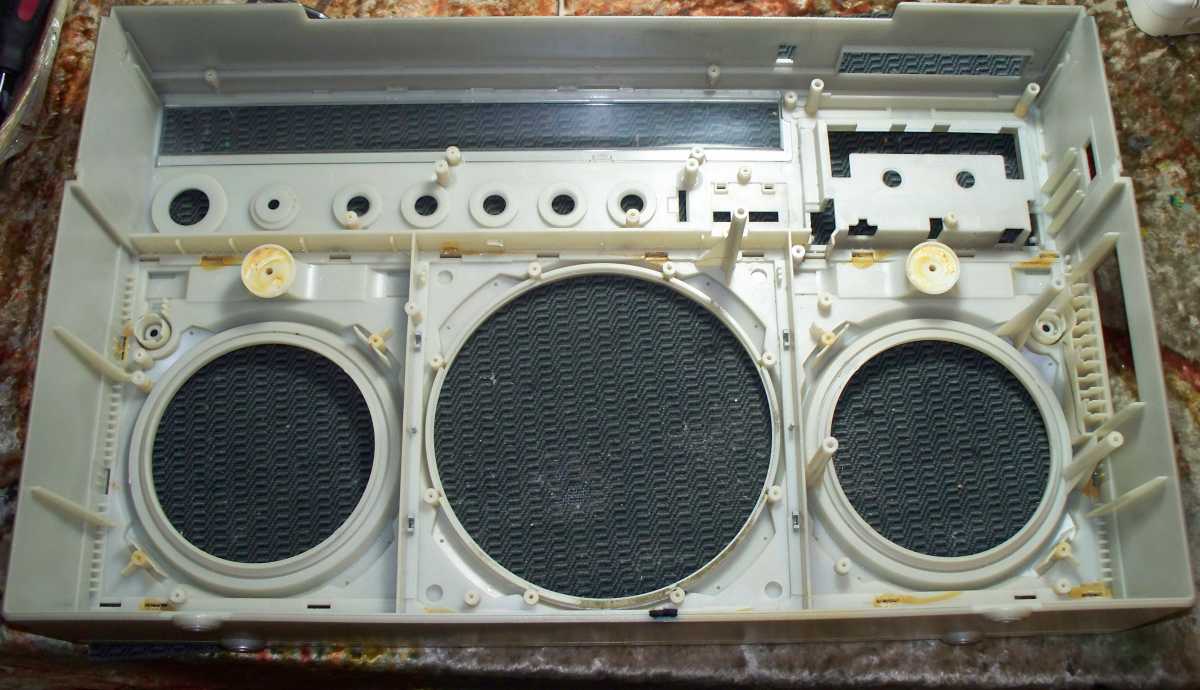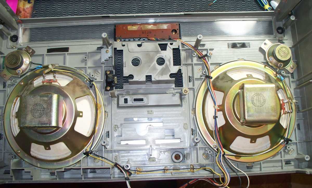 Как и все Шарпы разбирается он очень просто. Сзади выкручиваются винты, и снимается лицевая часть с динамиками. Динамики Шарповские, применяются во многих аппаратах этой марки, диаметром 16см, белого цвета.