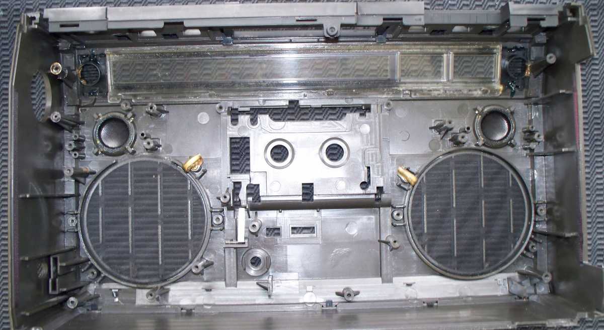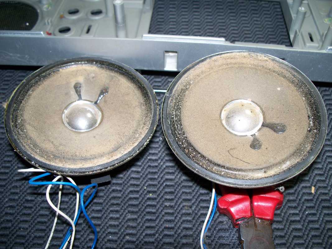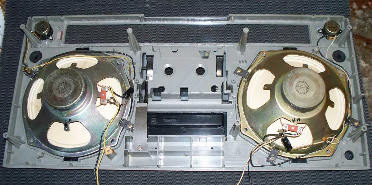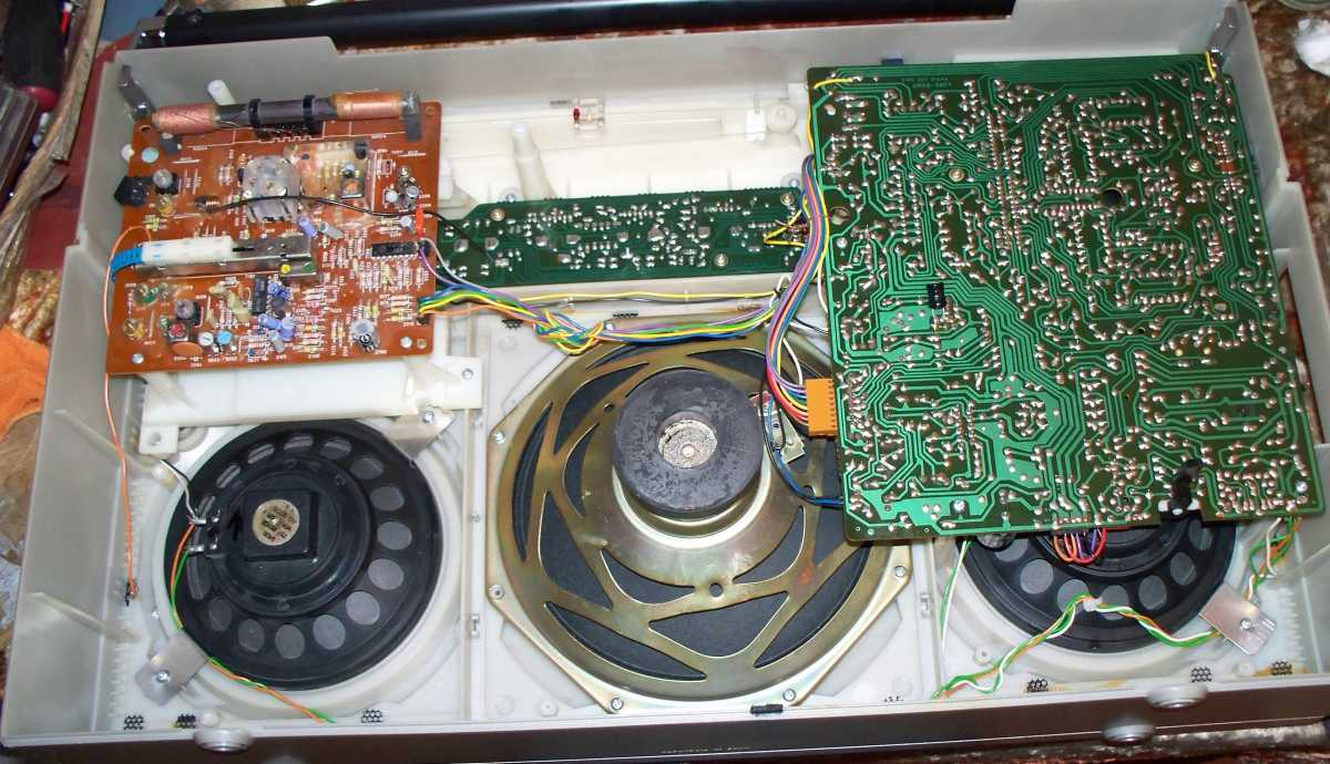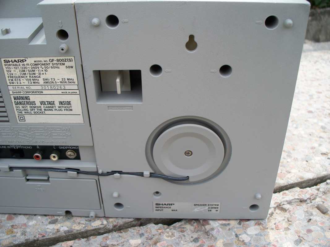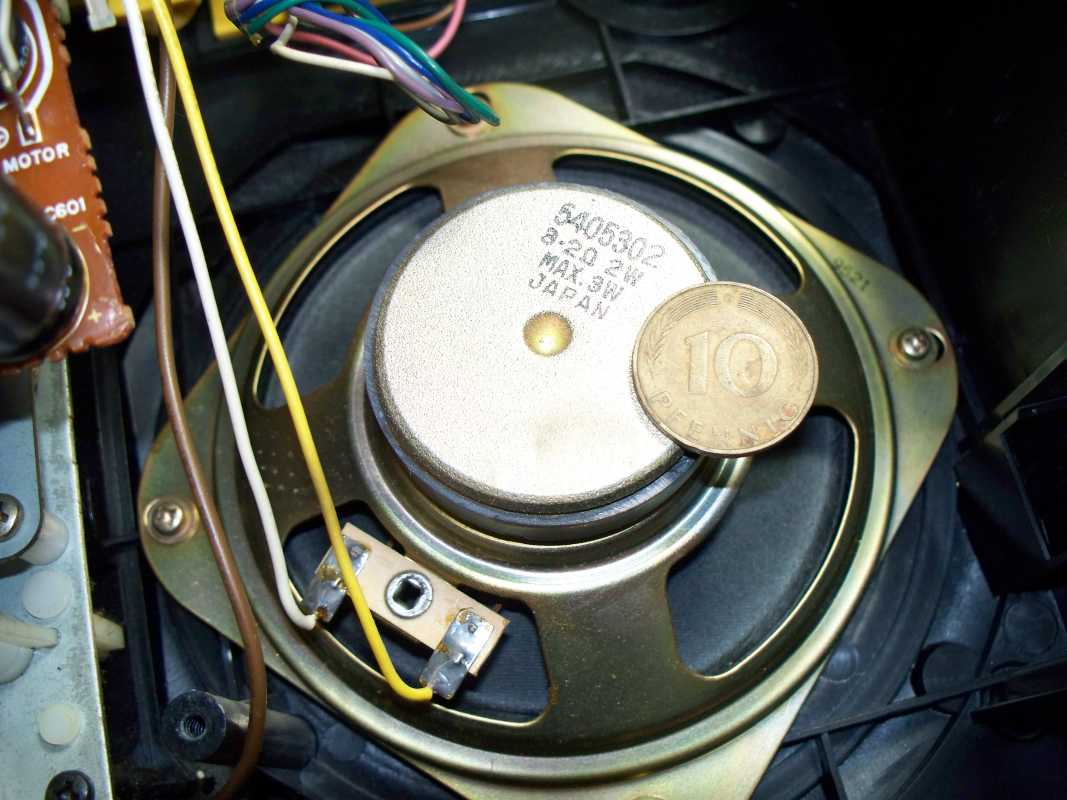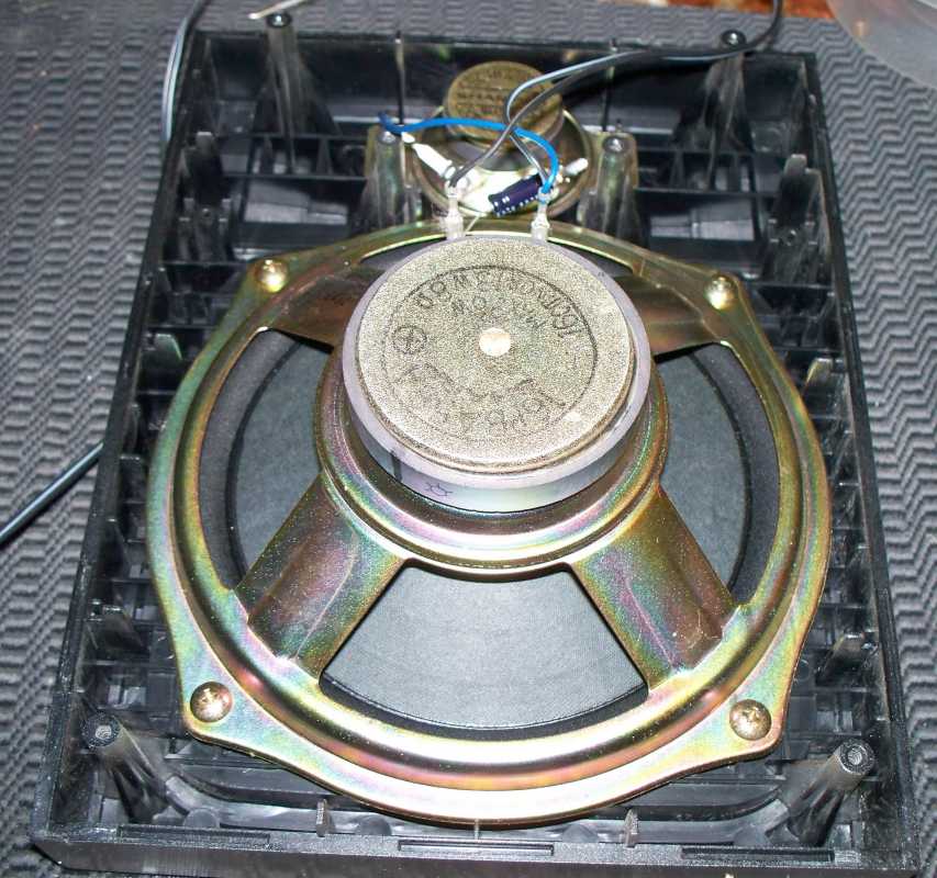 Как и все Шарпы разбирается он очень просто. Сзади выкручиваются винты, и снимается лицевая часть с динамиками. Динамики Шарповские, применяются во многих аппаратах этой марки, диаметром 16см, белого цвета.