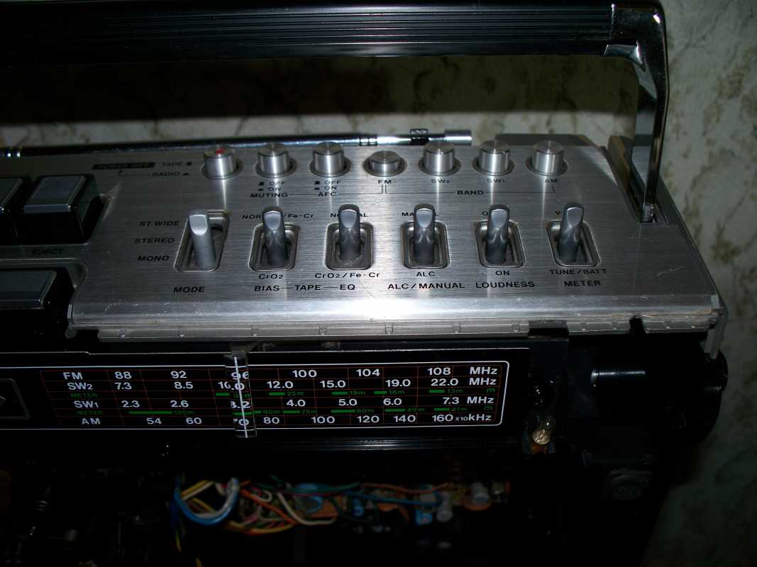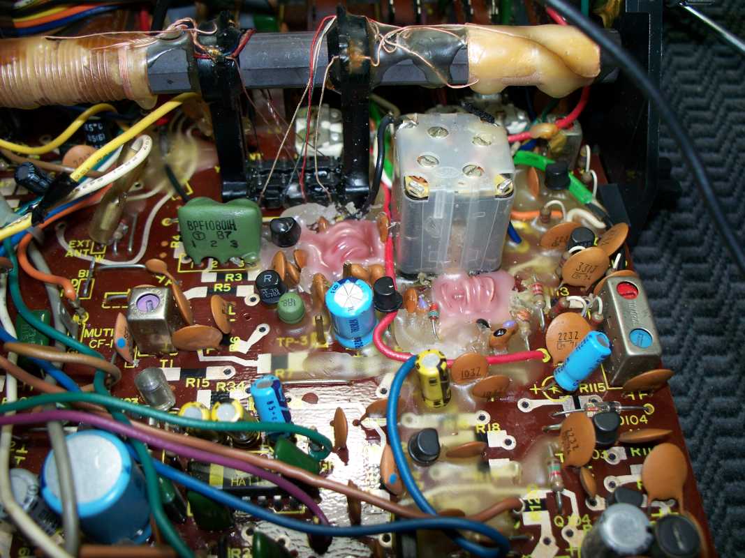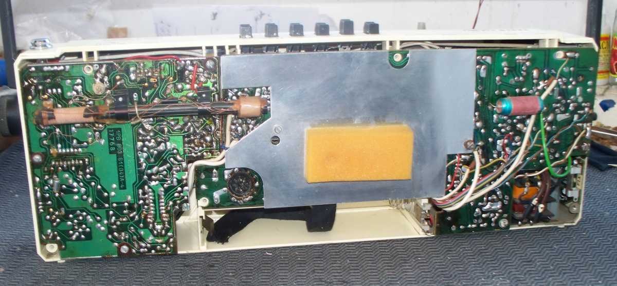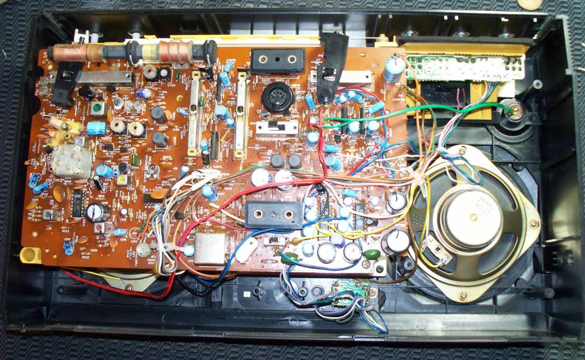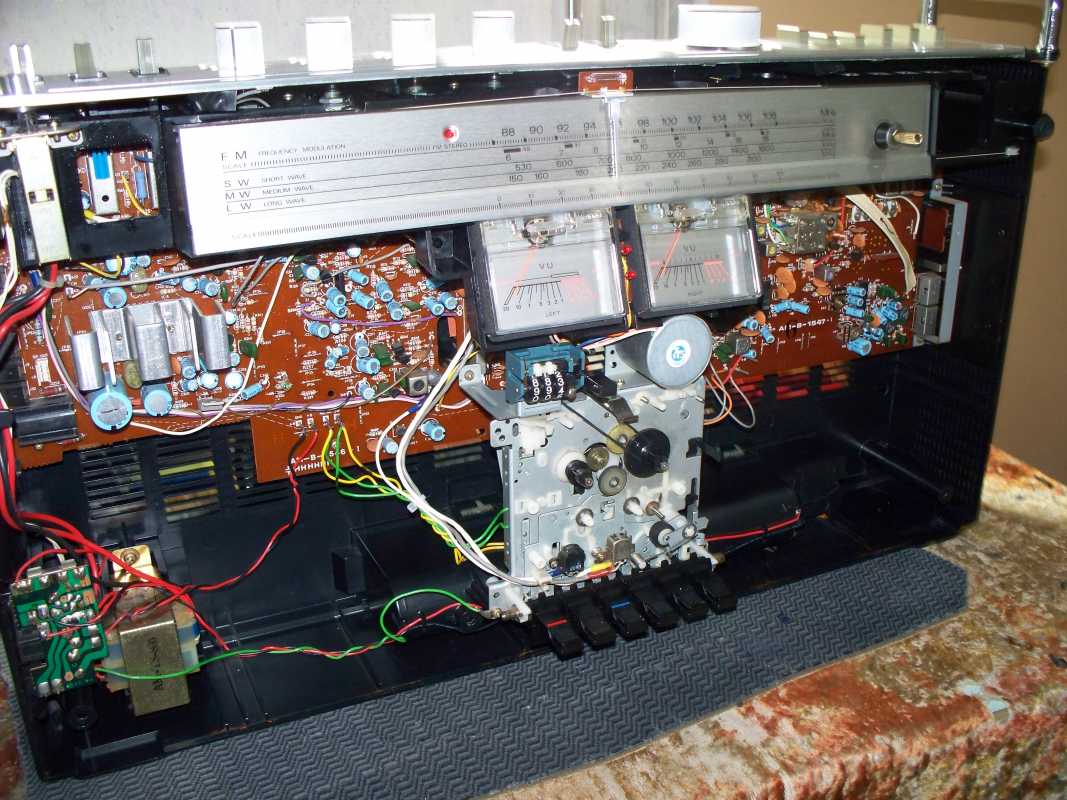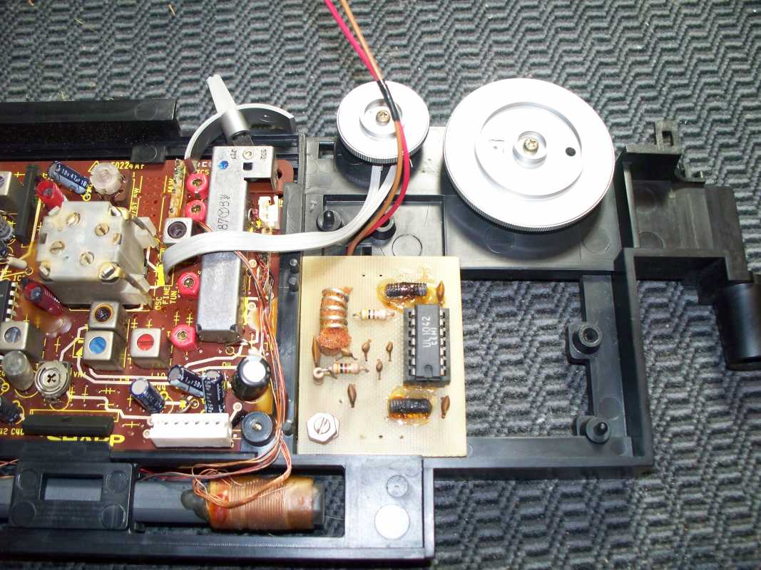 Ну а сейчас нужно немного поработать паяльником. Дело в том, что приёмник в этом аппарате был перестроен под УКВ диапазон. После изучения имеющихся у меня фото шарпов этой сери, пришёл к выводу, что вернуть диапазон на место не составит труда. Потом выпаял контура с тремя витками медной проволоки, намотал новые, но уже с двумя витками, и припаял их обратно на место. Манипулирую сжатием витков контуров ,вложил все станции в нужный диапазон. Теперь приёмник работает в FM, и без проблем принимает FM стерео. Ну и залил всё это парафином.
