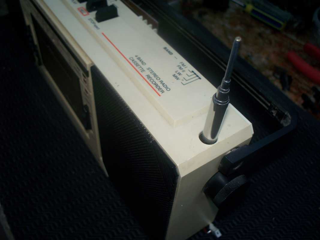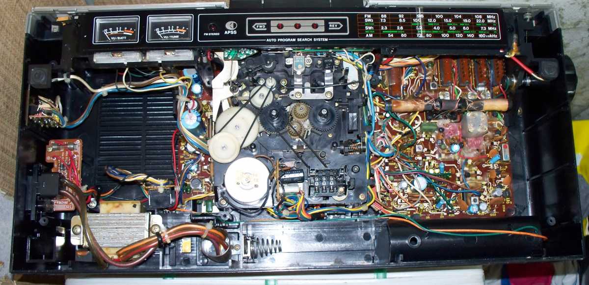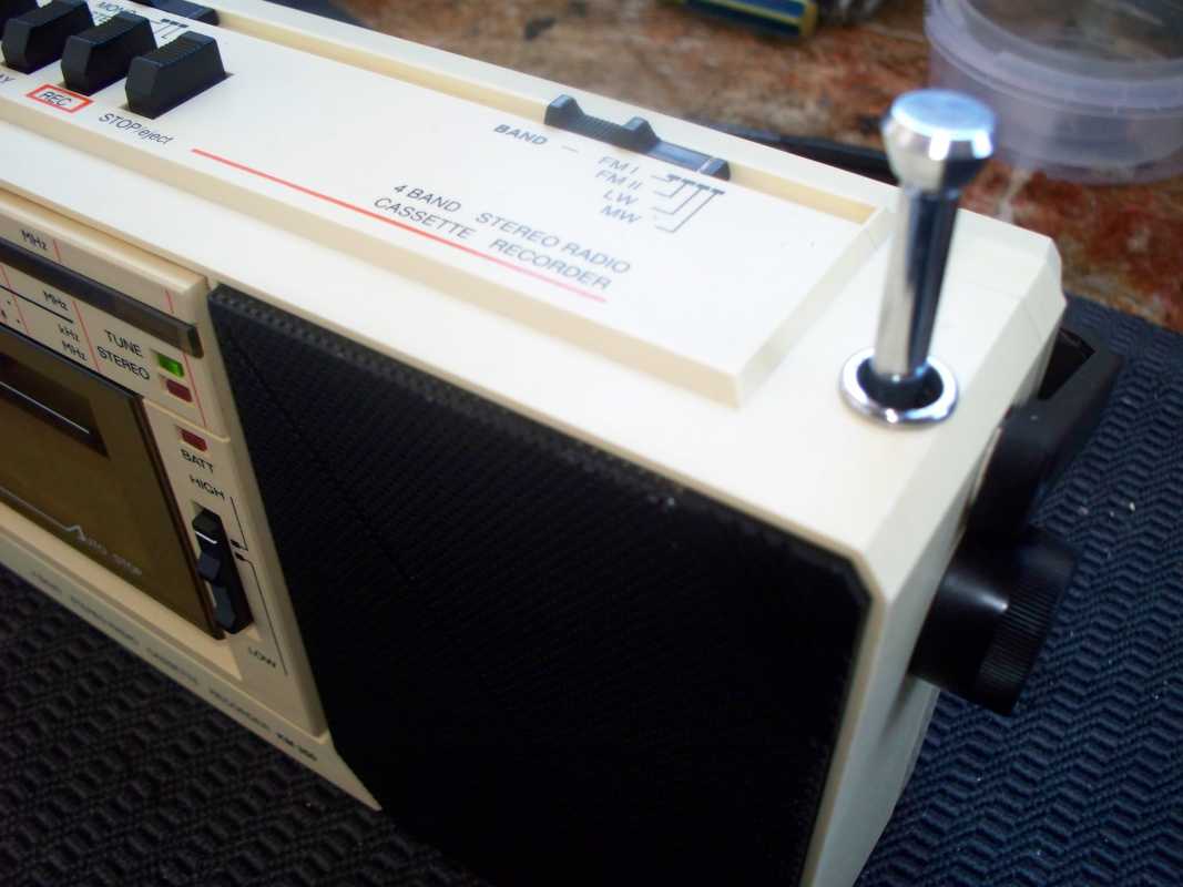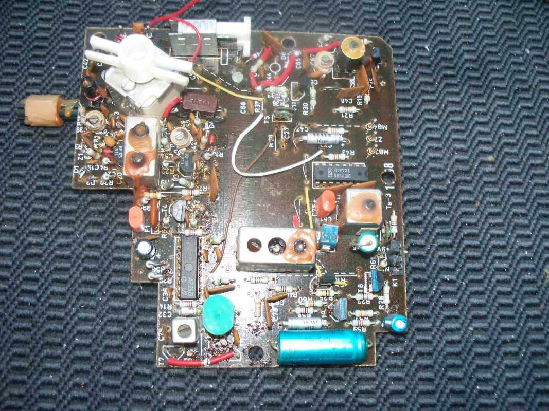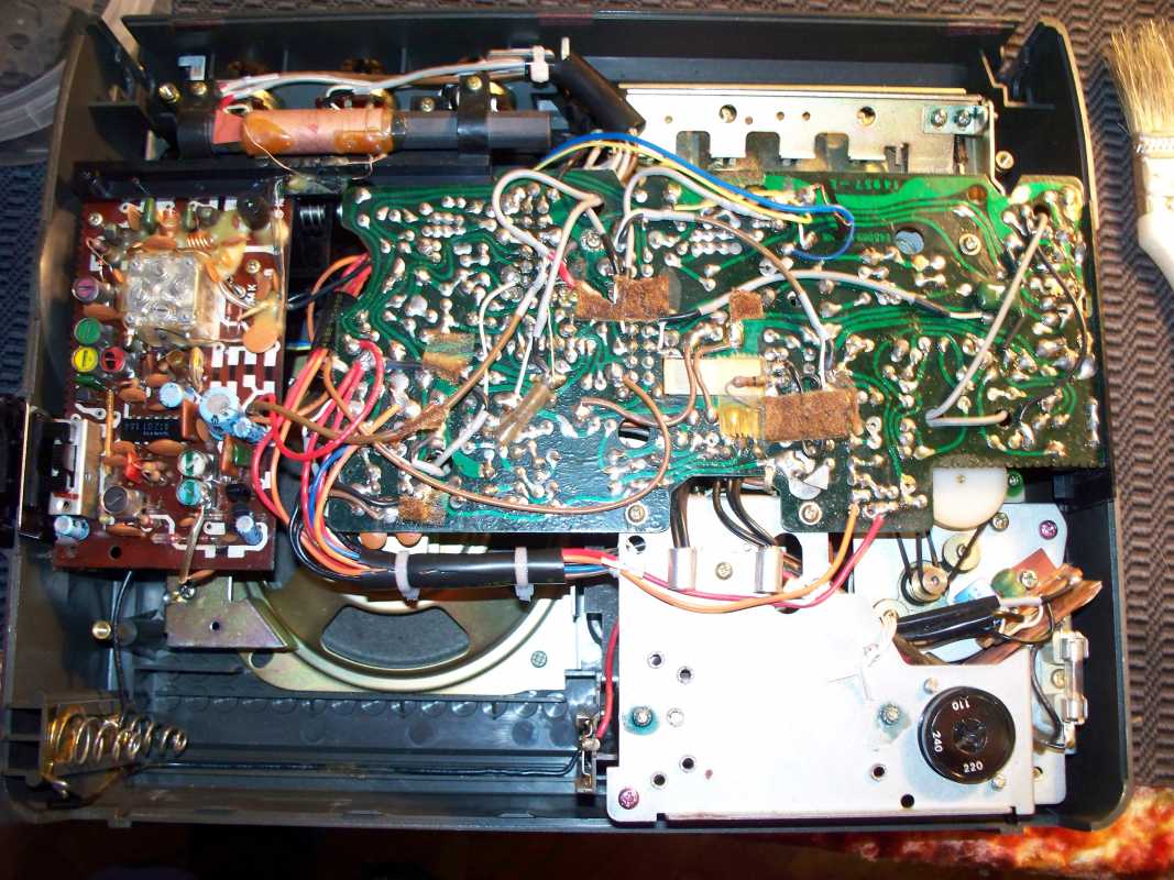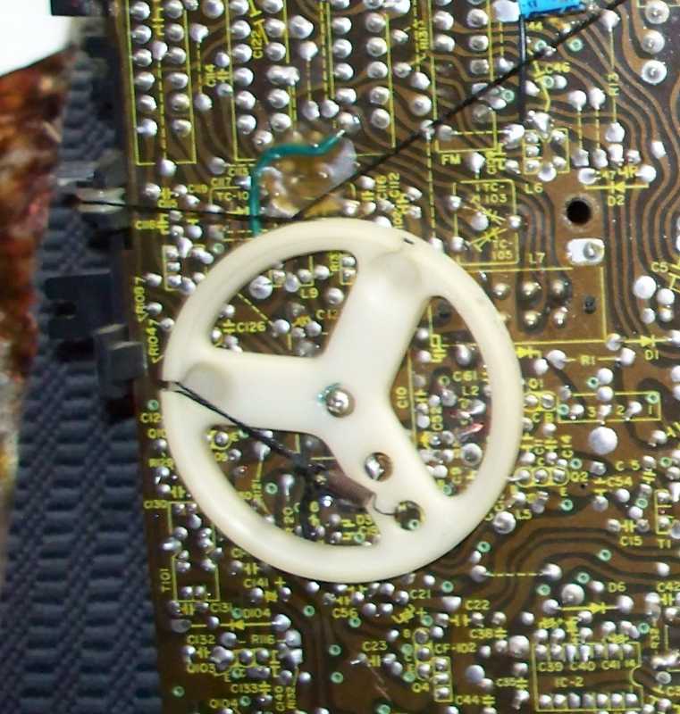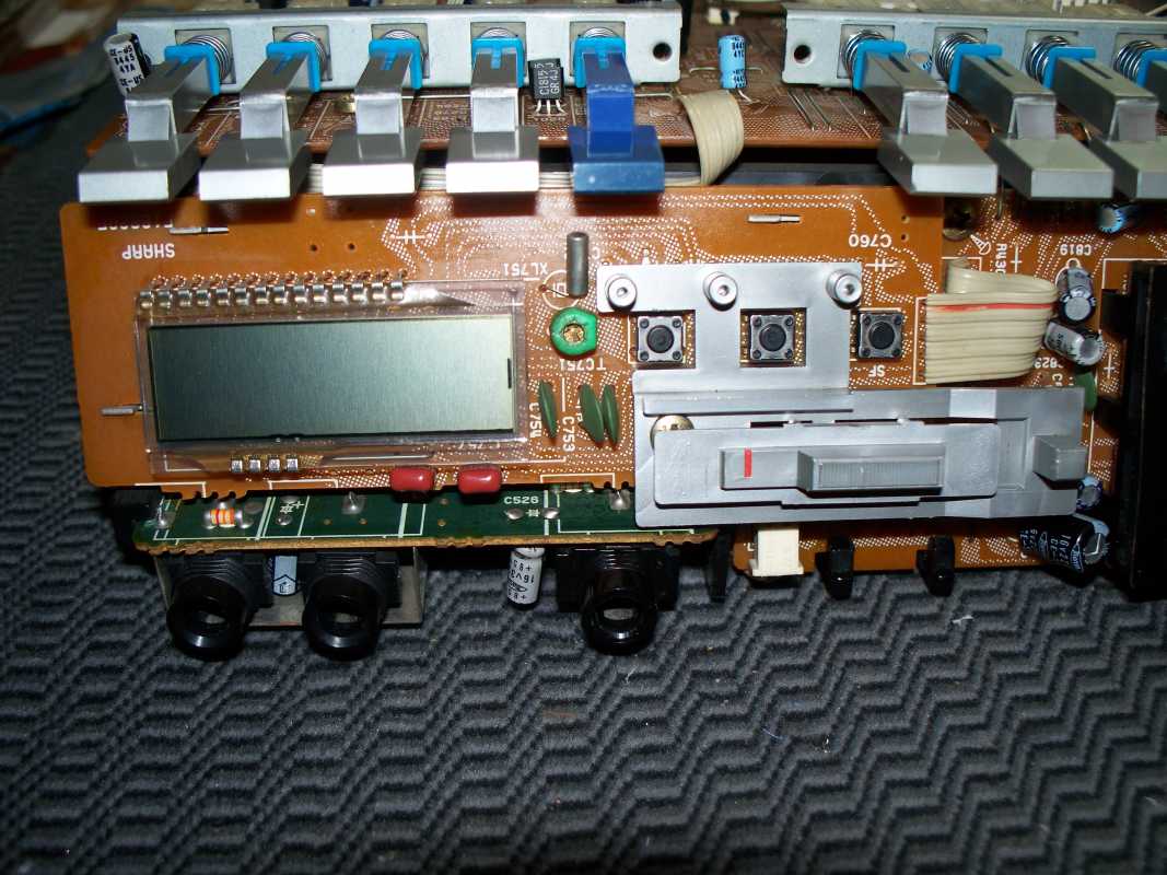 Ну а сейчас нужно немного поработать паяльником. Дело в том, что приёмник в этом аппарате был перестроен под УКВ диапазон. После изучения имеющихся у меня фото шарпов этой сери, пришёл к выводу, что вернуть диапазон на место не составит труда. Потом выпаял контура с тремя витками медной проволоки, намотал новые, но уже с двумя витками, и припаял их обратно на место. Манипулирую сжатием витков контуров ,вложил все станции в нужный диапазон. Теперь приёмник работает в FM, и без проблем принимает FM стерео. Ну и залил всё это парафином.