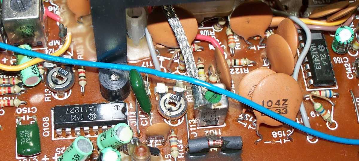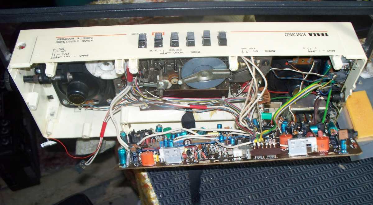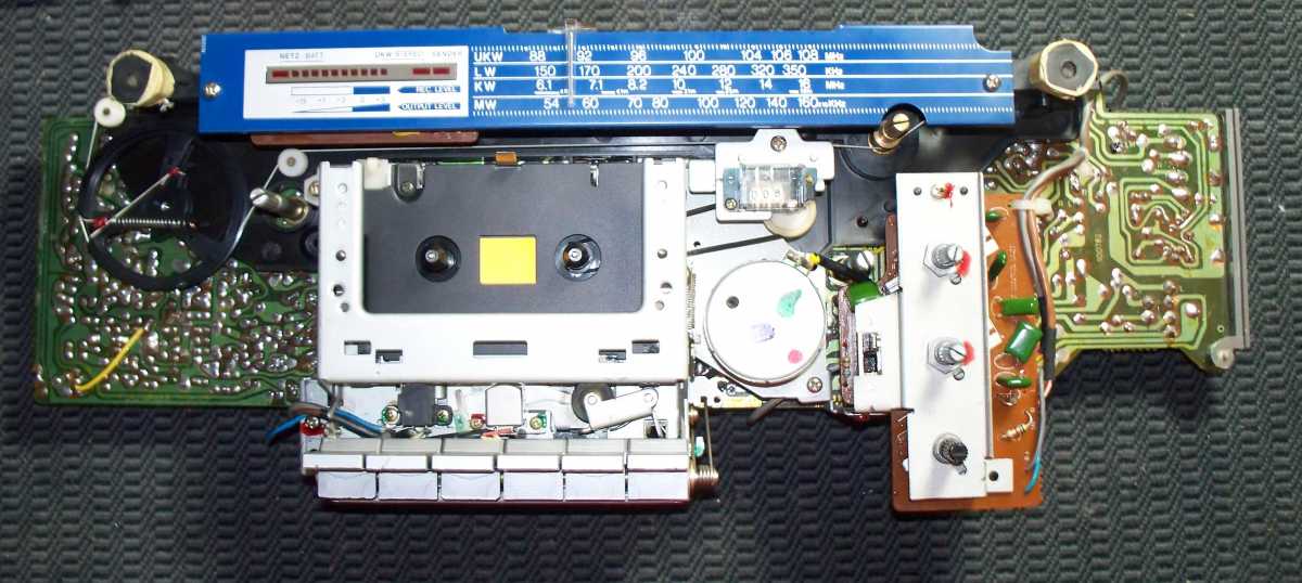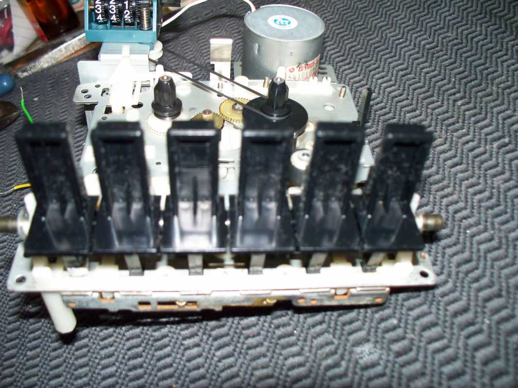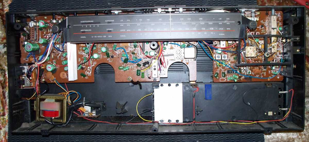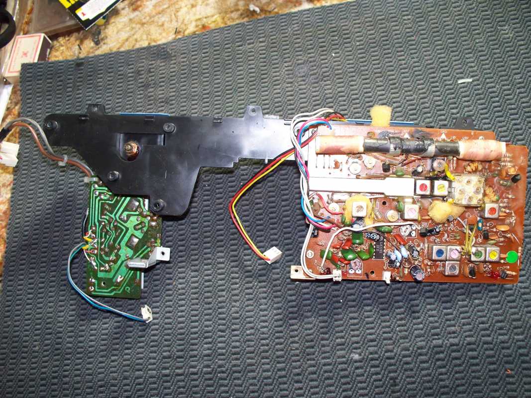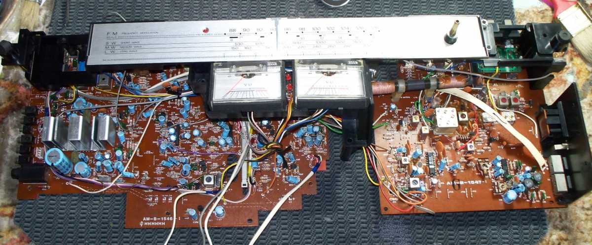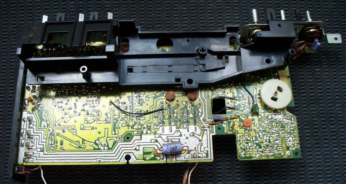 Ну а сейчас нужно немного поработать паяльником. Дело в том, что приёмник в этом аппарате был перестроен под УКВ диапазон. После изучения имеющихся у меня фото шарпов этой сери, пришёл к выводу, что вернуть диапазон на место не составит труда. Потом выпаял контура с тремя витками медной проволоки, намотал новые, но уже с двумя витками, и припаял их обратно на место. Манипулирую сжатием витков контуров ,вложил все станции в нужный диапазон. Теперь приёмник работает в FM, и без проблем принимает FM стерео. Ну и залил всё это парафином.