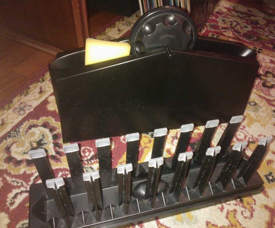 Есть у меня свой метод мытья (стирки) винила. У вас тут весело, чем на других форумах (то умничают, то щеки надувают) поэтому поделюсь нигде не рассказывал. 1.Наливаю тазик воды, добавляю раствор фото №1 (5-6 "плевков") этой гадасти (супруга чего-то и куда-то добавляет).Опускаю машинку для деликатной стирки фото №2. Одеваю на пирамидку фото № 3 (из детского магазина и маг. крепежа - длинный болт с резьбой). Внизу у основания 2 колечка-1 диск, затем опять 2 колечка 2-ой диск. Сверху еще одно колечко и фиксирую сверху гайкой. Опускаю в таз с водой и разбавленной гадастью на 40-50 мин. Включаю выше указанную стир. машинку. Чтобы конструкция не всплывала на верх пирамидки ковш с водой (можно что -нибудь придумать, но меня пока это устраивает). После окончания процедуры беру 1 диск, губку для мытья посуды и мягкой стороной губки, которая смочена жидкостью из тазика круговыми движения легко провожу несколько раз по одной и другой поверхности.Небольшие нажатие уделяю кромке диска т.к. вся в основном пыль скапливается на "заходе" иглы на диск.(щелчки,треск и игла так трещит, что сердце разрывается)