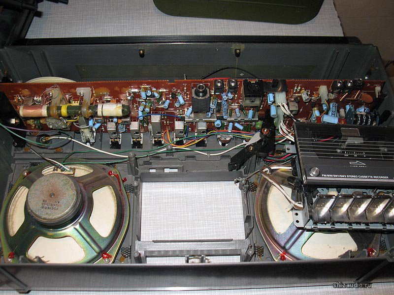 Радио работает на тошибовской TA8127N, и параметры весьма неплохие. УНЧ на AN7149N, выходная мощность 2x5.3 Вт. Динамики 20' + пищалки. В остальном внутри - простой магнитофон без каких-либо изысков. Корпус большой, но внутри пустого места очень много.