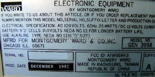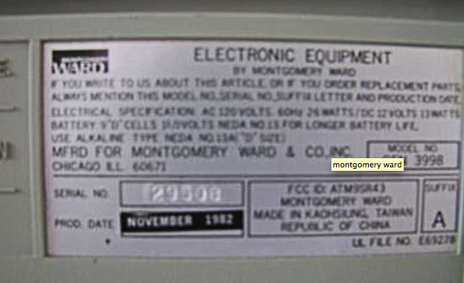 Так это шильдик от сооовсем другой машины!На фото "Уорд"-96,а шильдик от "Уорда"-98.То "чудо с телевизором" действительно производилось в стране победившего Гоминдана с 1982го....Балалайку эту,хотя и с "Сирасунскими" корнями даже рядом с "Монтгомери Уорд GEN 3996 Эрлайн",шедевром от "Сирасуны" 1978 го года, нельзя ставить.Xотя номер модели и отличается всего на одну циферку...Шильдик от 96го "Монтгомери",истинного самурая, выглядит так...И только так!Маde in Japan.Нихт Тайванише балалайкен!!Йа-йа Япониш,практиш,ГУТ!!! :)