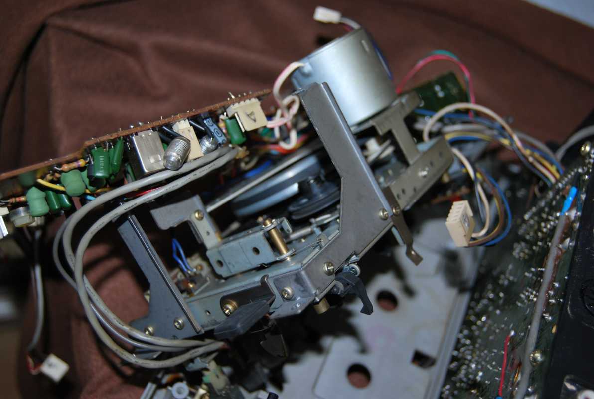 До маховика добраться в QT-12 не составляет проблем. Для этого нужно открутить всего три винта. Быстро нашел вращающийся штифт от отвалившейся шестеренки. Смазал лентопротяг.