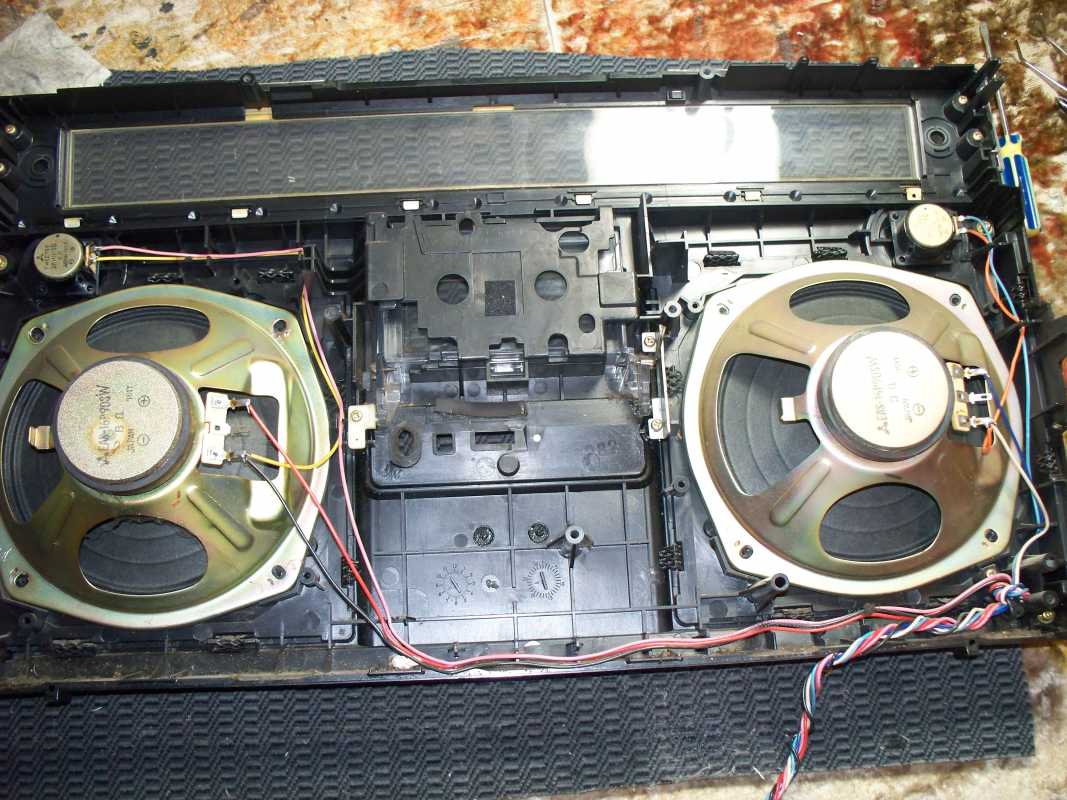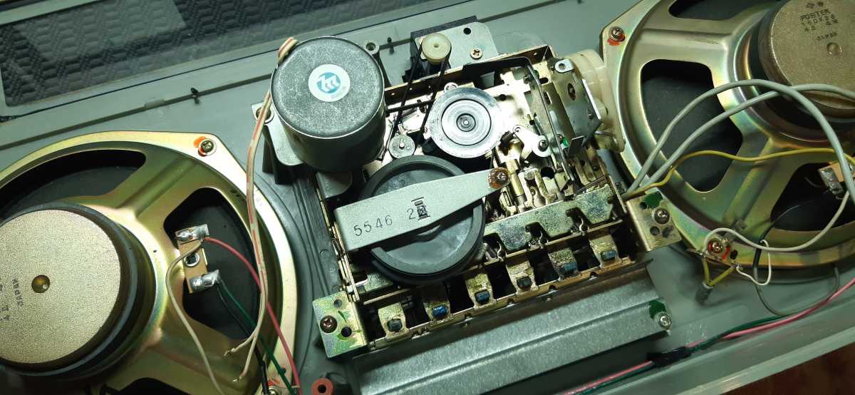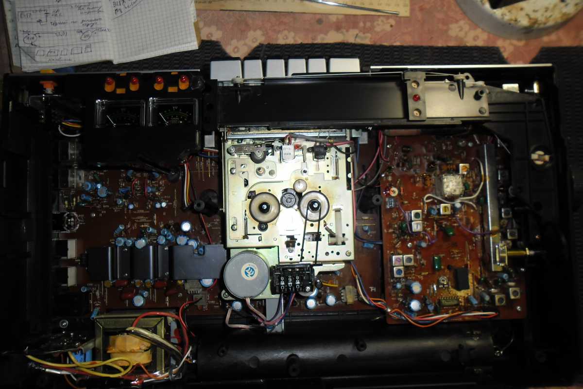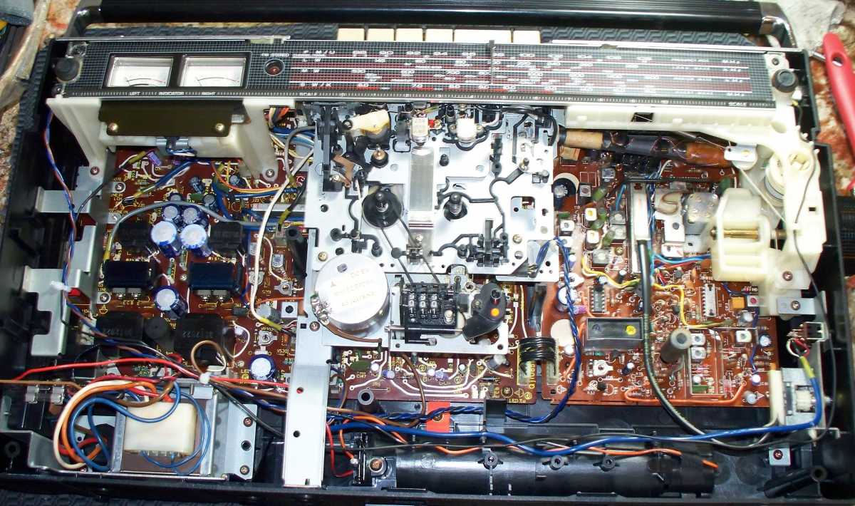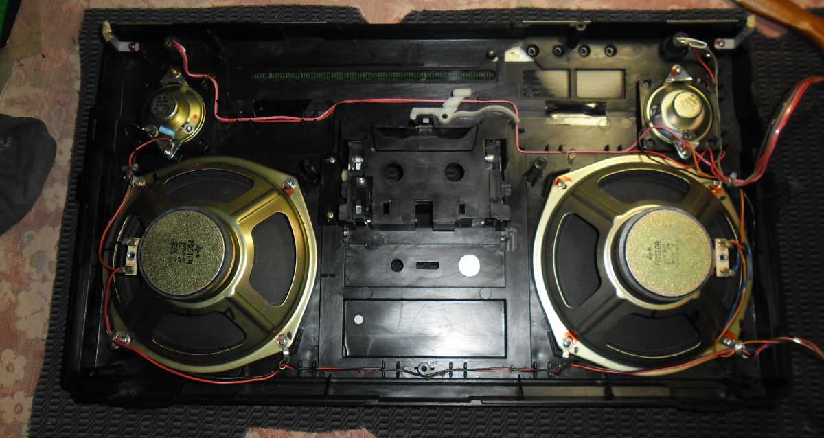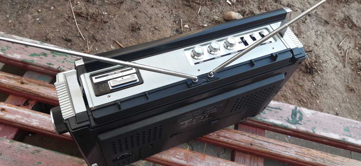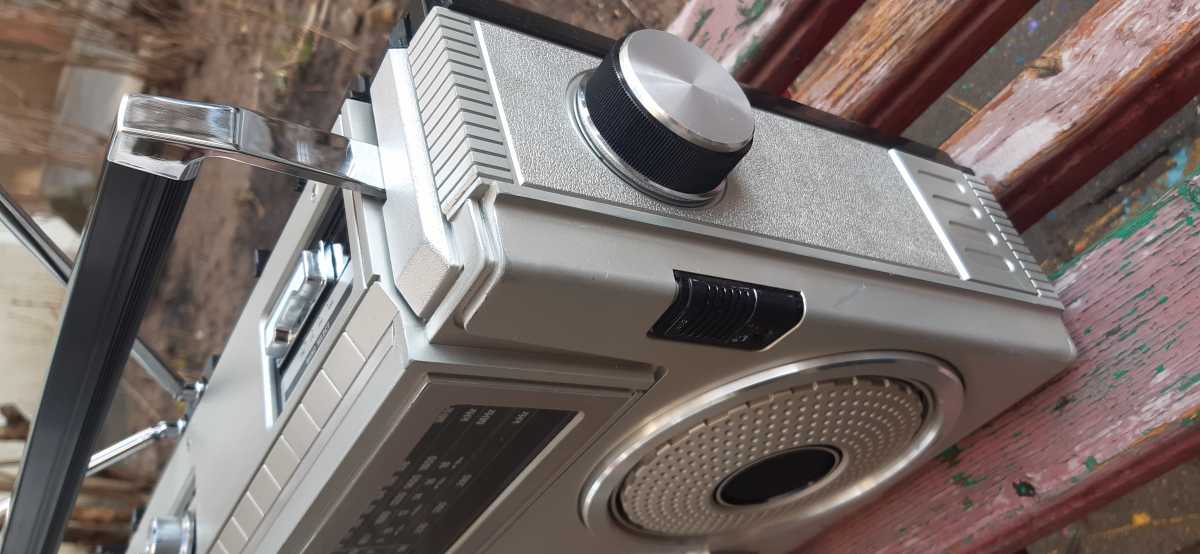 Бренд конечно известный, Японский, и очень серьёзный, но вот сам аппарат уже изготовлен не иначе как в Тайване. Ну что же, настало время посмотреть что же там внутри этого аппарата. Сразу скажу, корпус конечно хиленький, но терпимо, бывало и хуже.Особенно когда её переносить, ручка ужасно скрипит, и аппарат заваливается на отну сторону, так как самая тяжёлая часть этой магнитолы, это трансформатор, и расположен он не по центре, а в левом верхнем углу. И по этому он просто делает перевес на одну сторону. Я уже подумал, может для равновесия приклеить внутри корпуса металлическую пластину. И так, под крышкой практически пусто. Да и сама крышка странных форм, с какими то не понятными углублениями, хотя нет, всё понятно, с обратной стороны этих углублений есть прорези, они поддерживают плату. Батарейный отсек, он тоже расположен в глубине крышки. Хотя всё понятно, производители просто пошли на хитрость, и сделали такой огромный корпус с небольшой экономией. Сейчас немного отвлекусь от этой магнитолки, и переметнусь к другой, очень именитой, тоже огромной, с динамиками 20 см, тоже красивой, но по звучанию, так себе.Я к чему, что и благородные аппараты, бывают пустые, как барабан. Думаю многие узнали, эту магнитолу. Вернусь к сегодняшней магнитоле. Динамики 20 см, просто белоснежные, пьезо пищалки, от коих толку ноль. Но всё равно, скажу Вам честно, звучание магнитолы мне понравилось, даже очень.По крайней мере с радио она поёт просто замечательно. Отделка динамиков очень похожа как у Sharp GF 9000. Вч установлены в хромированных рупорах. Что не понравилось в этой магнитоле, так это настройка радио на частоту. Требует особой смекалки, так как верньерный механизм там уж очень упрощён, и малейшее движение ручки, и всё станция улетела, а стрелка сдвинулась на пол сантиметра. Плата радио.На КПЕ пластиковый квадратик, куда вставляется ручка настройки вместе со стрелкой. Плата пиковых индикаторов, они работают в разброс, очень красиво, и что не мало важно, они не привязаны к уровню звука, как в многих магнитолах. УНЧ на двух микросхемах. Радиаторы приличных размеров, дюралевые, на не кусок оцинковки. Пяти полосный эквалайзер, с огромными хромированными ползунками. Ну а теперь ЛПМ. Магнитола двух кассетная. Одна дека, верхняя, по принципу авто магнитолы. Кассета вставляется боком.На ней можно только прослушать кассету и перемотать в одну сторону. Вторая дека полноценная, с записью и перемотками. Встречается в добром десятке магнитол. На полноценной стирающей головке, с экономили. Крышка кассеты второй деки с добротным лотком для кассеты, и не с хиленькими пружинками. Пришлось залезть в закрома, и поменять пружинку на кнопку стоп и пауза. Старая почему то напрочь со ржавела и развалилась. Также поработал с антеннами. Практически все магнитолы приезжают с дефектом антенн, а если их ещё и две, то совсем беда.Но у меня всё получилось. А вот и самая тяжёлая деталь магнитолы. Довольно добротный и увесистый блок питания. И зачем они его сверху поставили. И ещё не понятная контактная группа, которая нажимается самой насадкой на переключатель сети. Ну и осталось на последок сказать пару слов о внешности магнитолы. Хотя я уже писал выше, что магнитола огромная, с изобилием хрома и разноцветных надписей и полосочек.Звучание очень даже не плохое. Не верите, конечно, каждому своё, и