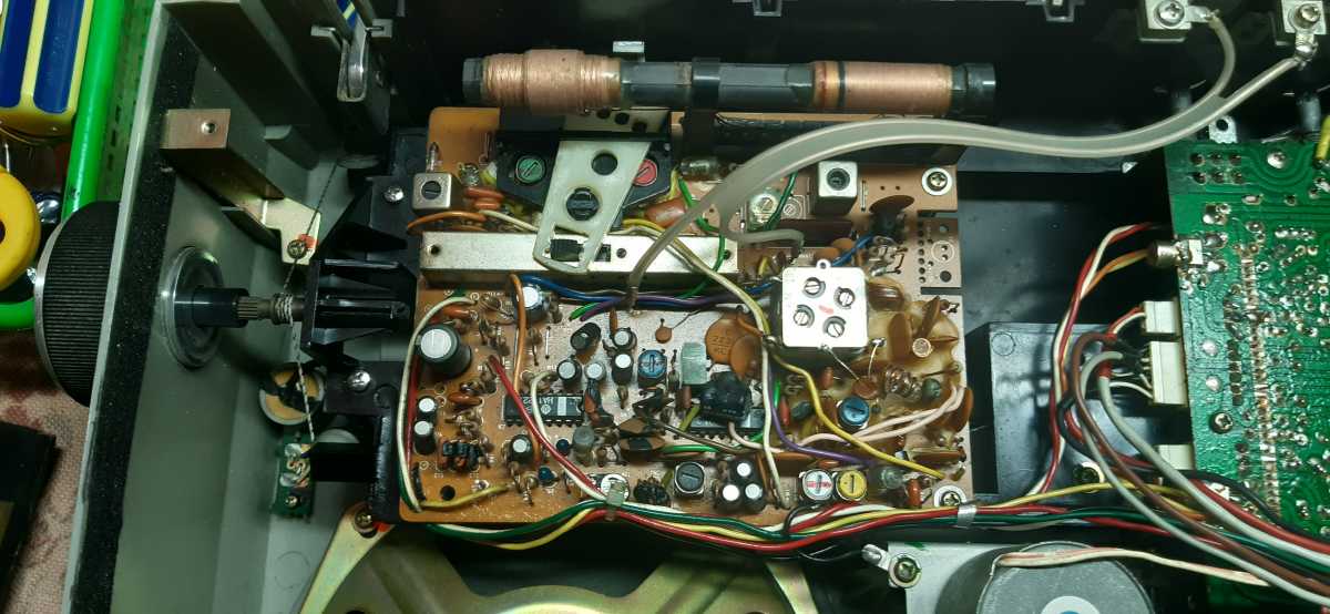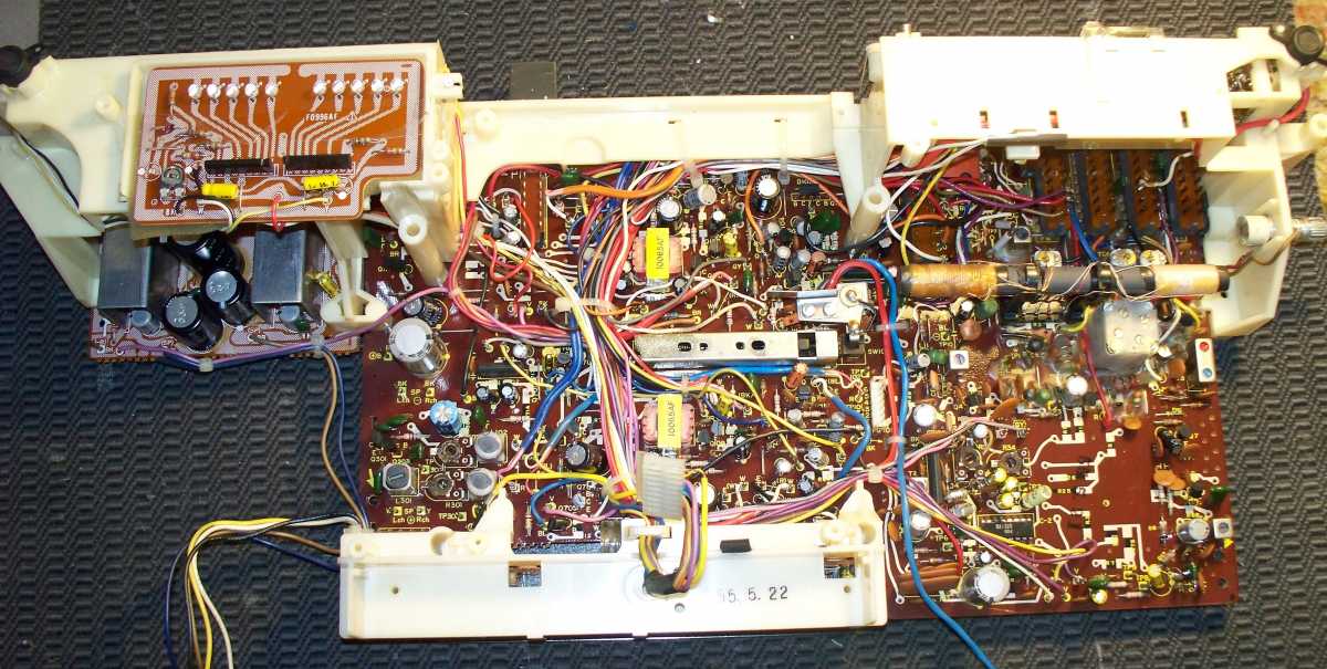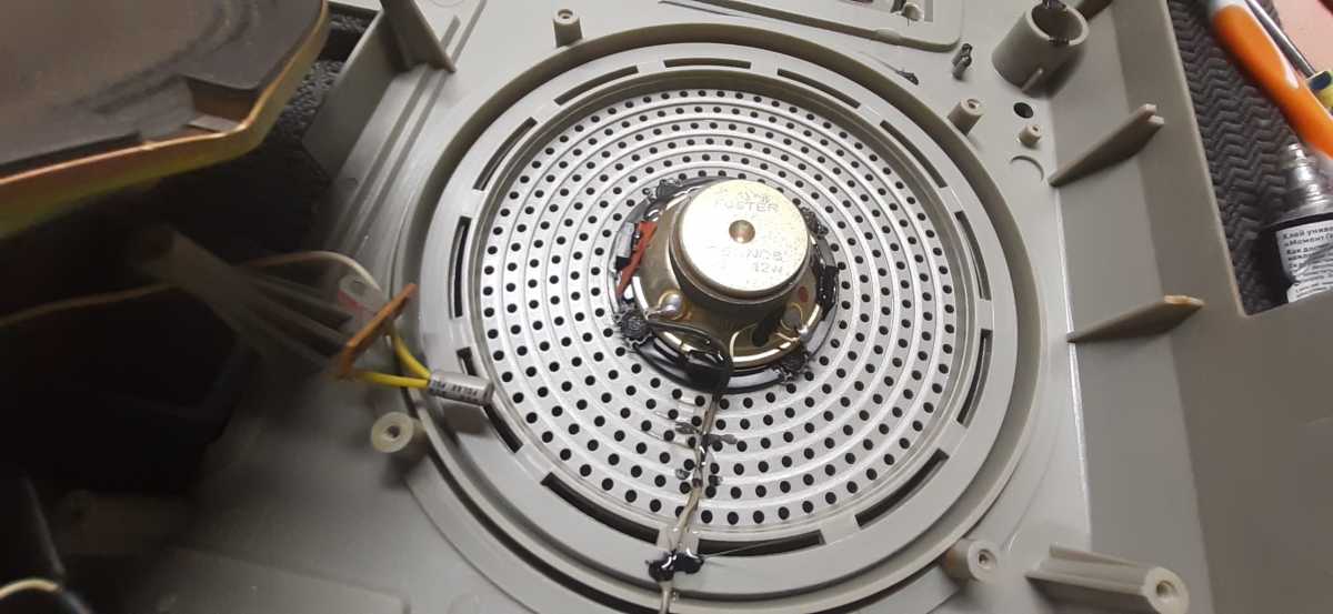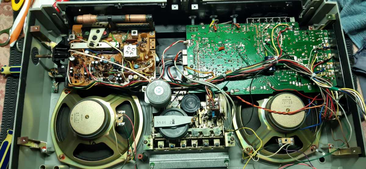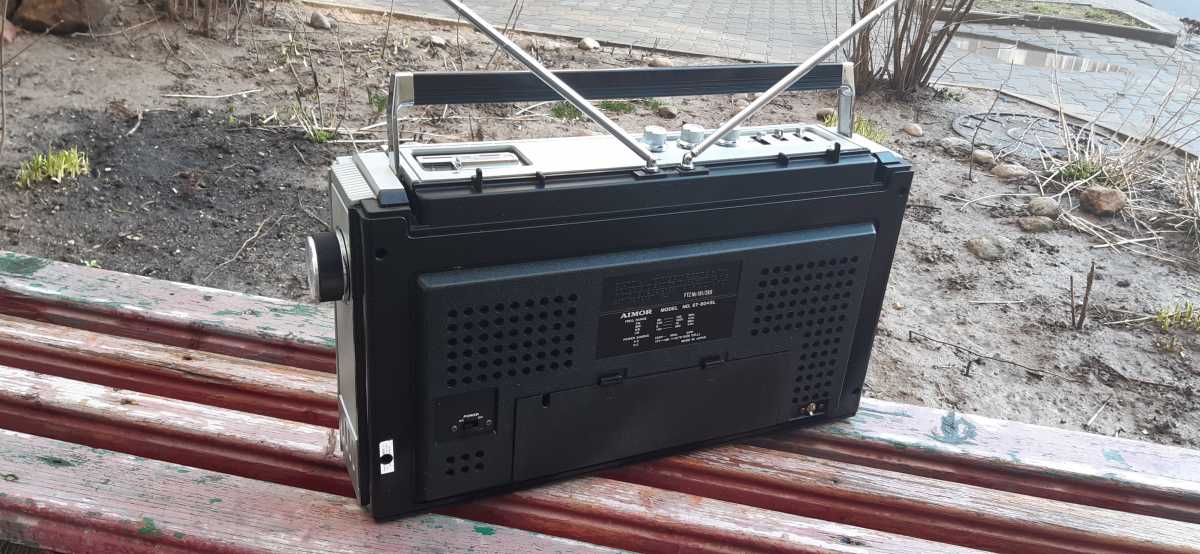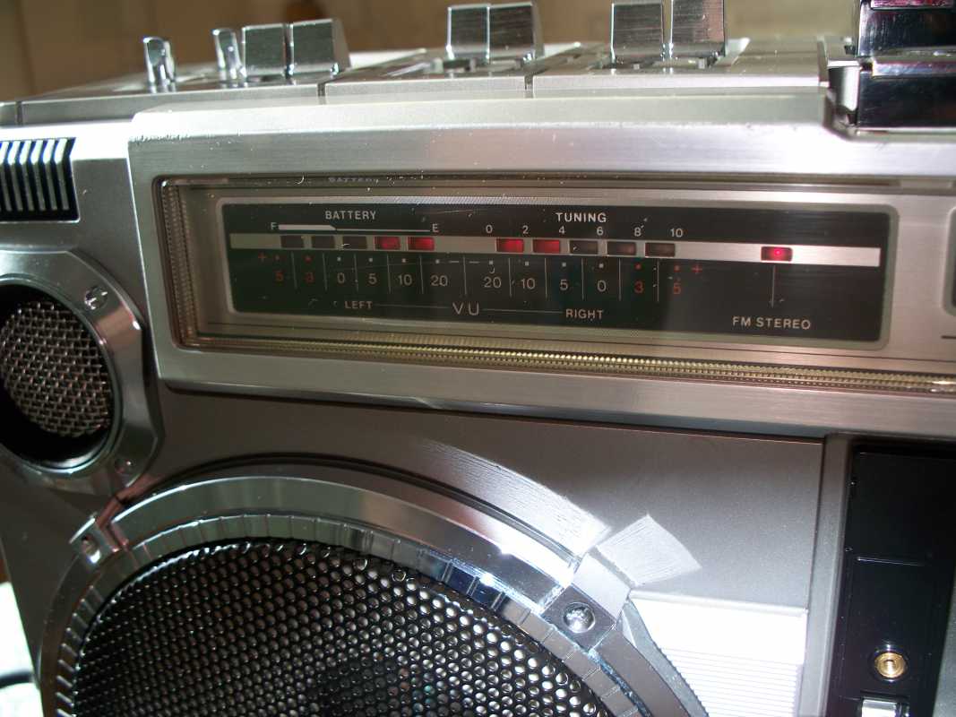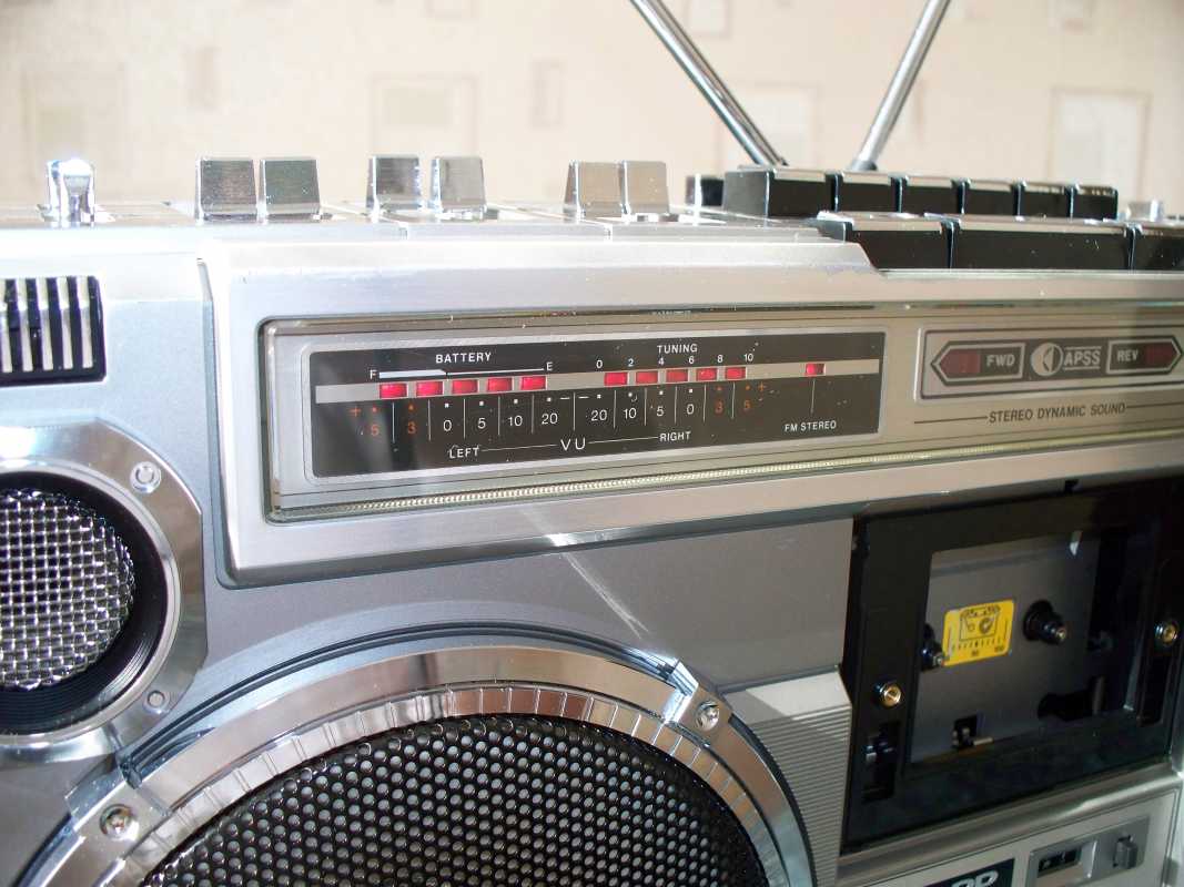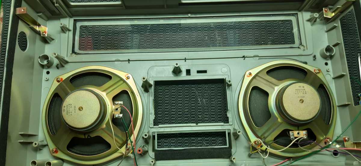 Бренд конечно известный, Японский, и очень серьёзный, но вот сам аппарат уже изготовлен не иначе как в Тайване. Ну что же, настало время посмотреть что же там внутри этого аппарата. Сразу скажу, корпус конечно хиленький, но терпимо, бывало и хуже.Особенно когда её переносить, ручка ужасно скрипит, и аппарат заваливается на отну сторону, так как самая тяжёлая часть этой магнитолы, это трансформатор, и расположен он не по центре, а в левом верхнем углу. И по этому он просто делает перевес на одну сторону. Я уже подумал, может для равновесия приклеить внутри корпуса металлическую пластину. И так, под крышкой практически пусто. Да и сама крышка странных форм, с какими то не понятными углублениями, хотя нет, всё понятно, с обратной стороны этих углублений есть прорези, они поддерживают плату. Батарейный отсек, он тоже расположен в глубине крышки. Хотя всё понятно, производители просто пошли на хитрость, и сделали такой огромный корпус с небольшой экономией. Сейчас немного отвлекусь от этой магнитолки, и переметнусь к другой, очень именитой, тоже огромной, с динамиками 20 см, тоже красивой, но по звучанию, так себе.Я к чему, что и благородные аппараты, бывают пустые, как барабан. Думаю многие узнали, эту магнитолу. Вернусь к сегодняшней магнитоле. Динамики 20 см, просто белоснежные, пьезо пищалки, от коих толку ноль. Но всё равно, скажу Вам честно, звучание магнитолы мне понравилось, даже очень.По крайней мере с радио она поёт просто замечательно. Отделка динамиков очень похожа как у Sharp GF 9000. Вч установлены в хромированных рупорах. Что не понравилось в этой магнитоле, так это настройка радио на частоту. Требует особой смекалки, так как верньерный механизм там уж очень упрощён, и малейшее движение ручки, и всё станция улетела, а стрелка сдвинулась на пол сантиметра. Плата радио.На КПЕ пластиковый квадратик, куда вставляется ручка настройки вместе со стрелкой. Плата пиковых индикаторов, они работают в разброс, очень красиво, и что не мало важно, они не привязаны к уровню звука, как в многих магнитолах. УНЧ на двух микросхемах. Радиаторы приличных размеров, дюралевые, на не кусок оцинковки. Пяти полосный эквалайзер, с огромными хромированными ползунками. Ну а теперь ЛПМ. Магнитола двух кассетная. Одна дека, верхняя, по принципу авто магнитолы. Кассета вставляется боком.На ней можно только прослушать кассету и перемотать в одну сторону. Вторая дека полноценная, с записью и перемотками. Встречается в добром десятке магнитол. На полноценной стирающей головке, с экономили. Крышка кассеты второй деки с добротным лотком для кассеты, и не с хиленькими пружинками. Пришлось залезть в закрома, и поменять пружинку на кнопку стоп и пауза. Старая почему то напрочь со ржавела и развалилась. Также поработал с антеннами. Практически все магнитолы приезжают с дефектом антенн, а если их ещё и две, то совсем беда.Но у меня всё получилось. А вот и самая тяжёлая деталь магнитолы. Довольно добротный и увесистый блок питания. И зачем они его сверху поставили. И ещё не понятная контактная группа, которая нажимается самой насадкой на переключатель сети. Ну и осталось на последок сказать пару слов о внешности магнитолы. Хотя я уже писал выше, что магнитола огромная, с изобилием хрома и разноцветных надписей и полосочек.Звучание очень даже не плохое. Не верите, конечно, каждому своё, и