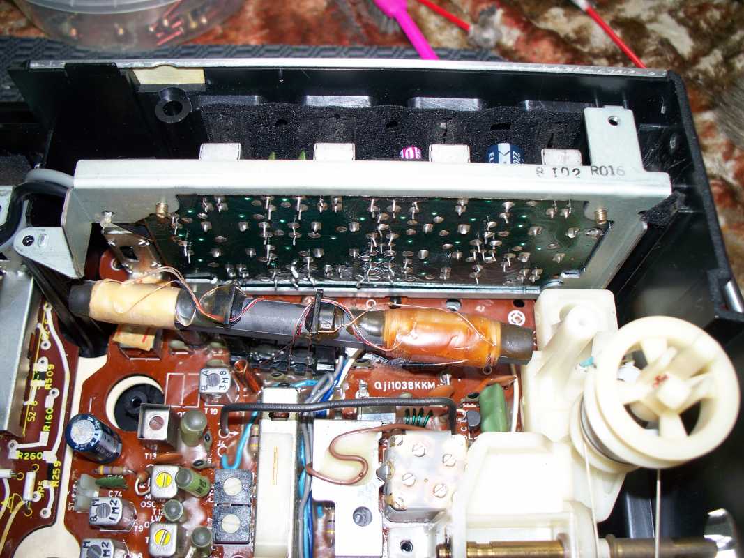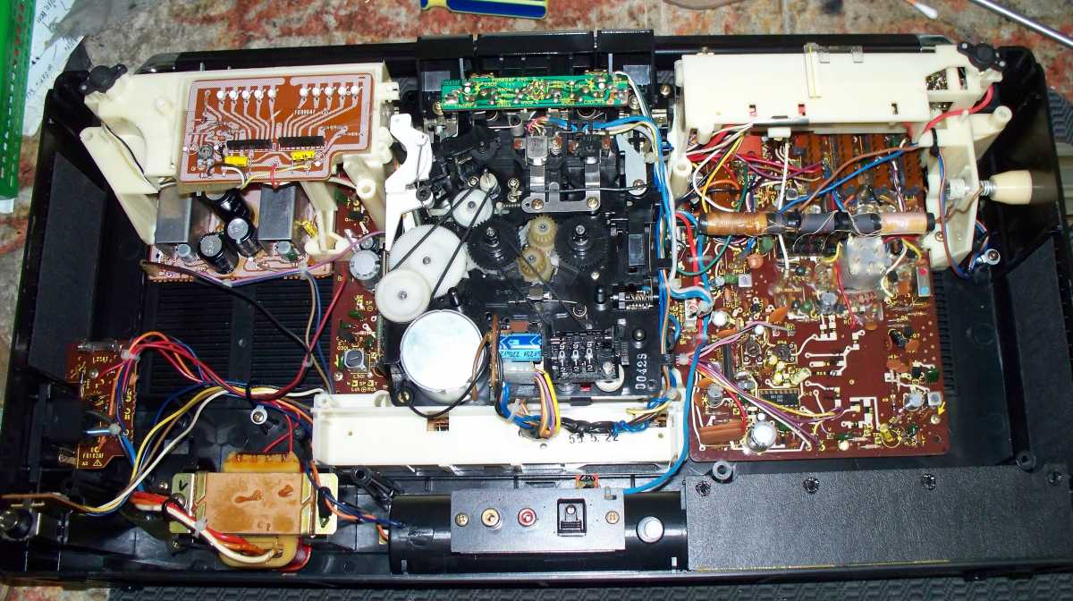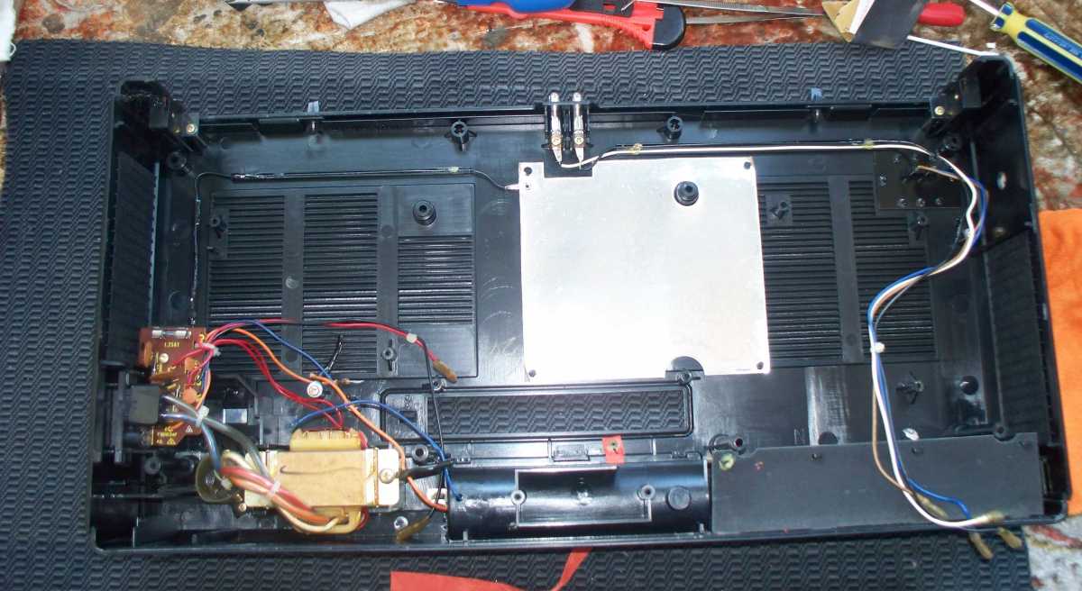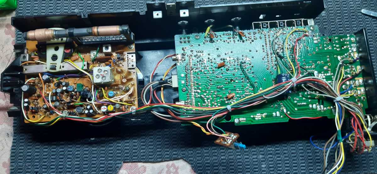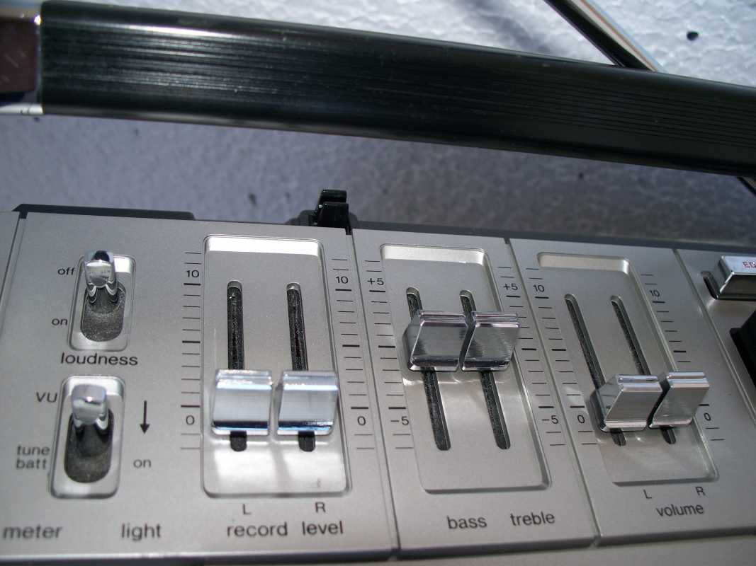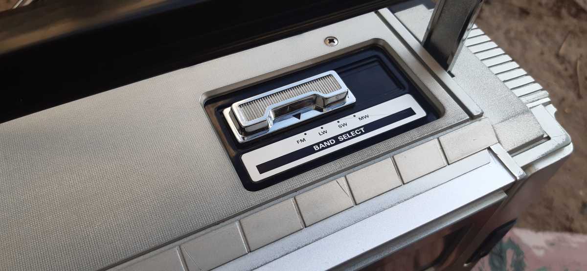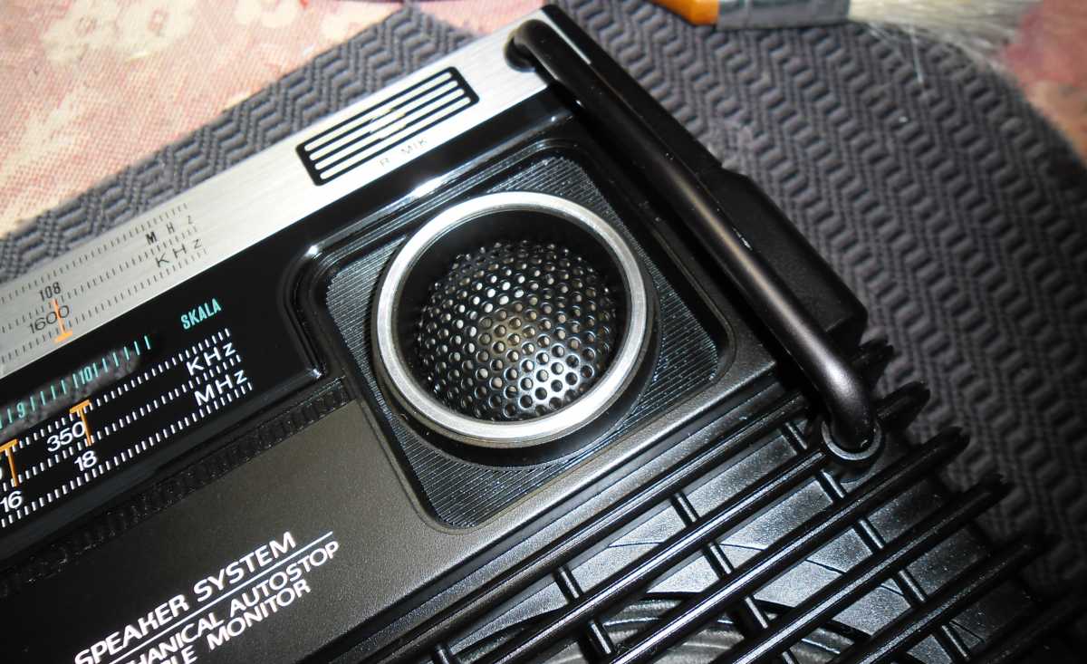 Бренд конечно известный, Японский, и очень серьёзный, но вот сам аппарат уже изготовлен не иначе как в Тайване. Ну что же, настало время посмотреть что же там внутри этого аппарата. Сразу скажу, корпус конечно хиленький, но терпимо, бывало и хуже.Особенно когда её переносить, ручка ужасно скрипит, и аппарат заваливается на отну сторону, так как самая тяжёлая часть этой магнитолы, это трансформатор, и расположен он не по центре, а в левом верхнем углу. И по этому он просто делает перевес на одну сторону. Я уже подумал, может для равновесия приклеить внутри корпуса металлическую пластину. И так, под крышкой практически пусто. Да и сама крышка странных форм, с какими то не понятными углублениями, хотя нет, всё понятно, с обратной стороны этих углублений есть прорези, они поддерживают плату. Батарейный отсек, он тоже расположен в глубине крышки. Хотя всё понятно, производители просто пошли на хитрость, и сделали такой огромный корпус с небольшой экономией. Сейчас немного отвлекусь от этой магнитолки, и переметнусь к другой, очень именитой, тоже огромной, с динамиками 20 см, тоже красивой, но по звучанию, так себе.Я к чему, что и благородные аппараты, бывают пустые, как барабан. Думаю многие узнали, эту магнитолу. Вернусь к сегодняшней магнитоле. Динамики 20 см, просто белоснежные, пьезо пищалки, от коих толку ноль. Но всё равно, скажу Вам честно, звучание магнитолы мне понравилось, даже очень.По крайней мере с радио она поёт просто замечательно. Отделка динамиков очень похожа как у Sharp GF 9000. Вч установлены в хромированных рупорах. Что не понравилось в этой магнитоле, так это настройка радио на частоту. Требует особой смекалки, так как верньерный механизм там уж очень упрощён, и малейшее движение ручки, и всё станция улетела, а стрелка сдвинулась на пол сантиметра. Плата радио.На КПЕ пластиковый квадратик, куда вставляется ручка настройки вместе со стрелкой. Плата пиковых индикаторов, они работают в разброс, очень красиво, и что не мало важно, они не привязаны к уровню звука, как в многих магнитолах. УНЧ на двух микросхемах. Радиаторы приличных размеров, дюралевые, на не кусок оцинковки. Пяти полосный эквалайзер, с огромными хромированными ползунками. Ну а теперь ЛПМ. Магнитола двух кассетная. Одна дека, верхняя, по принципу авто магнитолы. Кассета вставляется боком.На ней можно только прослушать кассету и перемотать в одну сторону. Вторая дека полноценная, с записью и перемотками. Встречается в добром десятке магнитол. На полноценной стирающей головке, с экономили. Крышка кассеты второй деки с добротным лотком для кассеты, и не с хиленькими пружинками. Пришлось залезть в закрома, и поменять пружинку на кнопку стоп и пауза. Старая почему то напрочь со ржавела и развалилась. Также поработал с антеннами. Практически все магнитолы приезжают с дефектом антенн, а если их ещё и две, то совсем беда.Но у меня всё получилось. А вот и самая тяжёлая деталь магнитолы. Довольно добротный и увесистый блок питания. И зачем они его сверху поставили. И ещё не понятная контактная группа, которая нажимается самой насадкой на переключатель сети. Ну и осталось на последок сказать пару слов о внешности магнитолы. Хотя я уже писал выше, что магнитола огромная, с изобилием хрома и разноцветных надписей и полосочек.Звучание очень даже не плохое. Не верите, конечно, каждому своё, и
