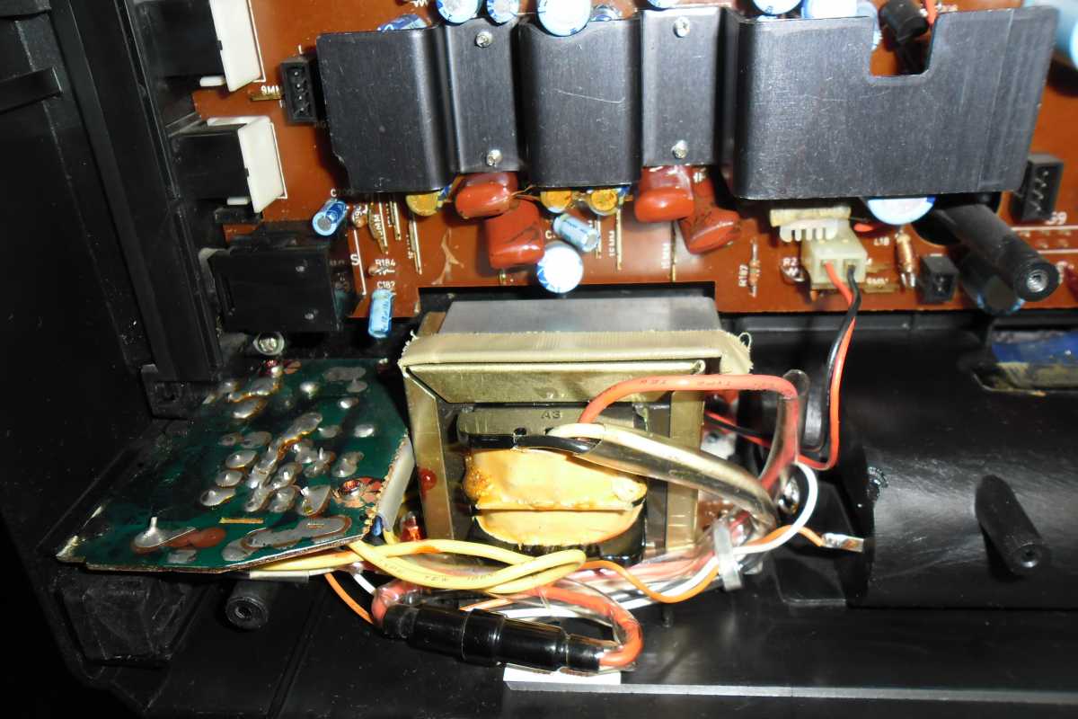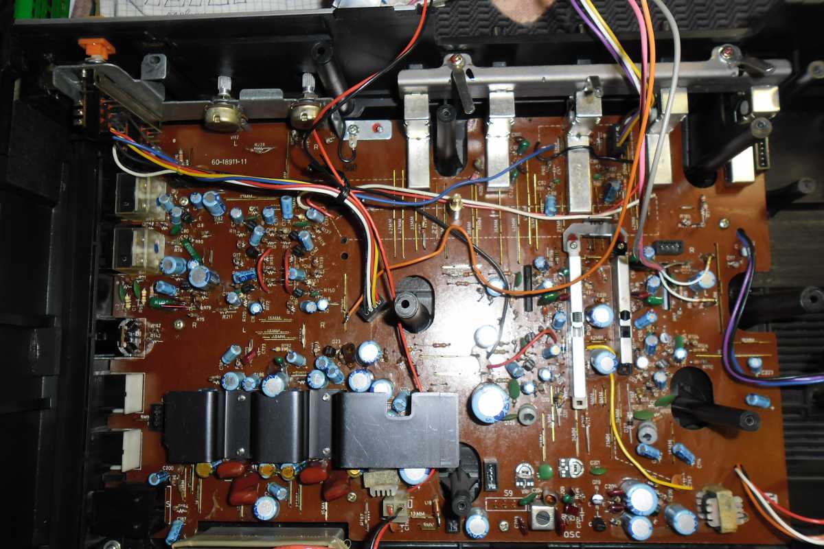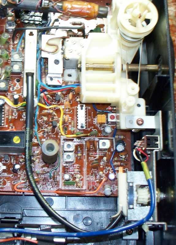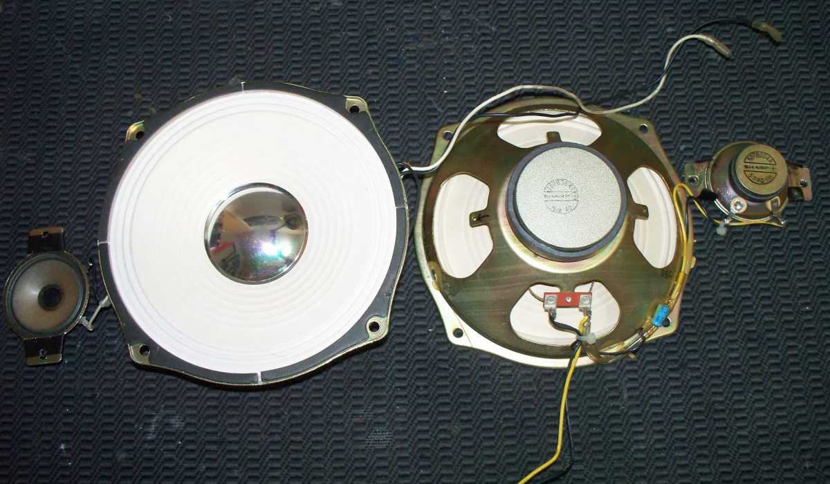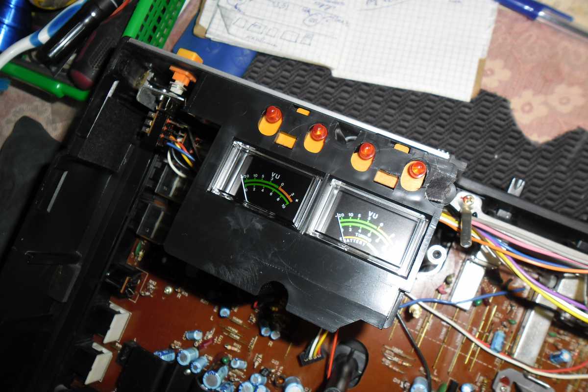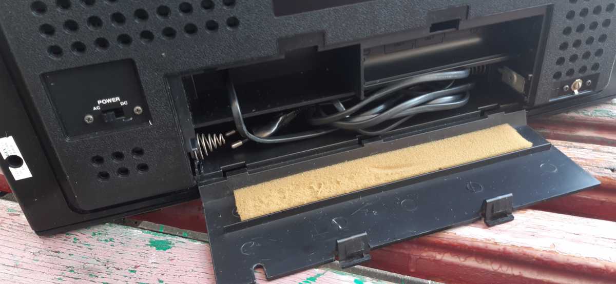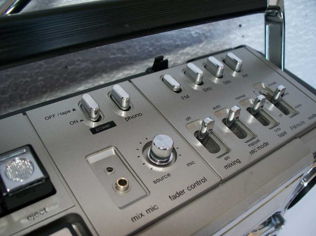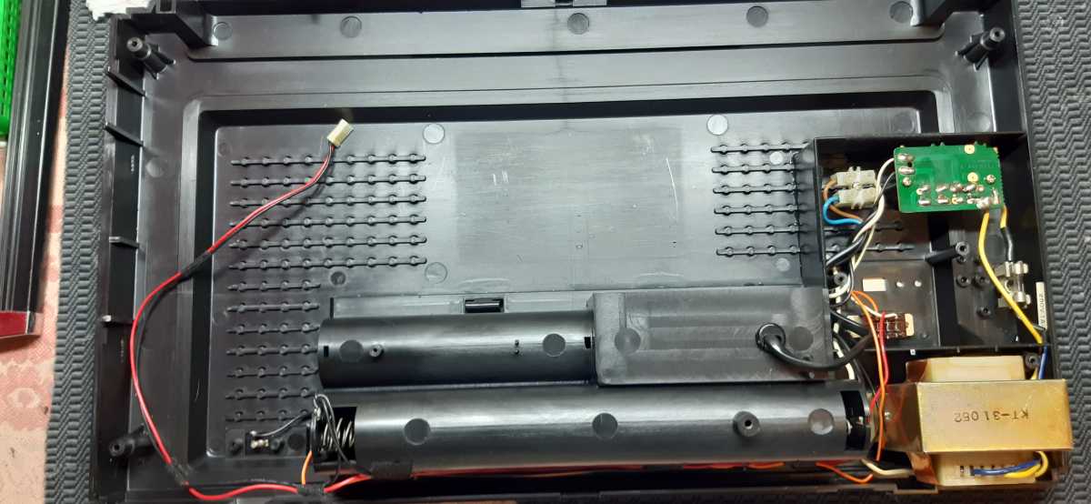 Бренд конечно известный, Японский, и очень серьёзный, но вот сам аппарат уже изготовлен не иначе как в Тайване. Ну что же, настало время посмотреть что же там внутри этого аппарата. Сразу скажу, корпус конечно хиленький, но терпимо, бывало и хуже.Особенно когда её переносить, ручка ужасно скрипит, и аппарат заваливается на отну сторону, так как самая тяжёлая часть этой магнитолы, это трансформатор, и расположен он не по центре, а в левом верхнем углу. И по этому он просто делает перевес на одну сторону. Я уже подумал, может для равновесия приклеить внутри корпуса металлическую пластину. И так, под крышкой практически пусто. Да и сама крышка странных форм, с какими то не понятными углублениями, хотя нет, всё понятно, с обратной стороны этих углублений есть прорези, они поддерживают плату. Батарейный отсек, он тоже расположен в глубине крышки. Хотя всё понятно, производители просто пошли на хитрость, и сделали такой огромный корпус с небольшой экономией. Сейчас немного отвлекусь от этой магнитолки, и переметнусь к другой, очень именитой, тоже огромной, с динамиками 20 см, тоже красивой, но по звучанию, так себе.Я к чему, что и благородные аппараты, бывают пустые, как барабан. Думаю многие узнали, эту магнитолу. Вернусь к сегодняшней магнитоле. Динамики 20 см, просто белоснежные, пьезо пищалки, от коих толку ноль. Но всё равно, скажу Вам честно, звучание магнитолы мне понравилось, даже очень.По крайней мере с радио она поёт просто замечательно. Отделка динамиков очень похожа как у Sharp GF 9000. Вч установлены в хромированных рупорах. Что не понравилось в этой магнитоле, так это настройка радио на частоту. Требует особой смекалки, так как верньерный механизм там уж очень упрощён, и малейшее движение ручки, и всё станция улетела, а стрелка сдвинулась на пол сантиметра. Плата радио.На КПЕ пластиковый квадратик, куда вставляется ручка настройки вместе со стрелкой. Плата пиковых индикаторов, они работают в разброс, очень красиво, и что не мало важно, они не привязаны к уровню звука, как в многих магнитолах. УНЧ на двух микросхемах. Радиаторы приличных размеров, дюралевые, на не кусок оцинковки. Пяти полосный эквалайзер, с огромными хромированными ползунками. Ну а теперь ЛПМ. Магнитола двух кассетная. Одна дека, верхняя, по принципу авто магнитолы. Кассета вставляется боком.На ней можно только прослушать кассету и перемотать в одну сторону. Вторая дека полноценная, с записью и перемотками. Встречается в добром десятке магнитол. На полноценной стирающей головке, с экономили. Крышка кассеты второй деки с добротным лотком для кассеты, и не с хиленькими пружинками. Пришлось залезть в закрома, и поменять пружинку на кнопку стоп и пауза. Старая почему то напрочь со ржавела и развалилась. Также поработал с антеннами. Практически все магнитолы приезжают с дефектом антенн, а если их ещё и две, то совсем беда.Но у меня всё получилось. А вот и самая тяжёлая деталь магнитолы. Довольно добротный и увесистый блок питания. И зачем они его сверху поставили. И ещё не понятная контактная группа, которая нажимается самой насадкой на переключатель сети. Ну и осталось на последок сказать пару слов о внешности магнитолы. Хотя я уже писал выше, что магнитола огромная, с изобилием хрома и разноцветных надписей и полосочек.Звучание очень даже не плохое. Не верите, конечно, каждому своё, и