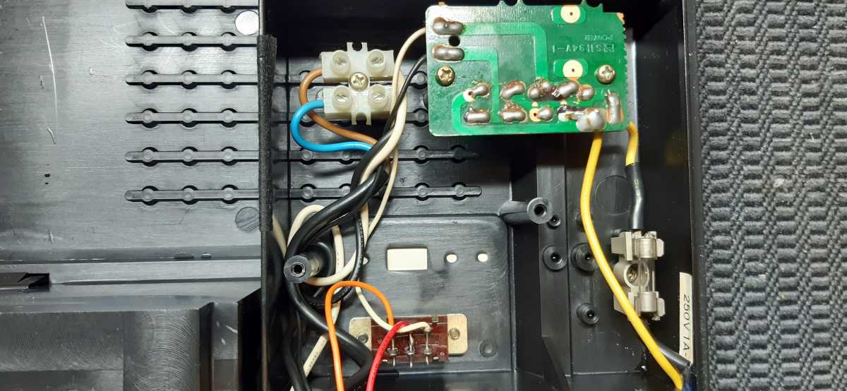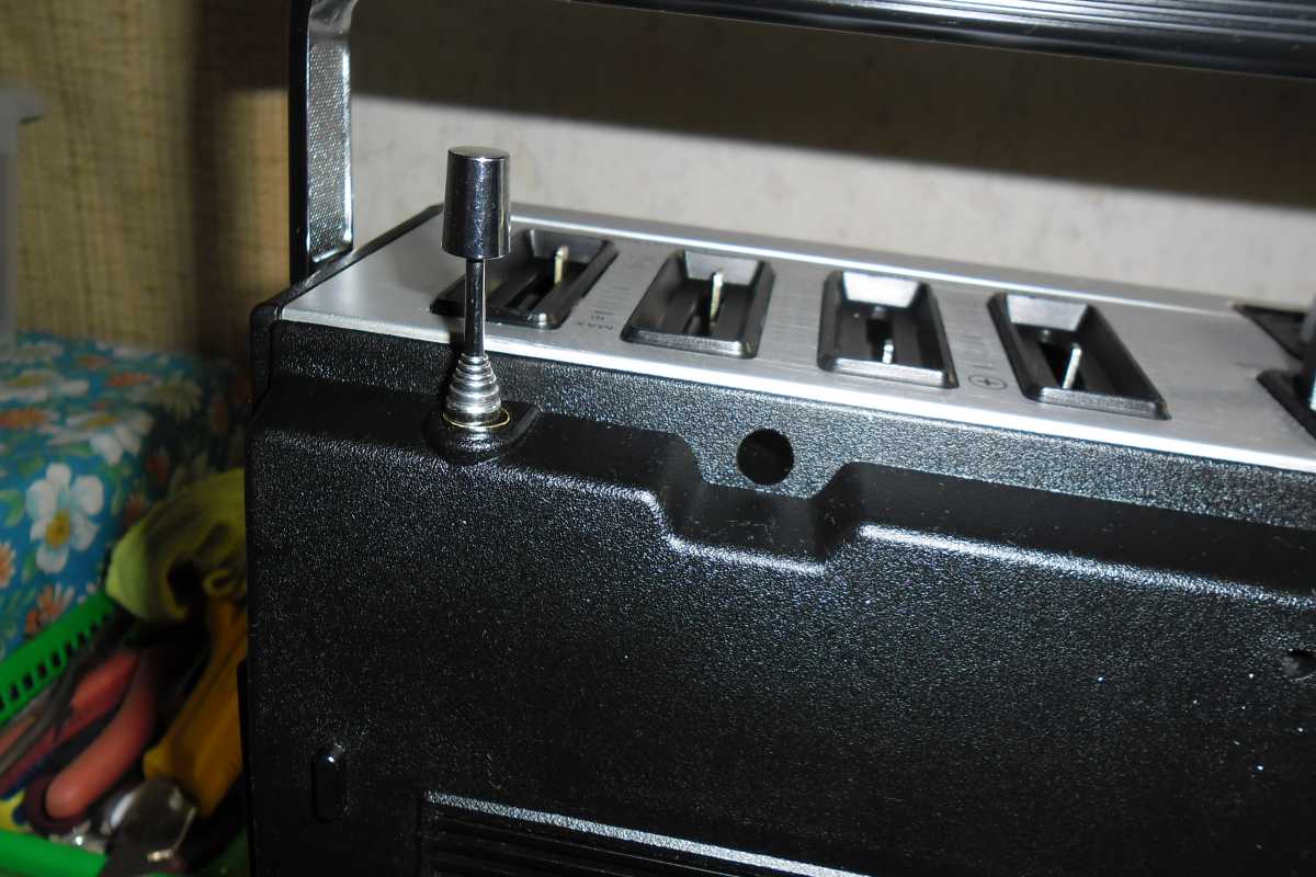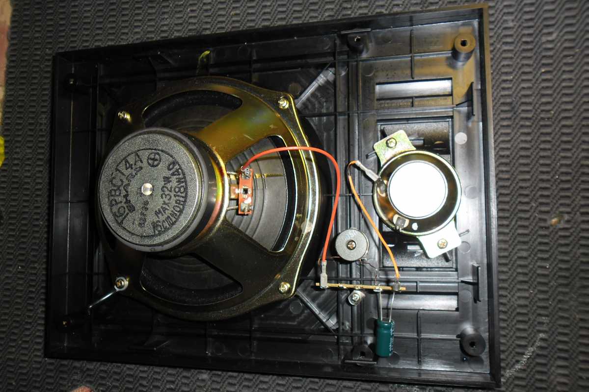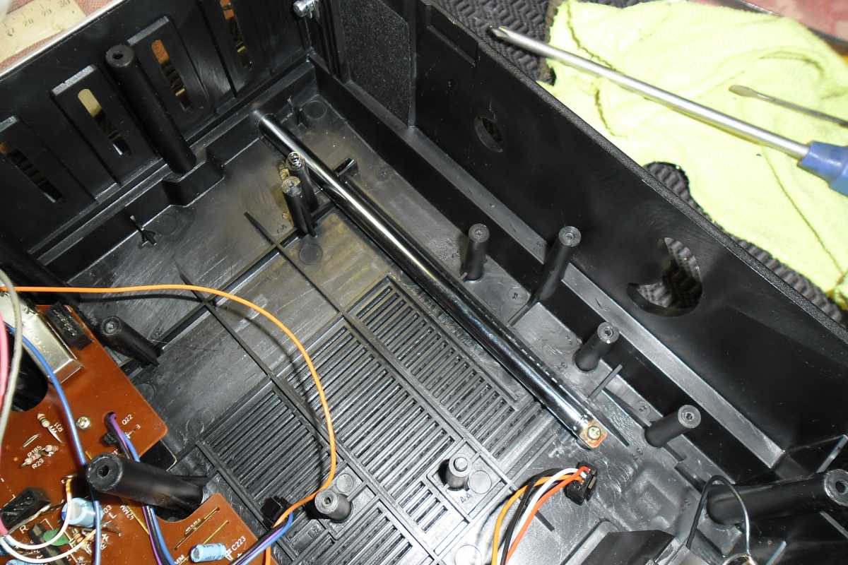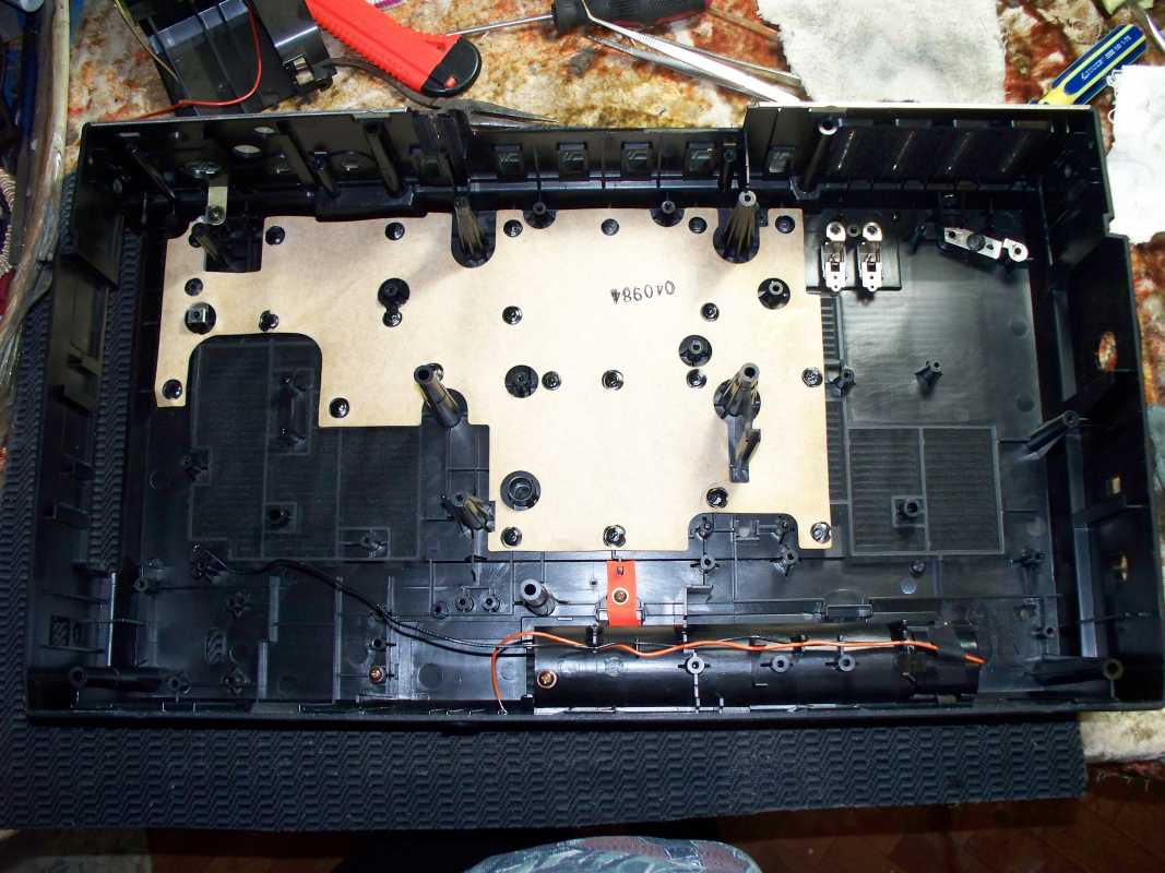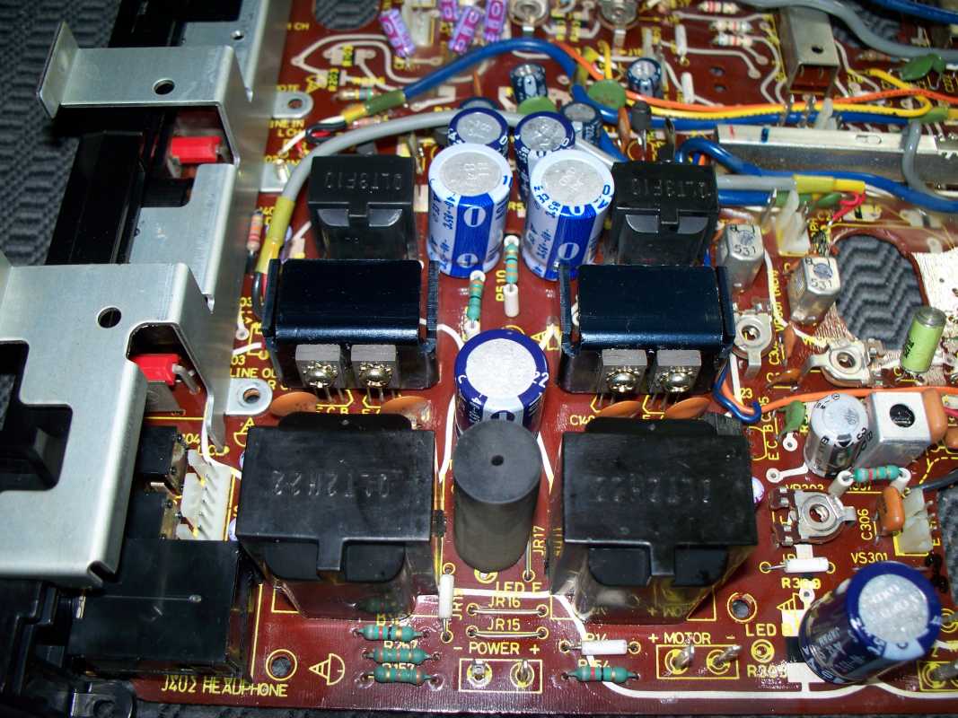 Бренд конечно известный, Японский, и очень серьёзный, но вот сам аппарат уже изготовлен не иначе как в Тайване. Ну что же, настало время посмотреть что же там внутри этого аппарата. Сразу скажу, корпус конечно хиленький, но терпимо, бывало и хуже.Особенно когда её переносить, ручка ужасно скрипит, и аппарат заваливается на отну сторону, так как самая тяжёлая часть этой магнитолы, это трансформатор, и расположен он не по центре, а в левом верхнем углу. И по этому он просто делает перевес на одну сторону. Я уже подумал, может для равновесия приклеить внутри корпуса металлическую пластину. И так, под крышкой практически пусто. Да и сама крышка странных форм, с какими то не понятными углублениями, хотя нет, всё понятно, с обратной стороны этих углублений есть прорези, они поддерживают плату. Батарейный отсек, он тоже расположен в глубине крышки. Хотя всё понятно, производители просто пошли на хитрость, и сделали такой огромный корпус с небольшой экономией. Сейчас немного отвлекусь от этой магнитолки, и переметнусь к другой, очень именитой, тоже огромной, с динамиками 20 см, тоже красивой, но по звучанию, так себе.Я к чему, что и благородные аппараты, бывают пустые, как барабан. Думаю многие узнали, эту магнитолу. Вернусь к сегодняшней магнитоле. Динамики 20 см, просто белоснежные, пьезо пищалки, от коих толку ноль. Но всё равно, скажу Вам честно, звучание магнитолы мне понравилось, даже очень.По крайней мере с радио она поёт просто замечательно. Отделка динамиков очень похожа как у Sharp GF 9000. Вч установлены в хромированных рупорах. Что не понравилось в этой магнитоле, так это настройка радио на частоту. Требует особой смекалки, так как верньерный механизм там уж очень упрощён, и малейшее движение ручки, и всё станция улетела, а стрелка сдвинулась на пол сантиметра. Плата радио.На КПЕ пластиковый квадратик, куда вставляется ручка настройки вместе со стрелкой. Плата пиковых индикаторов, они работают в разброс, очень красиво, и что не мало важно, они не привязаны к уровню звука, как в многих магнитолах. УНЧ на двух микросхемах. Радиаторы приличных размеров, дюралевые, на не кусок оцинковки. Пяти полосный эквалайзер, с огромными хромированными ползунками. Ну а теперь ЛПМ. Магнитола двух кассетная. Одна дека, верхняя, по принципу авто магнитолы. Кассета вставляется боком.На ней можно только прослушать кассету и перемотать в одну сторону. Вторая дека полноценная, с записью и перемотками. Встречается в добром десятке магнитол. На полноценной стирающей головке, с экономили. Крышка кассеты второй деки с добротным лотком для кассеты, и не с хиленькими пружинками. Пришлось залезть в закрома, и поменять пружинку на кнопку стоп и пауза. Старая почему то напрочь со ржавела и развалилась. Также поработал с антеннами. Практически все магнитолы приезжают с дефектом антенн, а если их ещё и две, то совсем беда.Но у меня всё получилось. А вот и самая тяжёлая деталь магнитолы. Довольно добротный и увесистый блок питания. И зачем они его сверху поставили. И ещё не понятная контактная группа, которая нажимается самой насадкой на переключатель сети. Ну и осталось на последок сказать пару слов о внешности магнитолы. Хотя я уже писал выше, что магнитола огромная, с изобилием хрома и разноцветных надписей и полосочек.Звучание очень даже не плохое. Не верите, конечно, каждому своё, и