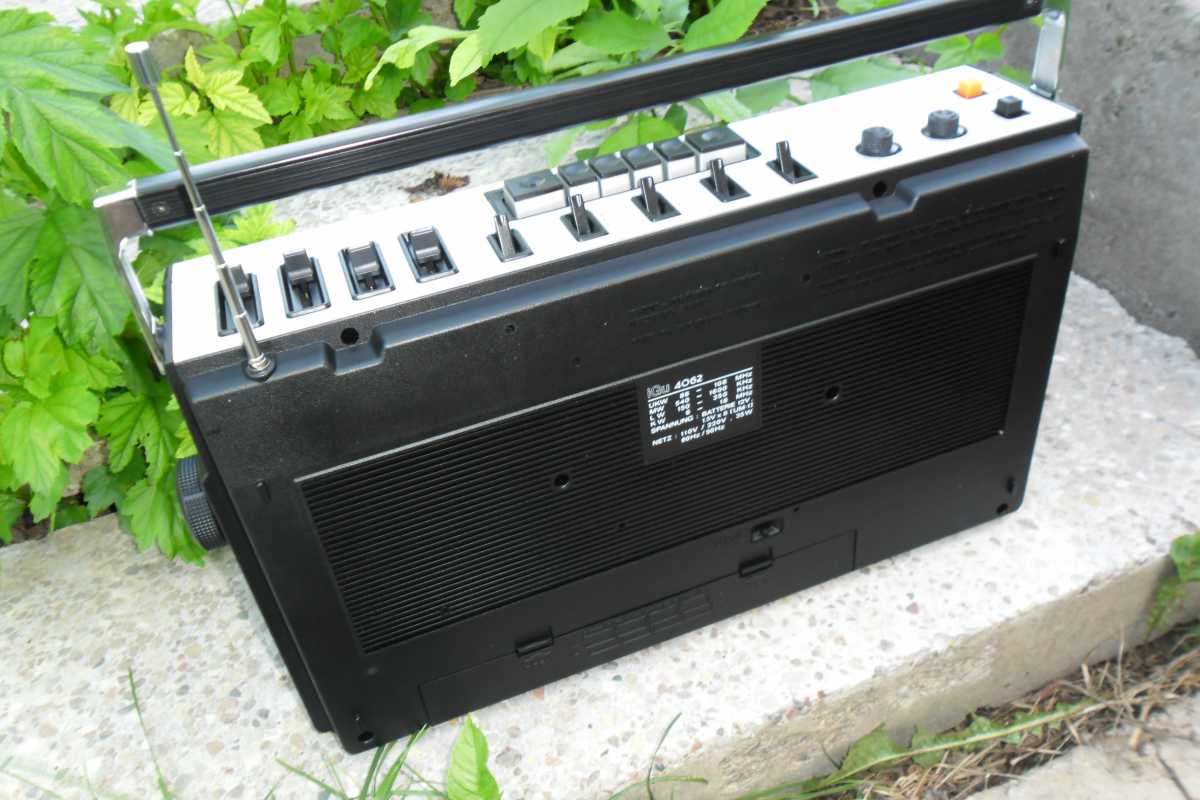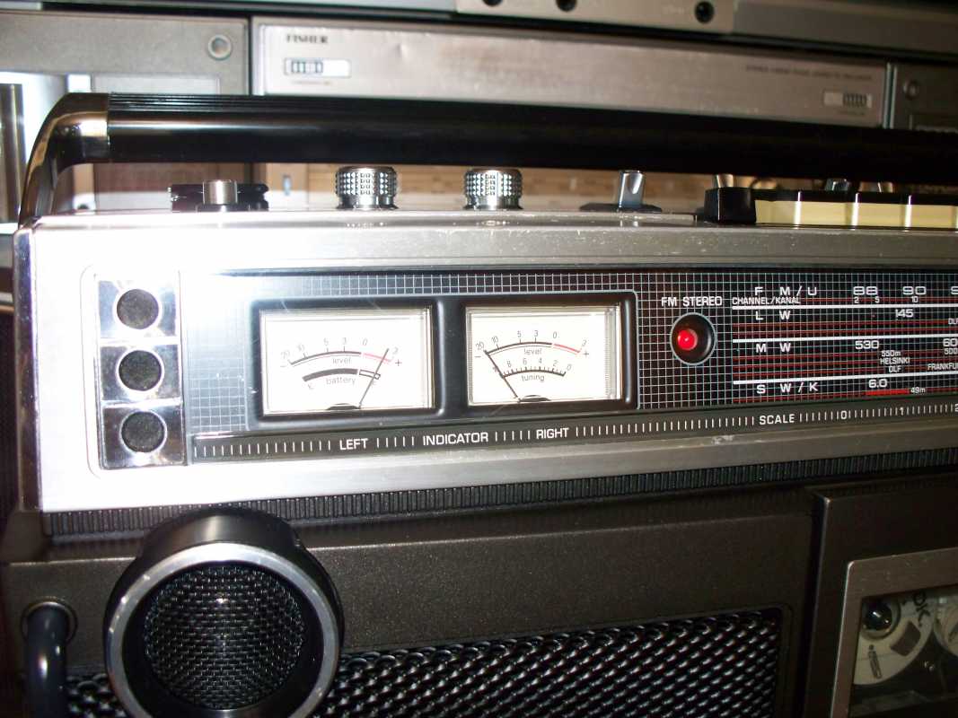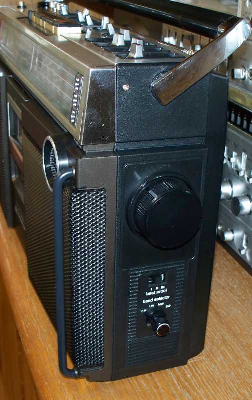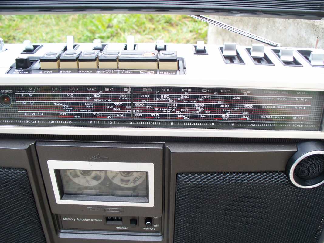 Ещё каких то лет десять назад, я и не мог себе представить, что на свете существует такое количество магнитол, вернее производителей и брендов. Множество торговых марок, фирмы которые заказывали магнитолы под своим брендом, магнитолы для различных торговых каталогов, магнитолы клоны, которые штамповали Китайцы, и т.д. Особенно мне нравятся магнитолы сделанные для Немецких торговых каталогов. Как правило все они производились в Тайване, но при всём это, сделаны качественно и надёжно, ведь в большинстве своём они продавались в странах западной Европы. Как правило все эти магнитолы очень сильно смахивают на какую ни будь именитую марку. Вот и сегодня, хочу рассказать об одной такой магнитолке, сделанной для Германии. За основу взяли знаменитую модель фирмы Panasonic с индексом RS-4350 L. В следующем обзоре я расскажу об этой моделе. А пока только фото для сравнения. Ну да ладно, магнтола, о которой пойдёт речь сегодня, не менее красива и интересна. Очень оригинальное исполнение, стиль конца 70х. Смотришь на её, и пак хочется на жать кнопочку, и слушать хорошую музыку, а эти стрелочные индикаторы, они просто завораживают. И так. Магнитолка конечно же красавица, но что бы она радовала глаз и слух, её нужно развинтить, помыть, смазать, устранить неполадки и т.д. Снимаем переднюю часть, и вся начинка остаётся в корпусе. Внутри две платы, проводов много, но не критично, встречаются разъёмы и пайка. Усилок на двух микросхемах, в качестве радиатора используется обычная металлическая пластина. Плата радио снимается отдельно, прав до вместе с верьерным механизмом. А вот стрелка с планкой крепится отдельно и соединяется с платой через специальный переходник. На планке шкалы, нет ни каких надписей, они все на корпусе, зато стрелка со светодиодом. Не раз речь пошла о радио, тогда нужно и о антенне пару слов написать. Она в данной магнитолке внутреннего расположения. Не часто такое встречается, но бывает, особенно такое расположение антенны присуще компании GRUNDIG. В левом верхнем углу расположились стрелочные индикаторы, правдо они не очень больших размеров, но глаз радуют. Над стрелочниками информационные диоды. В зависимости от выбранной функции, загорается соответствующий диод. ЛПМ у магнитоки сплошной метал, как и положено, в те времена не умели экономить, а старалась делать надёжно. Всего один плоский пассик, перемотки и подмотка плёнки, в при помощи прижимного ролика. И ещё что порадовало, головки и подключение контактов и моторчика, всё на разъёмах. Так же ЛПМ оборудован автостопом и счётчиком ленты. Правда авто стоп не полный, а обычный рычажок, который срабатывает от натяжения ленты, когда заканчивается кассета. Акустика, как и положено хорошей магнитолке, двух полосная. О чём гласит гордая надпись на борту. С правильными Вч динамиками, правда они всего 3 см, а вот Вч всего 14 см. Всё производства Тайвань, от довольно известной фирмы FOSTER, встречаются довольно часто. Блок питания скромных размеров. Предохранитель не на плате, как у большинства магнитол, а в специальной капсуле. Ну, что же, вот пришло время и поговорить о внешности магнитолы. Наверное начну с разъёмов. Они как и положено магнитоле для рынка Германии, не тюльпаны, а обычные штырьковые, как и в Советских аппаратах. Магнитола даже имеет встроенный фоно корректор. Магнитола имеет строгий дизайн, где