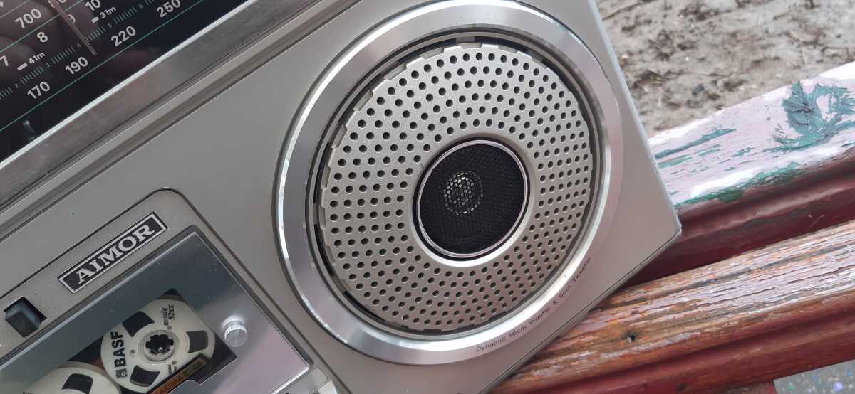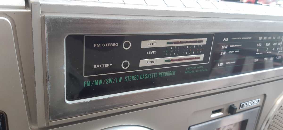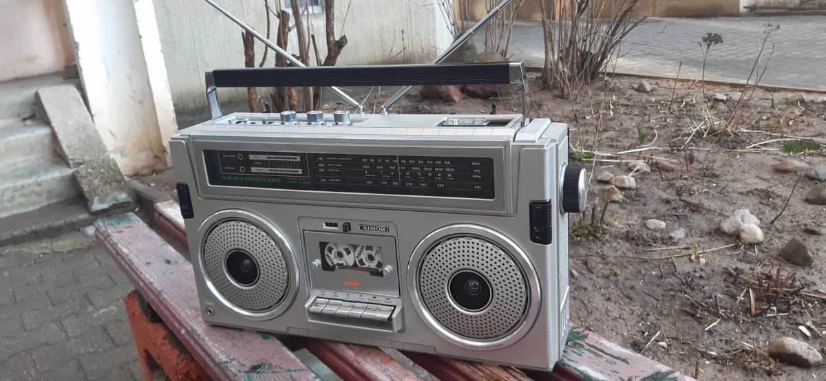 И вот сегодня, глядя на серость за окном, на улицу идти не охота, решил чиркануть пару слов. Сегодня речь пойдет о довольно редкой магнитолке, в принципе как и сама фирма, что их производила, не у всех на устах. Наш коллега Олег Карцев уже писал об этой магнитолке в другом разделе, но я ещё и покажу что находится внутри. фирма AIMOR, это не Шарп, они не имели огромную линейку аппаратуру, но вся аппаратура сделана добротно и с шармом. Я едва ли насчитаю дитятку моделей, которые встречал под этим брендом. И так сегодня речь пойдет об отличной магнитолке AIMOR ST-804F. Как обычно магнитола попала ко мне в плочевном и полу рабочем состоянии. Пришлось даже некоторые элементы изготовить самостоятельно, но всё получилось нормально. На сколько я знаю, магнитола сейчас прописана в загородном доме, и очень нравится своему новому хозяину. Шикарная магнитола, очень не обычный дизайн.Сделана очень качественно, но есть и свои болячки, о них я расскажу позже. сняв заднюю крышку, понимаешь, что в конце 80х, любили работать паяльником. Хотя, это не ко всем относится. два разъёма на всь аппарат, они для головок. остальное пайка. две платы спрятались внутри аппарата. Основная, на которой всё завязано. Усилок на двух микросхемах. По каждой на канал. И плата радио. К слову, радио было перестроено под УКВ, хорошо, что путём подпайки кондёров нужной емкости, в нужное место. А то я встречал, когда было переделано пол платы. здесь всё просто отпаял кондеры, немного подстроил, и всё прекрасто заработало в диапазоне 88-108 Mhz FM. Вся внутренняя начинка легко извлекается на каркасе из корпуса, это конечно не ново, многие это используют. А вот ЛПМ остаётся на передней части магнитолы, это не прадиционно. Такое встречал на магнитолах марки SILVER. ЛПМ достаточно надёжен, сплошной метал, всего один плоский пассик, ну и ещё один на счётчик ленты. Достаточно интересный демпферный механизм. С таким устройством подкассетник открывается очень плавно. Своеобразно реализована функция записи. Рычаг не нажимает на длинный переключатель, я его называю солдатом, а на переключатель, который прикручен к лпм. Хотя сам солдат на плате есть. Ну а теперь о маленькой проблеме связанной с ЛПМ. Это клавиши. Толи от старости, толи конструкция и их такая не надёжная, но у их обламывается часть которая заходит в ЛПМ. Пришлось конечно повозится. Но потом, через некоторое время, мне звонил новый хозяин, и сказал, что всё таки, одна из клавиш обломалась. Динамики на данном аппарате 16 см. Довольно известной фирмы. Вч правильные, бумажные. Той же фирмы, но не с совсем обычным расположением на магнитоле. Ну и общий вид акустики. Что ж ещё интересное. Вспомнил. На задней крышке расположен отсек питания,и именно отсек. Здесь всё по взрослому. Мульти вольтажный транс, предохранитель, переключатель напряжения. Шнур здесь не съёмный, и прячется в отсек.Соединён клеммами с блоком питания. Вот кажется и всё по начинке. Сейчас о внешности.Как я уже и говорил, магнитолка не совсем обычная, всё в лучших традициях 70х. Хром, алюминий, всё четки, и на своих местах. Чего только стоят двух цветные индикаторы. Прав до работают от звука. ВСё управление расположено сверху, ручки и переключатели под хромом. Необычной формы переключатель диапазонов. По обе стороны магнитолы, рядом с микрофонами, светодиоды, если подкинуть звука, они начинают мигать, т