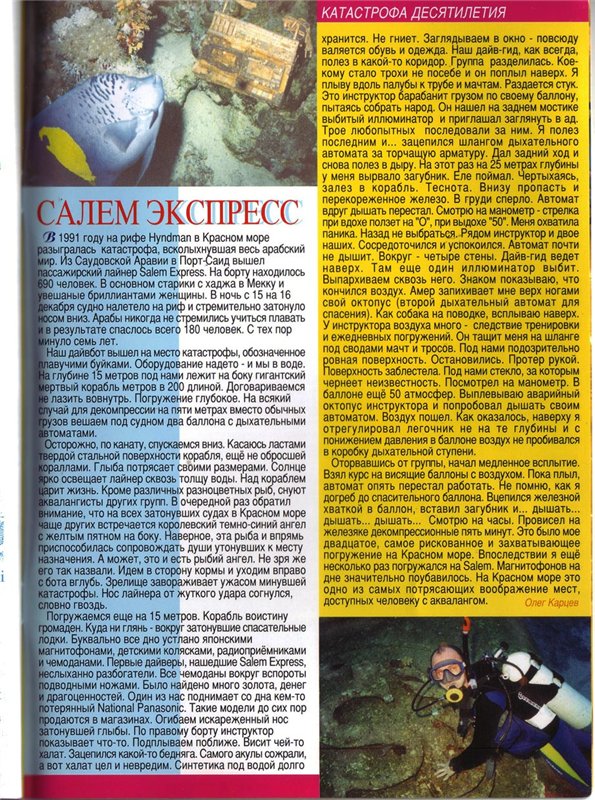 В свое время в 1999 году вышла моя первая книга, дайватлас Египта, "Красное Море от А до Я", где я полностью описал одно из первых погружений на "Салем экспресс". Книжка разлетелась тиражом в пару тысяч экземпляров в первые же два года и сохранилось всего несколько экземпляров. Одну из страничек с подробным описанием истории я решил выложить на этом сайте...